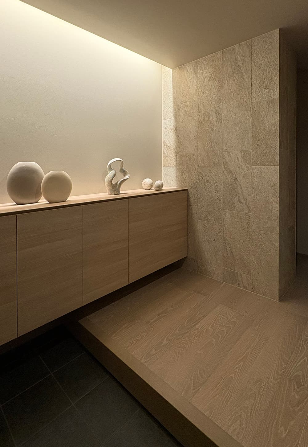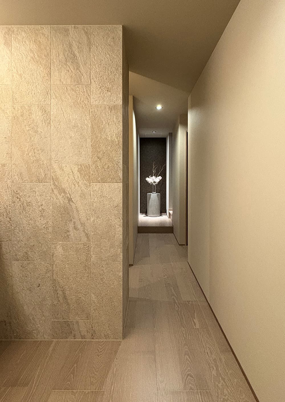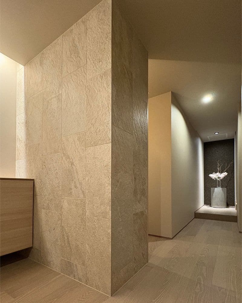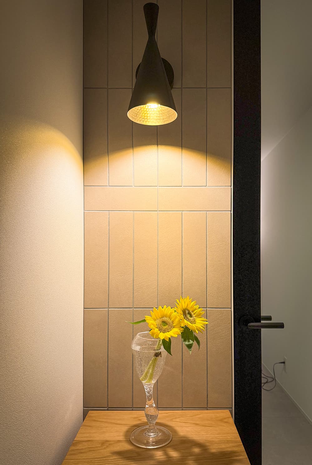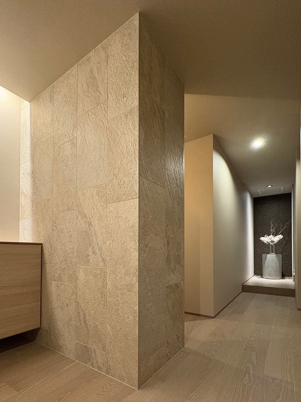 重厚感のある縦張りの「カバラストン」が、凛とした“たたずまい”で訪れる人をやさしく迎え入れます。柔らかな間接照明がタイルに温かな陰影を添え、空間の格調を一層引き立てています。