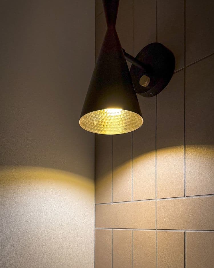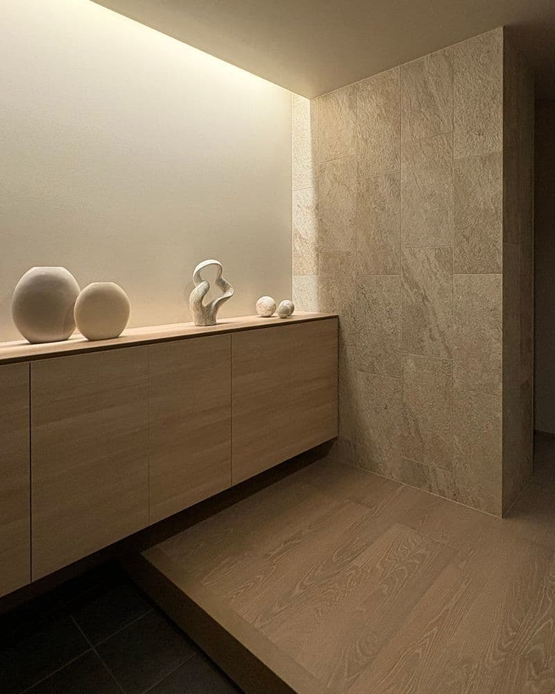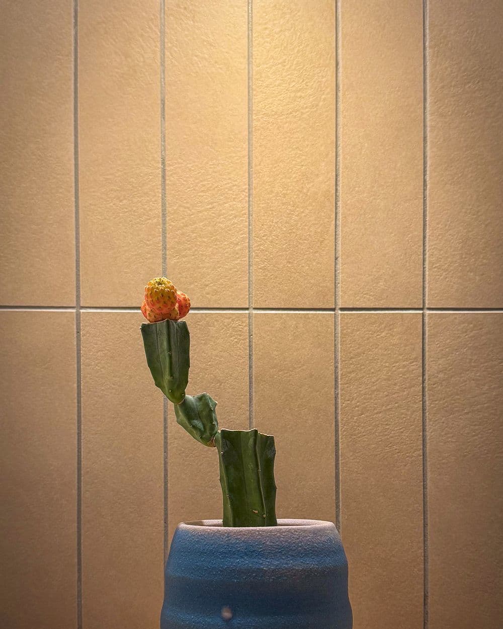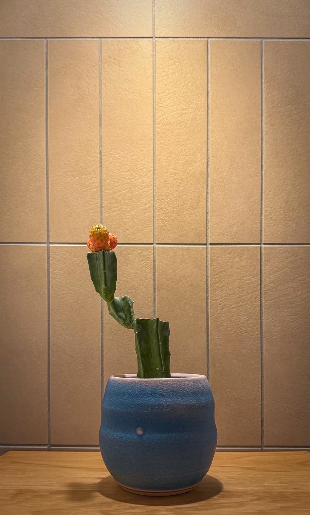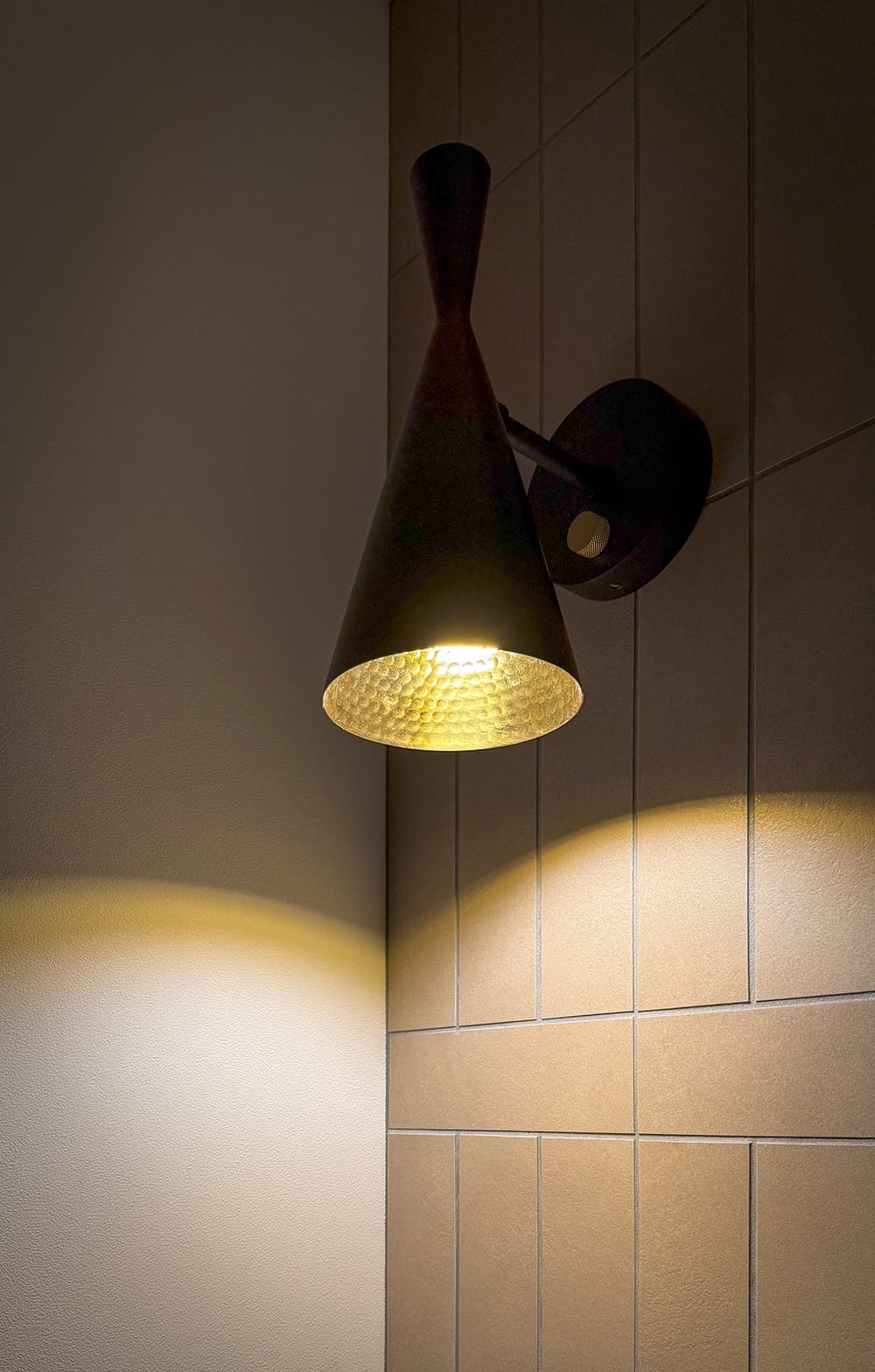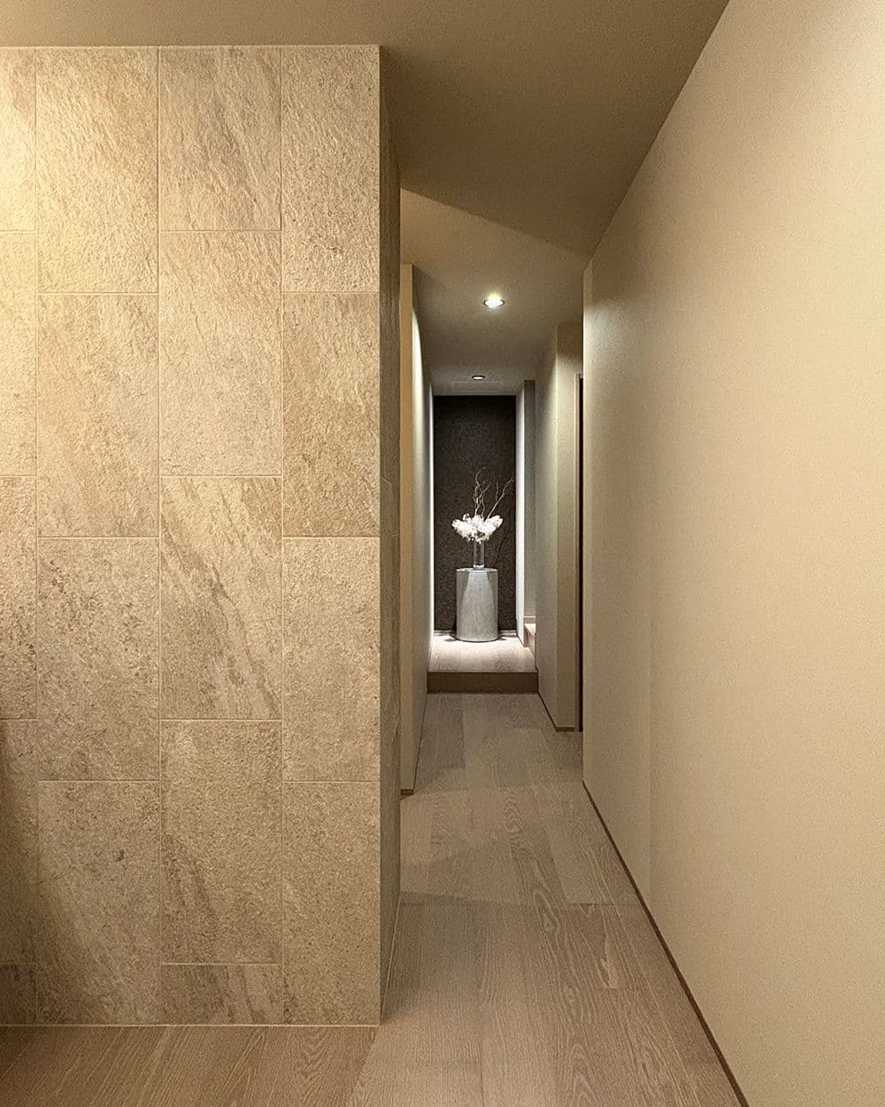 重厚感のある縦張りの「カバラストン」が、凛とした“たたずまい”で訪れる人をやさしく迎え入れます。柔らかな間接照明がタイルに温かな陰影を添え、空間の格調を一層引き立てています。