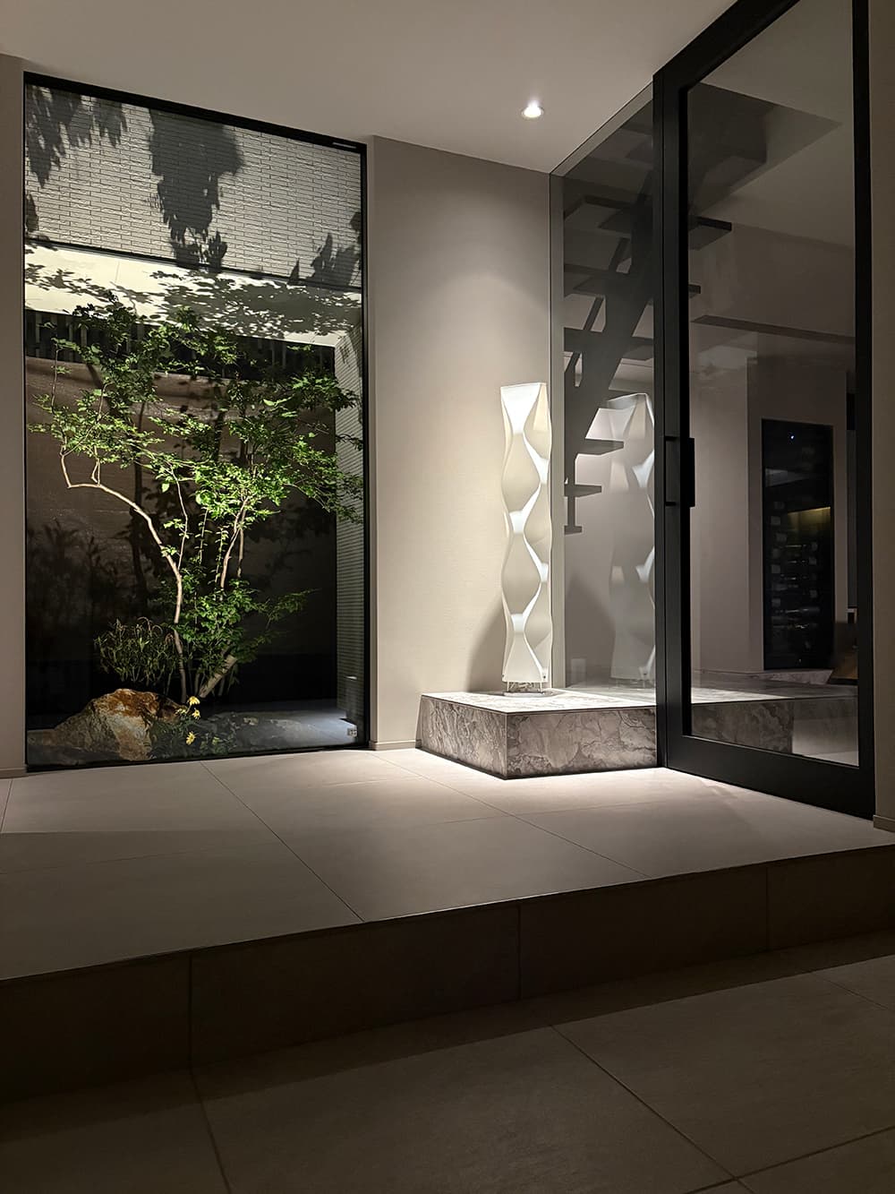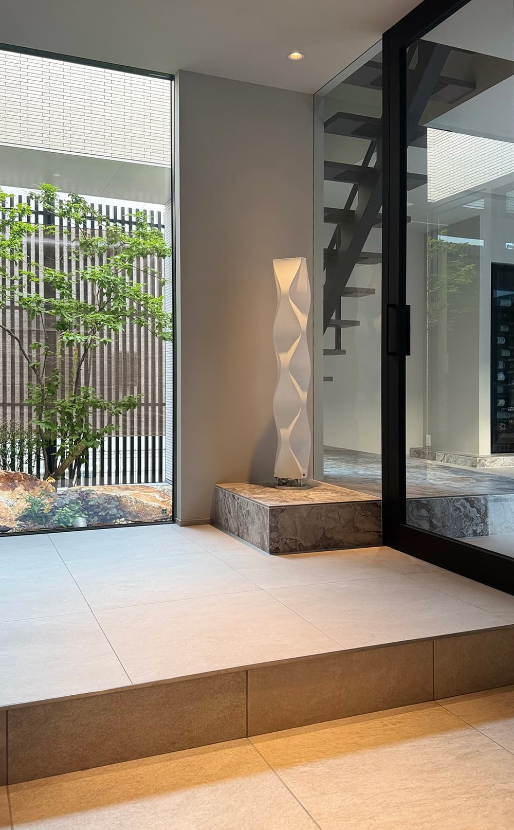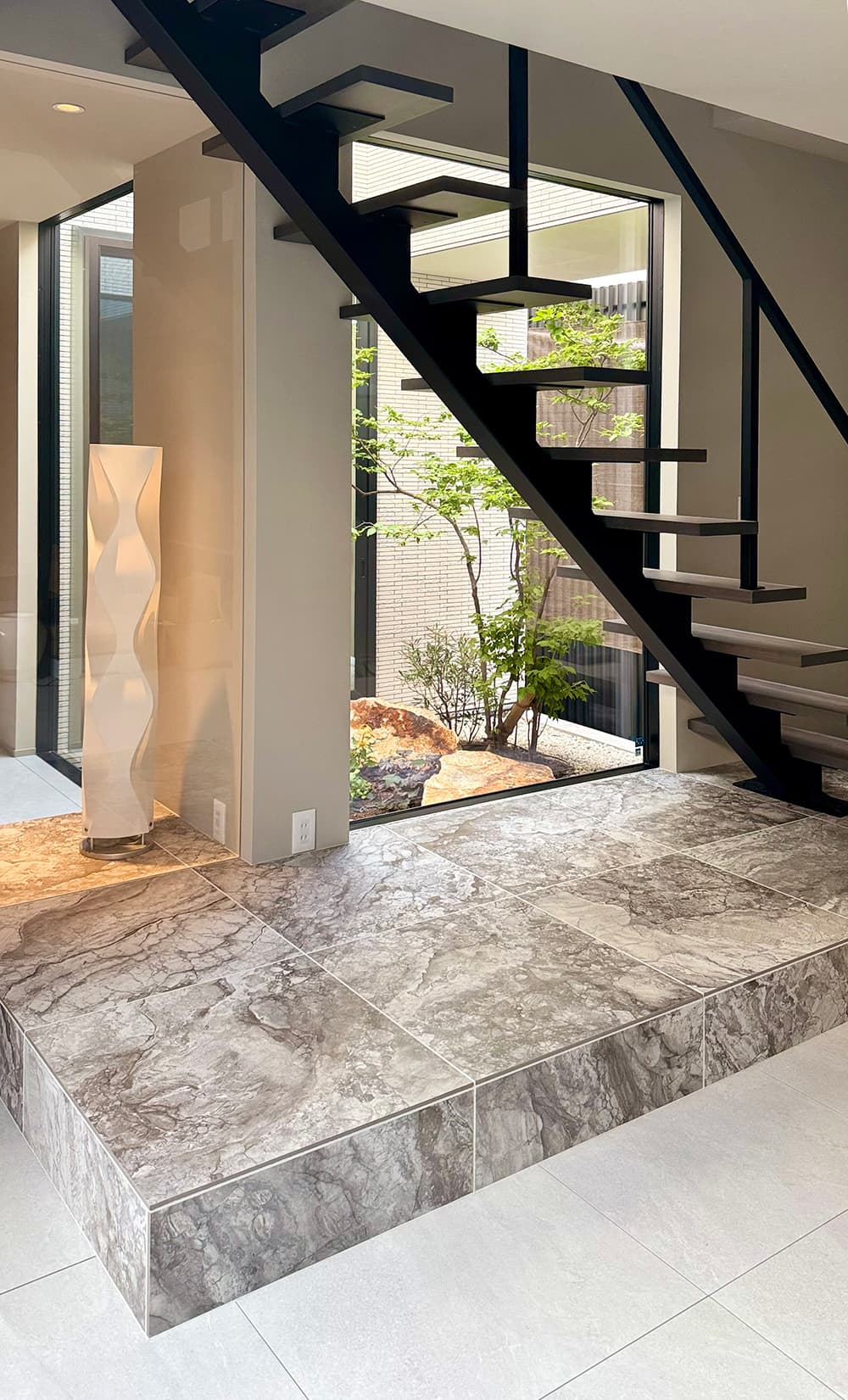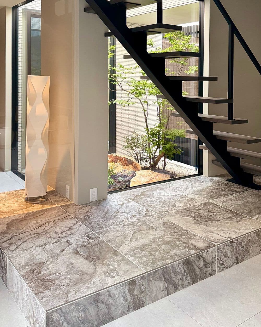 床上げに用いた「エンジェルハート」の存在感が光や植栽と響き合い、玄関に気品をもたらしています。大理石さながらの美しい石模様は昼夜で表情を変え、まさにタイルで魅せる“たたずまい”です。
