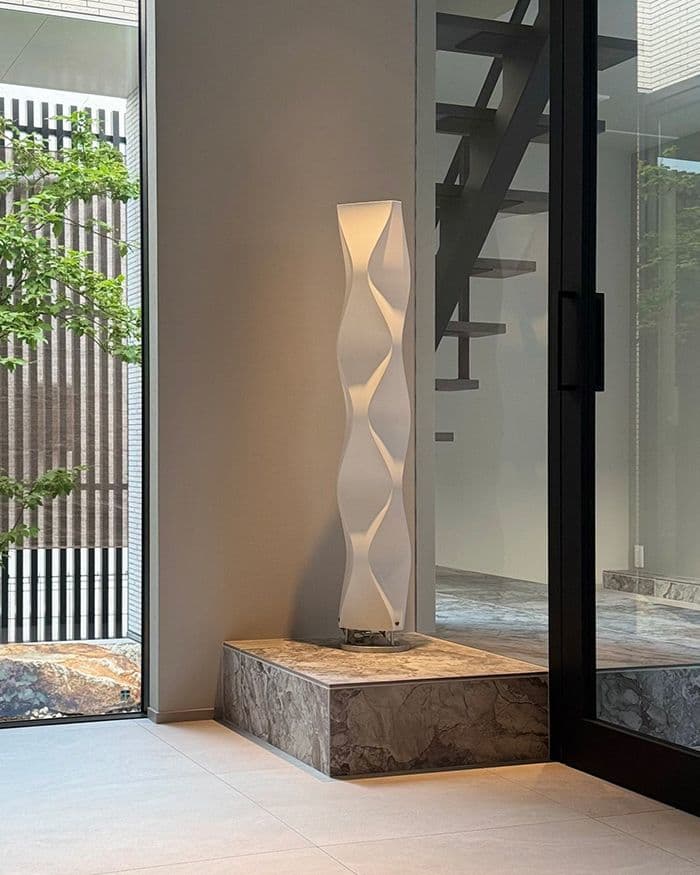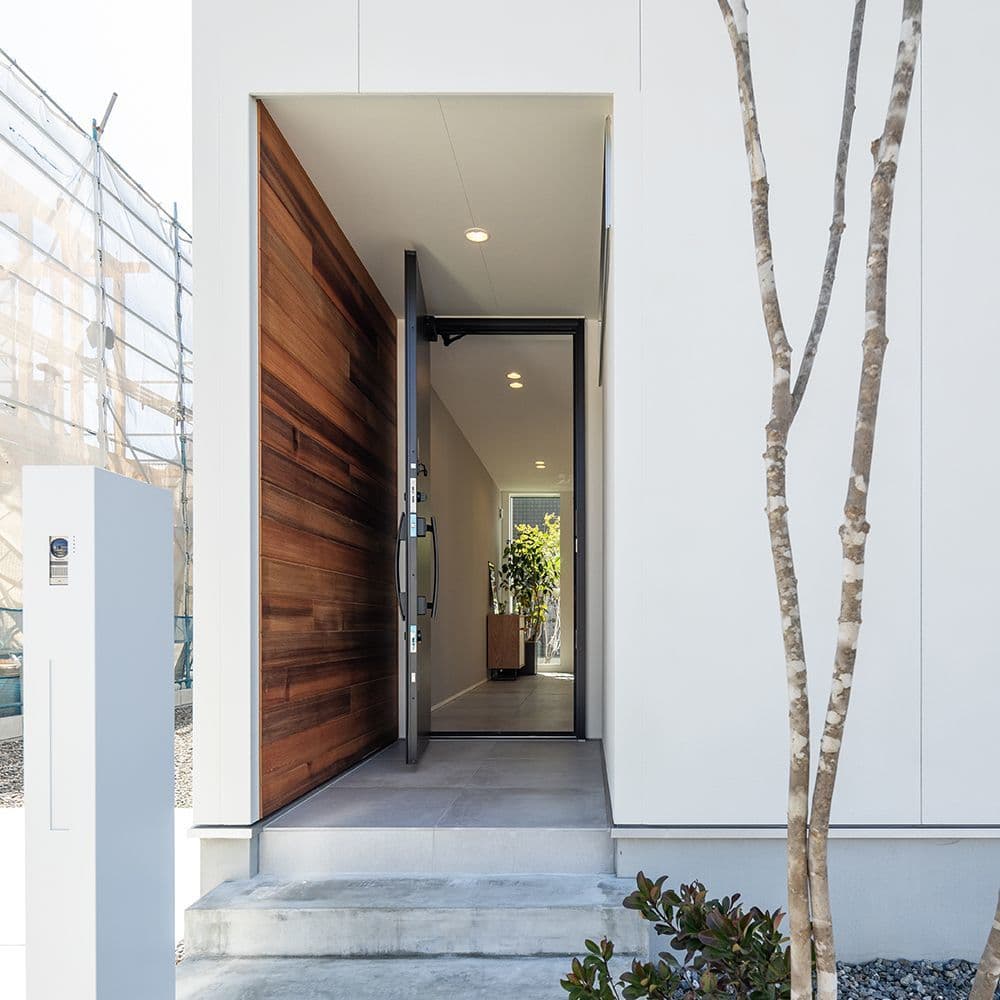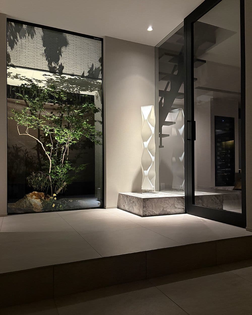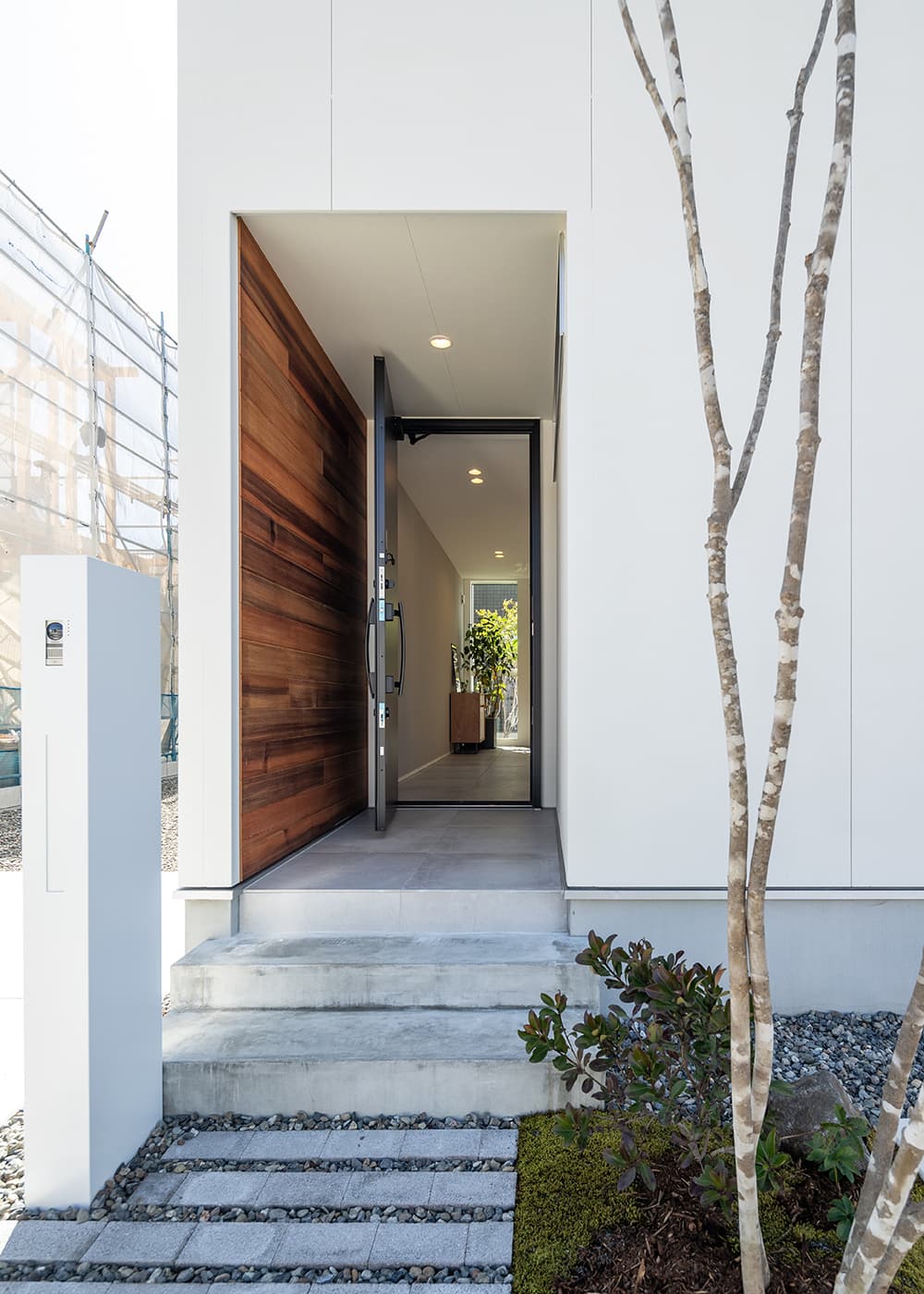 床上げに用いた「エンジェルハート」の存在感が光や植栽と響き合い、玄関に気品をもたらしています。大理石さながらの美しい石模様は昼夜で表情を変え、まさにタイルで魅せる“たたずまい”です。