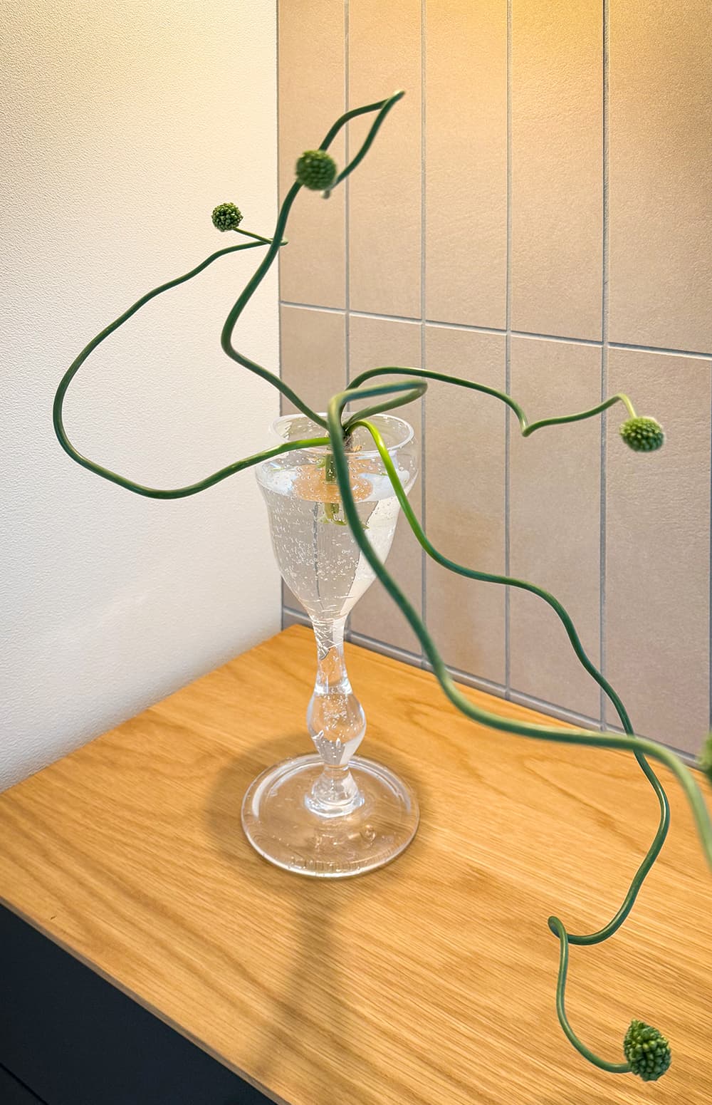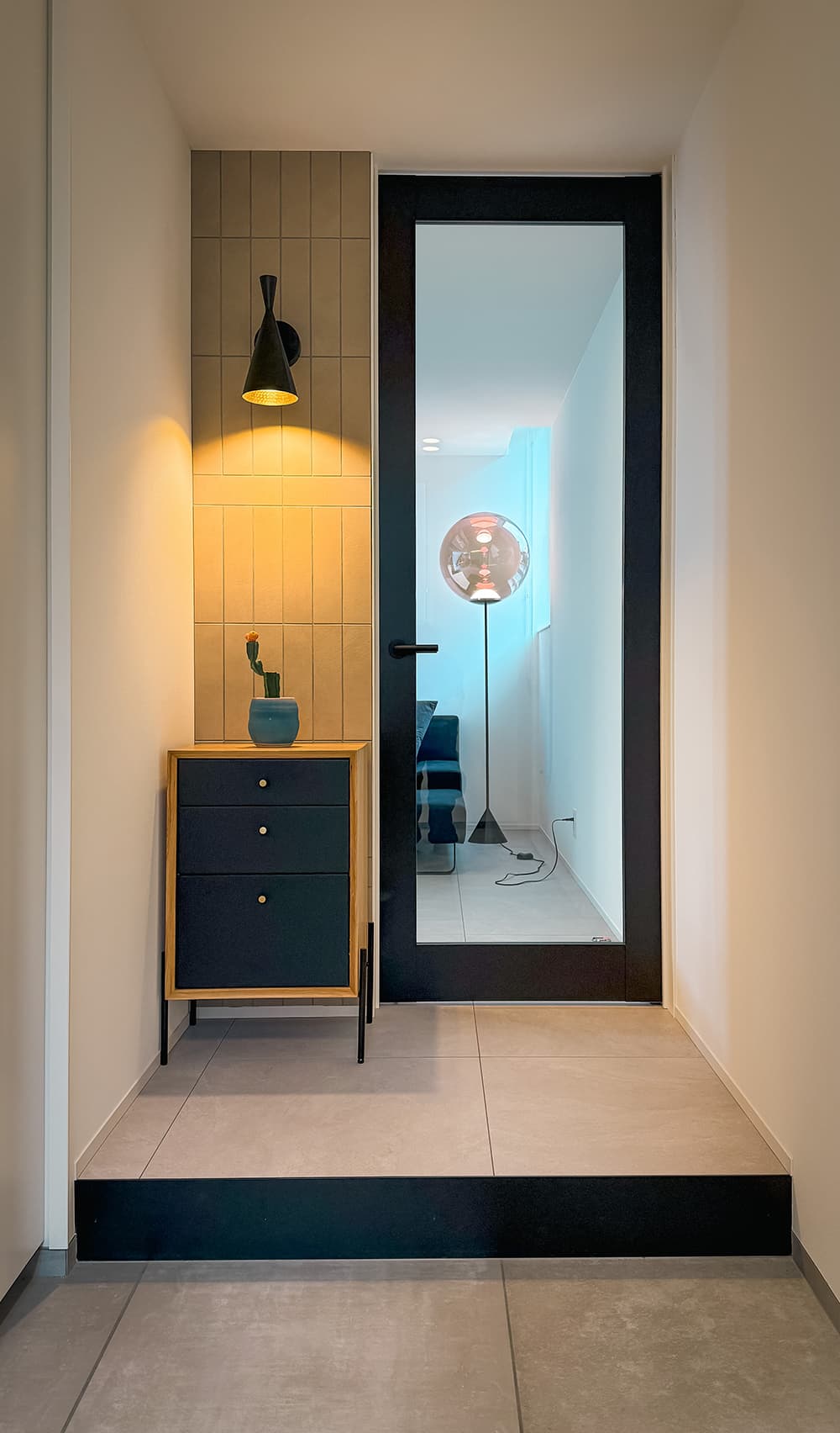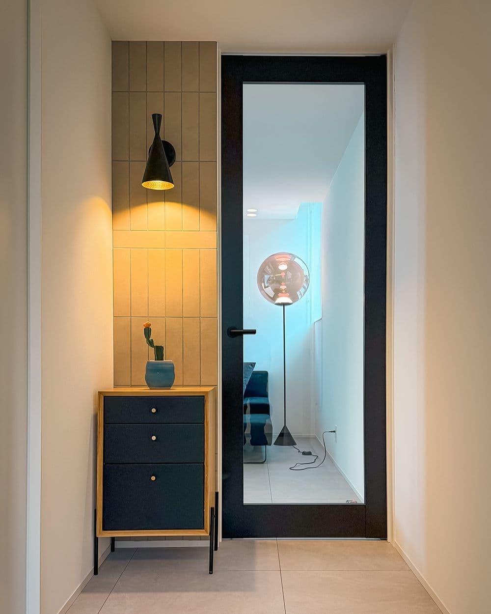 照明に映えるイエローの「クールレジン」が生み出す温もりに、花や小物の彩りが重なり、静かで上質な“たたずまい”を演出。季節に合わせて様々なコーディネートが楽しめそうな素敵な玄関です!