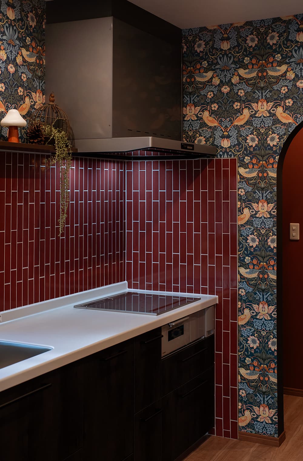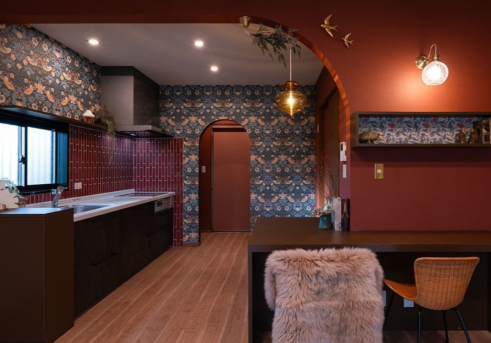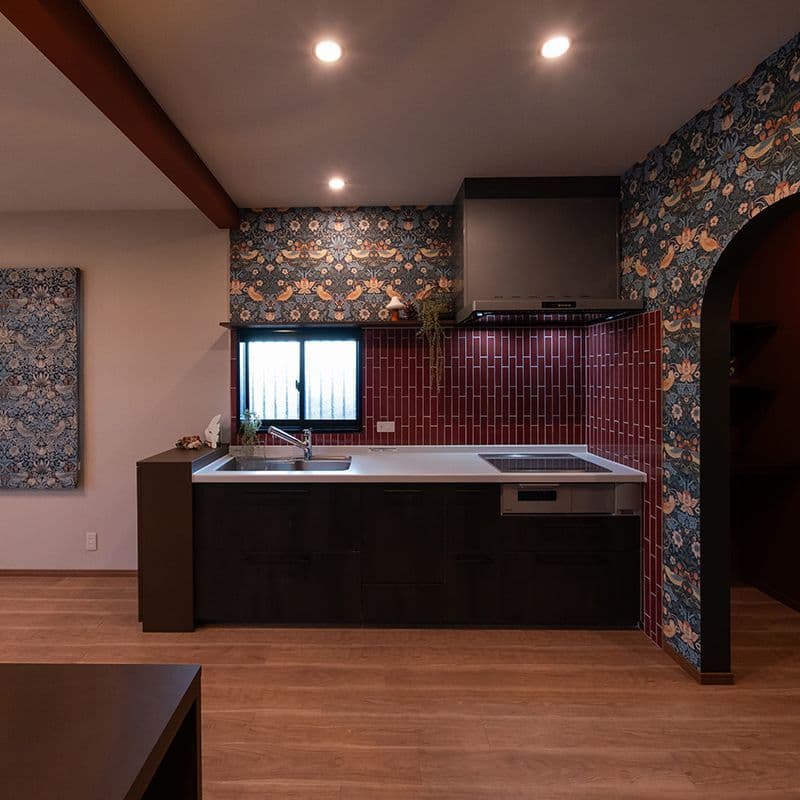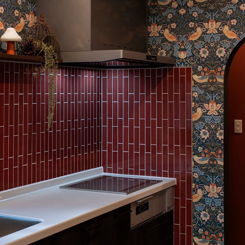 クリスマスを彩る深紅のキッチンは、艶やかな「コルマール」と華やかな壁紙が美しく調和しています。奥様のこだわりが詰まった唯一無二の空間からは、冬の光に包まれた心温まるおうち時間が鮮やかに伝わってくるようです。