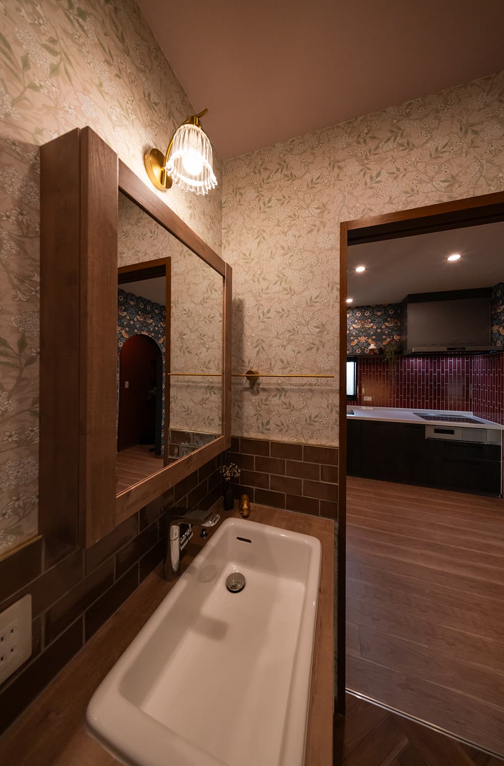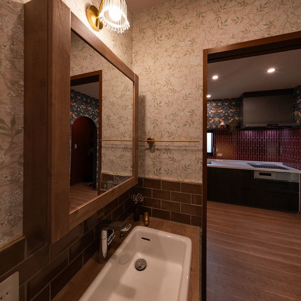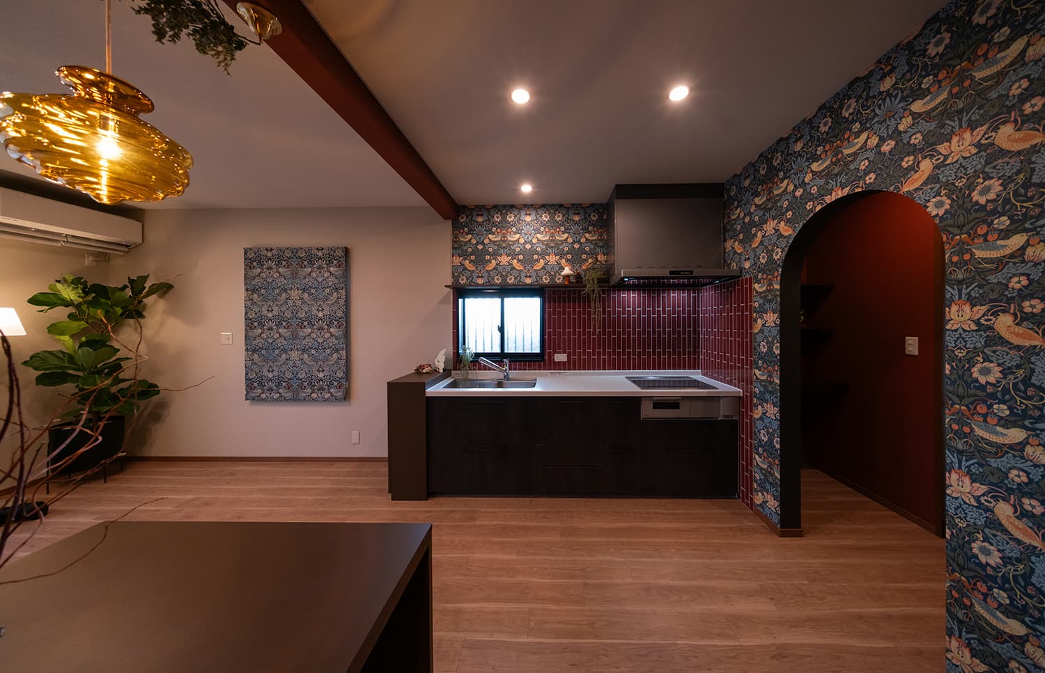 クリスマスを彩る深紅のキッチンは、艶やかな「コルマール」と華やかな壁紙が美しく調和しています。奥様のこだわりが詰まった唯一無二の空間からは、冬の光に包まれた心温まるおうち時間が鮮やかに伝わってくるようです。