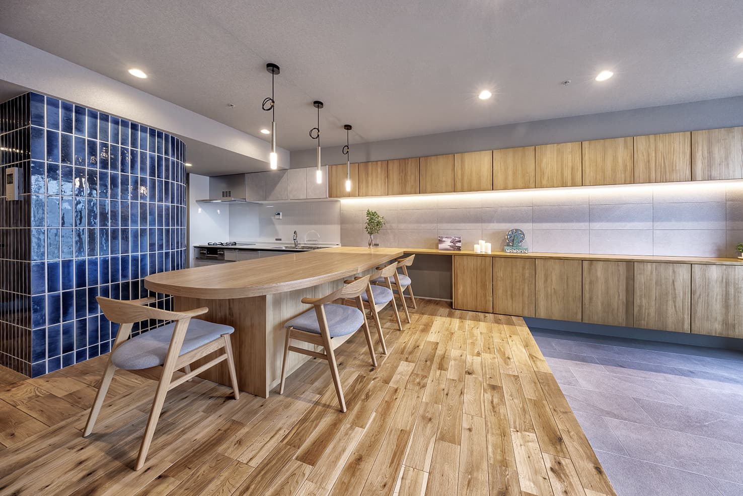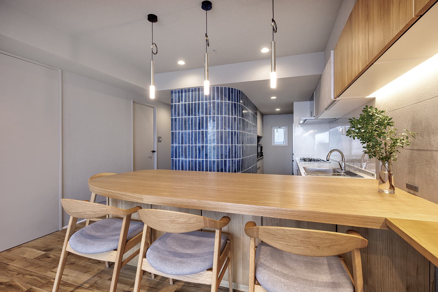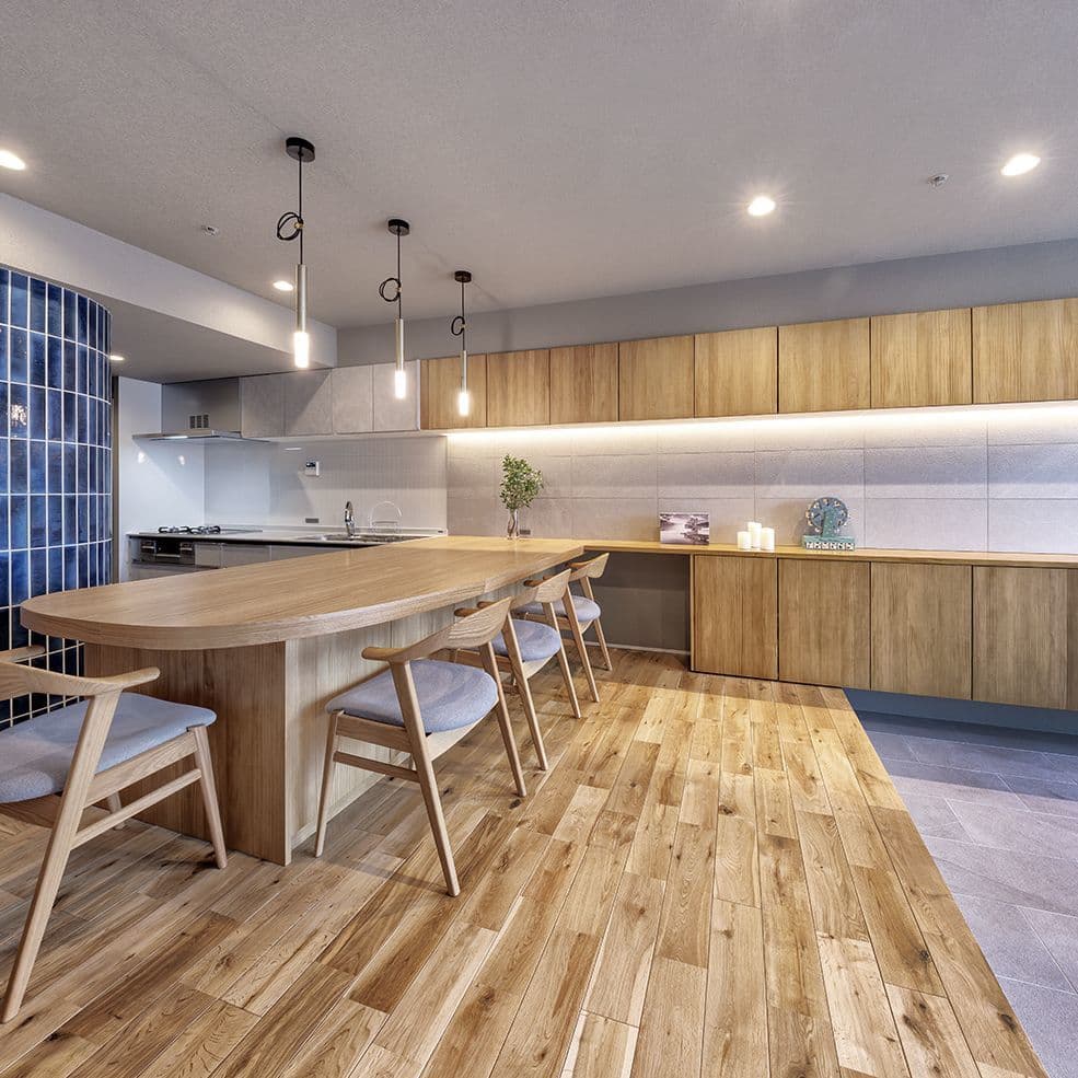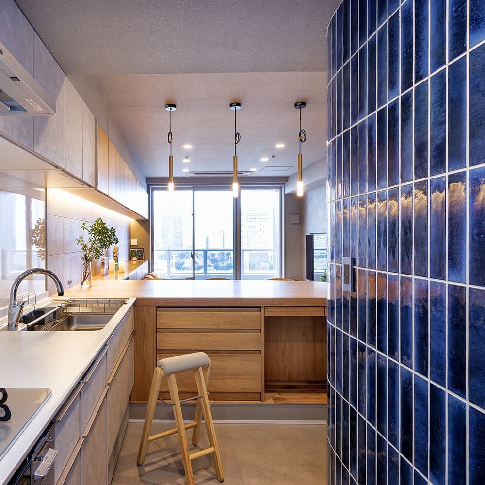 木材を基調とした落ち着いた空間の中で、大黒柱のように存在感を放つ鮮やかなブルーの「クロジョーロ」が一際目を惹きます。異素材が美しく響き合う空間に、細部にわたる深いこだわりを感じる作品です。