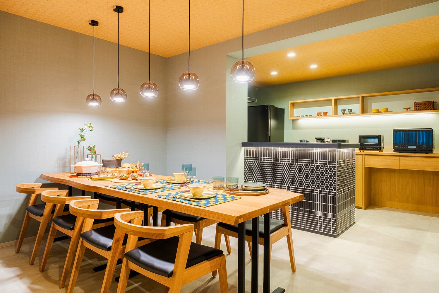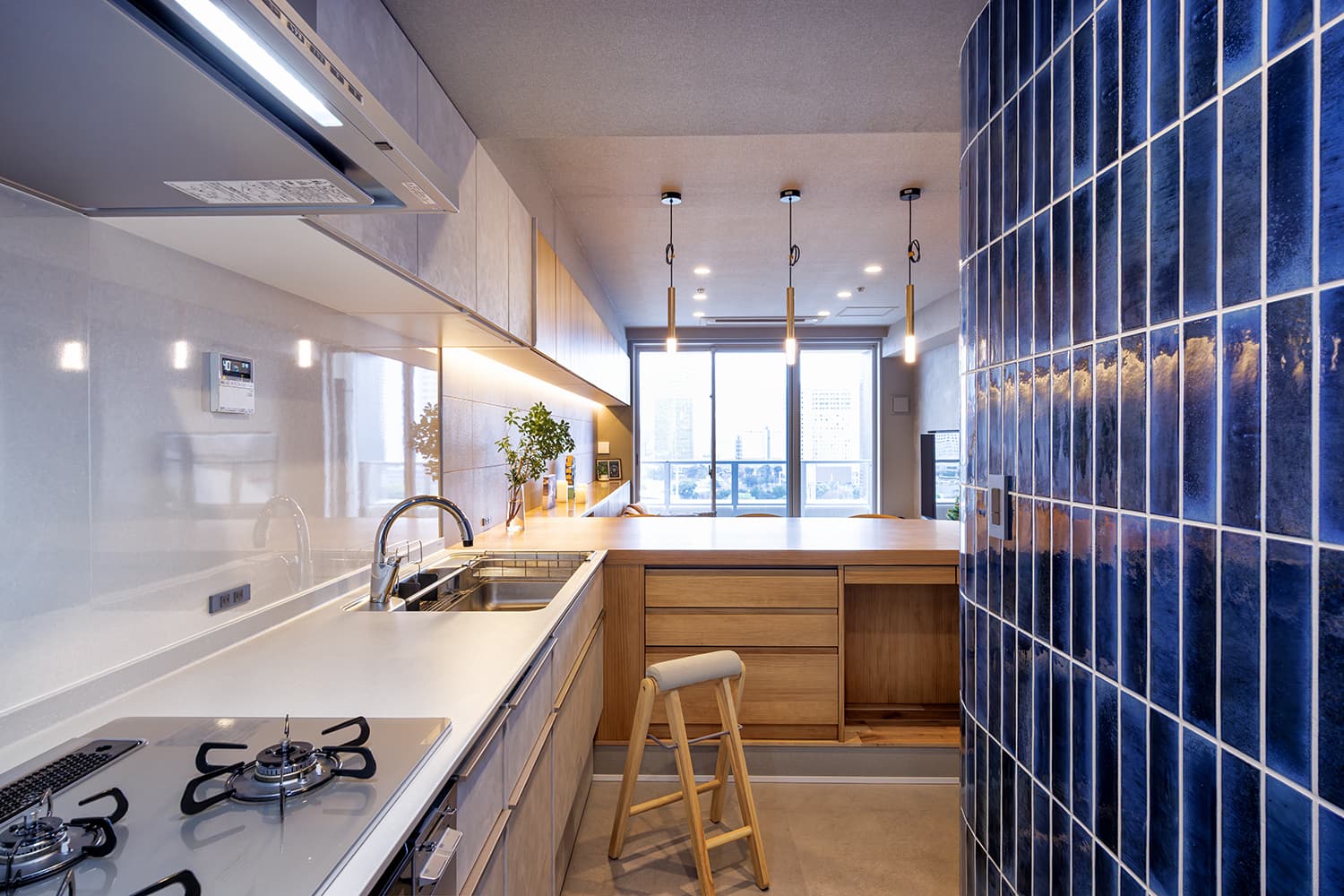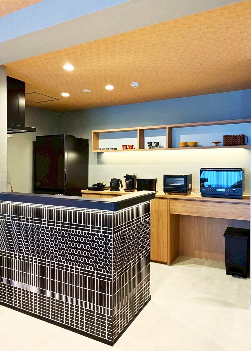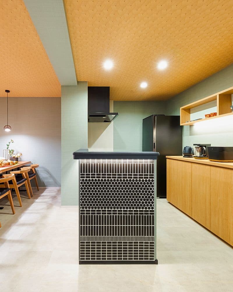 木材を基調とした落ち着いた空間の中で、大黒柱のように存在感を放つ鮮やかなブルーの「クロジョーロ」が一際目を惹きます。異素材が美しく響き合う空間に、細部にわたる深いこだわりを感じる作品です。