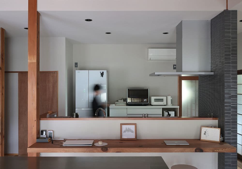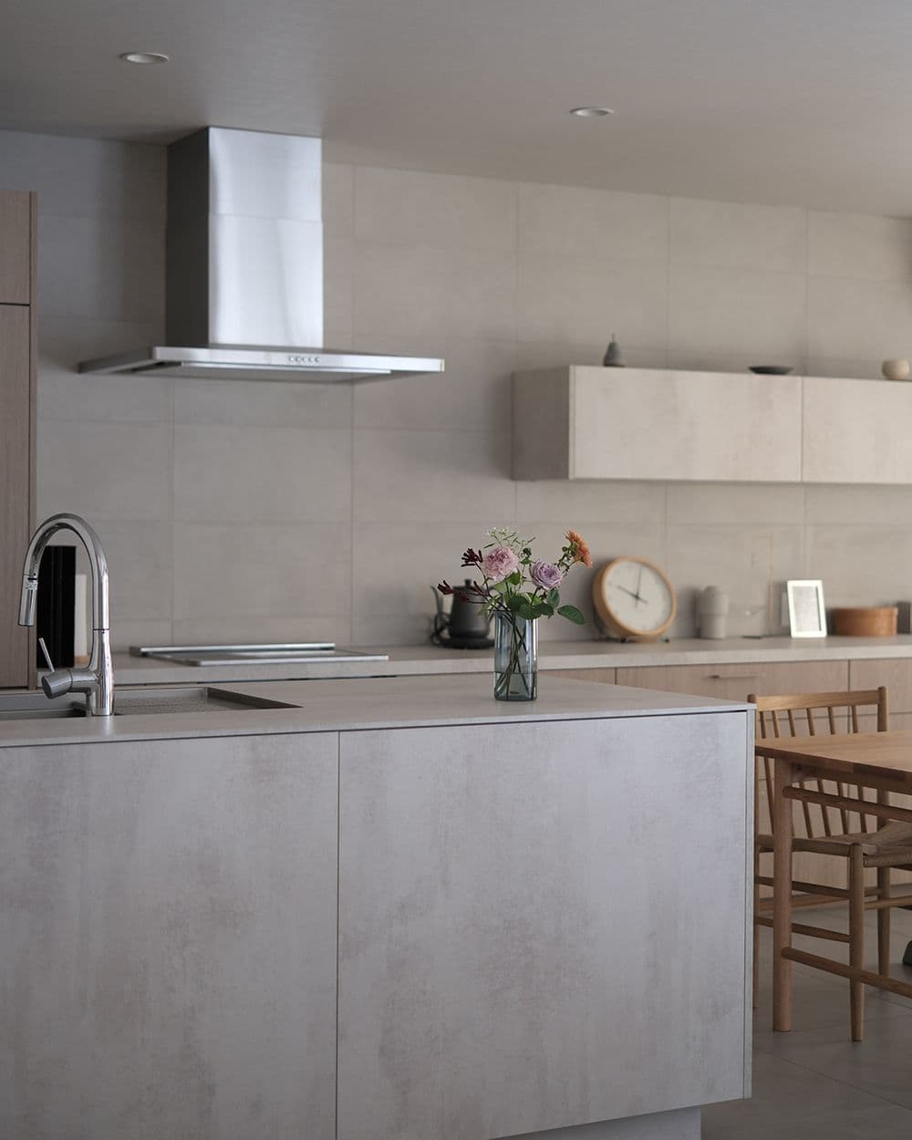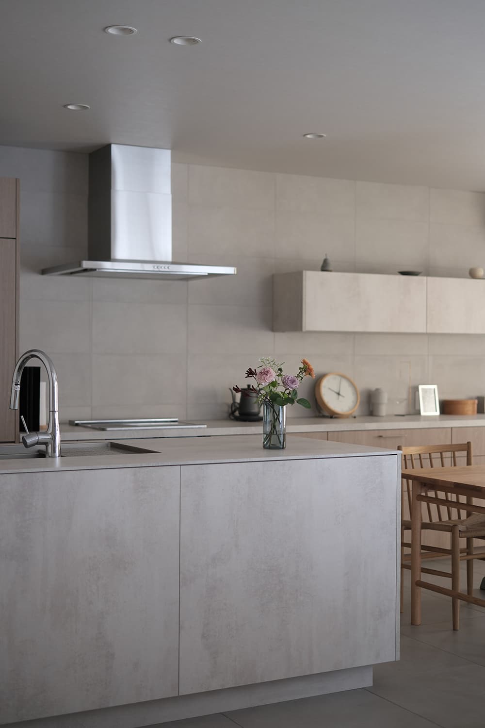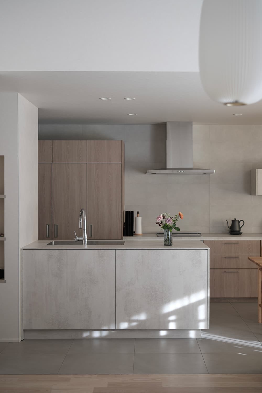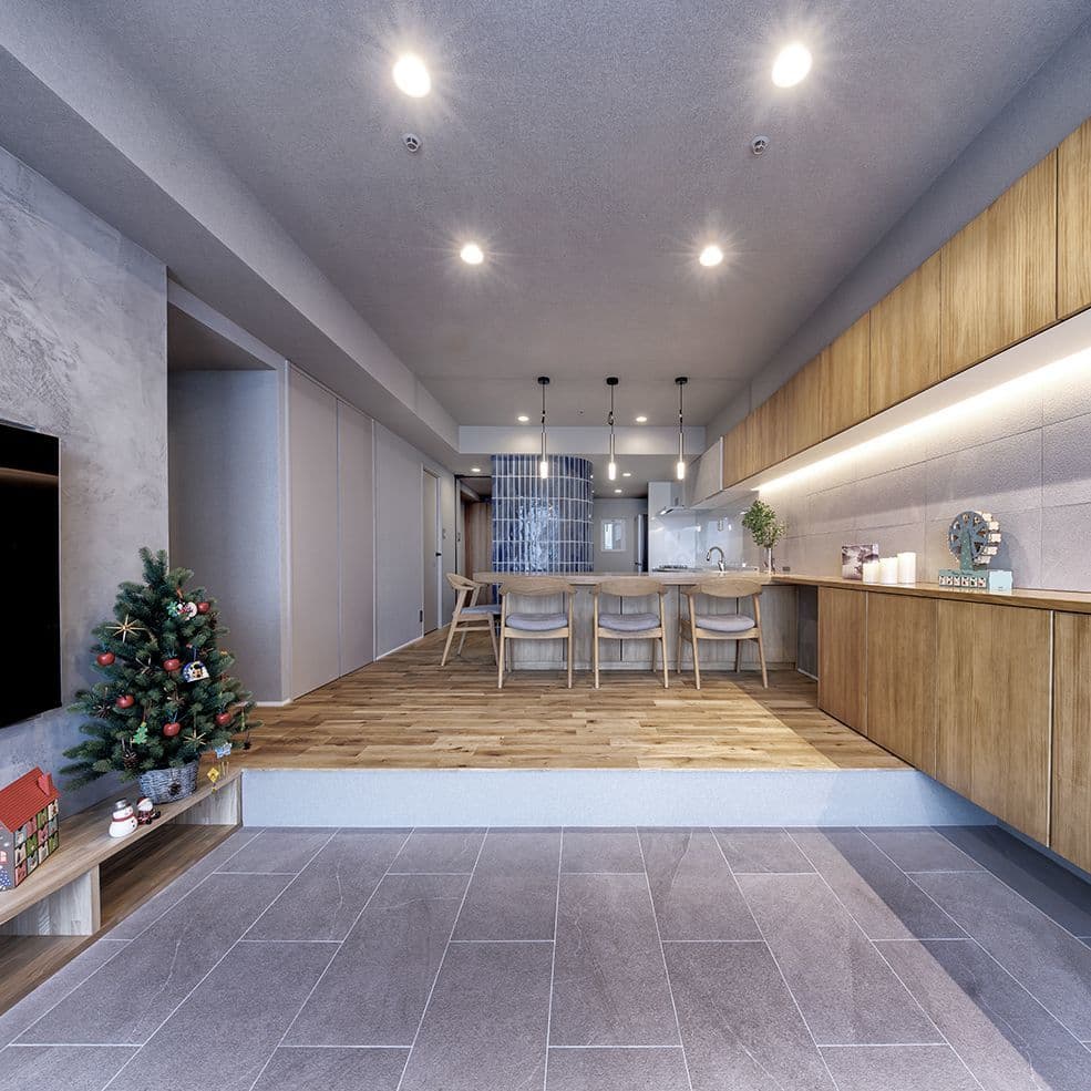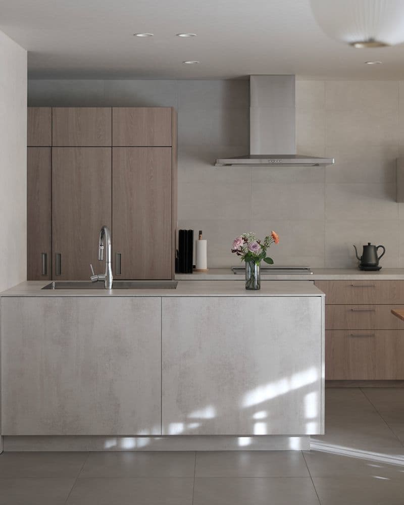 冬の柔らかな陽光が差し込み、季節感をさりげなく演出する情景が印象的です。「セメンティング」の素材感とキッチンの色合いが見事に調和していて、落ち着きある洗練された“たたずまい”を創り出しています。