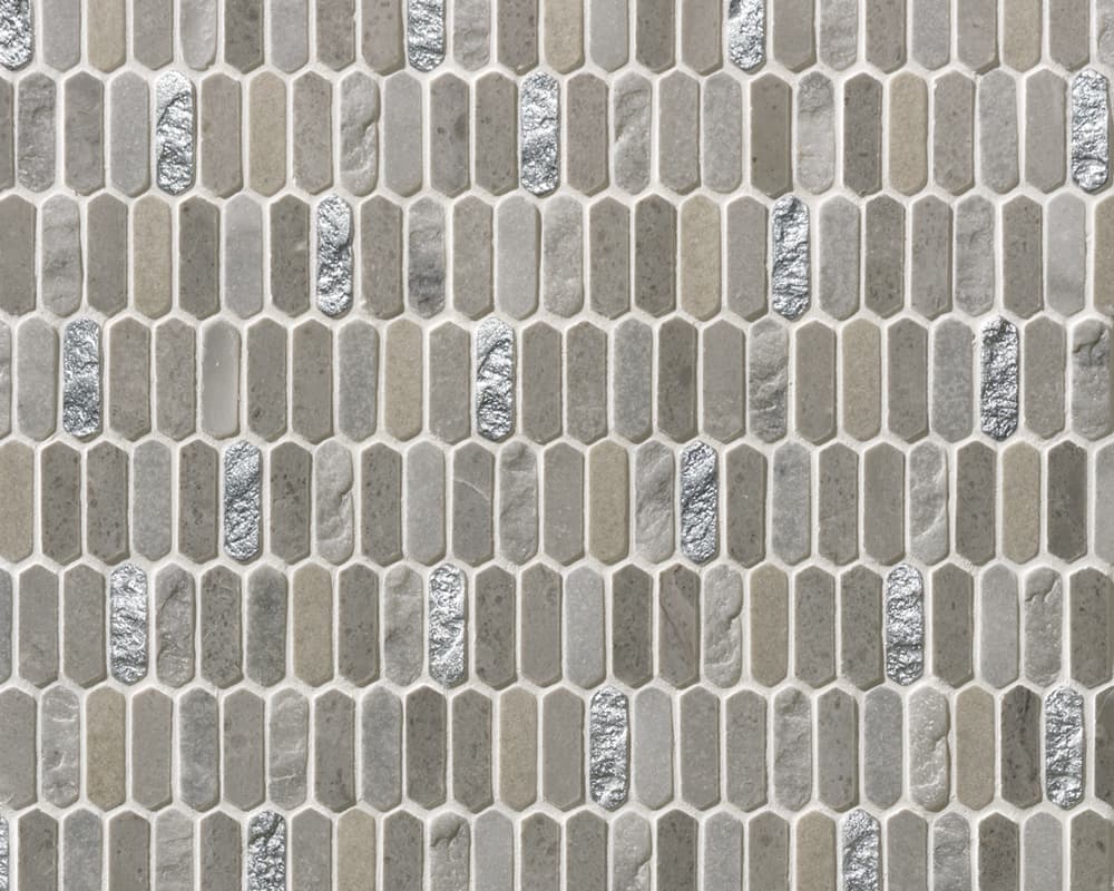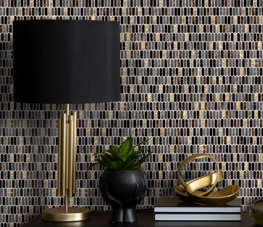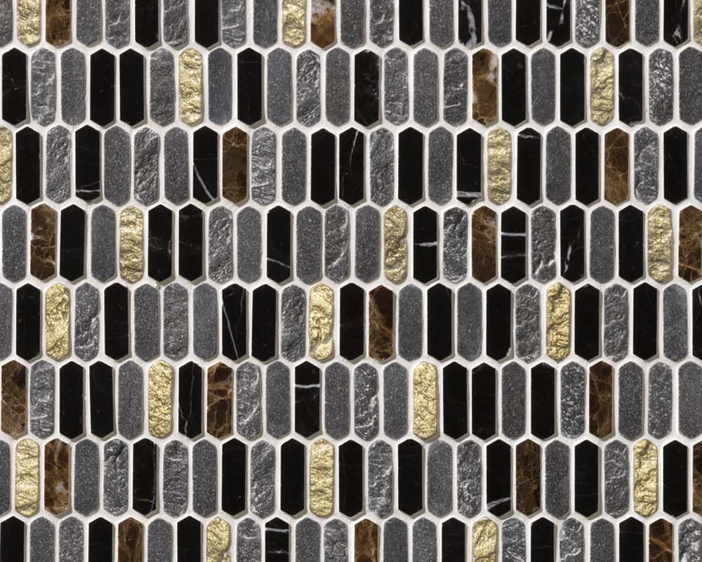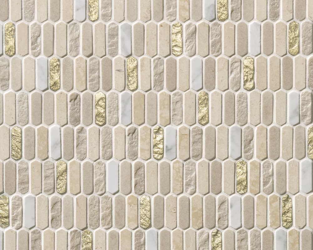 イタリア語で“宝庫”を意味し、ビザンティン美術の輝きや神聖な雰囲気が息づいているかのようなコレクションがあります。今年の秋に入荷した「テソローネ」は、宝石のように輝く樹脂と天然の石材を組み合わせた表情豊かなモザイクタイルで、豊かな色彩と細長い六角形の緻密なディテールが最大の特長です。アクセントの金やグリーン、ブルーの輝きは、空間にエレガントな雰囲気をもたらします。また、美しさだけでなく、キッチンや洗面室などの壁で活用できる実用性も備えています。美と機能のバランスが絶妙に取られたデザインは、モダンなインテリアに新たな魅力をもたらすことでしょう。