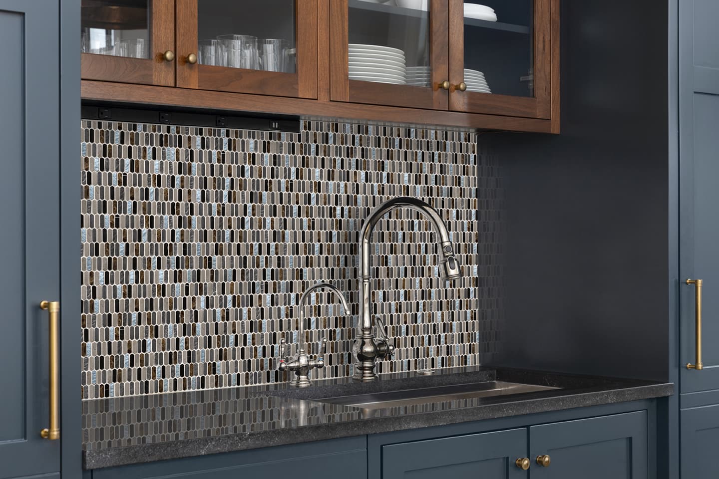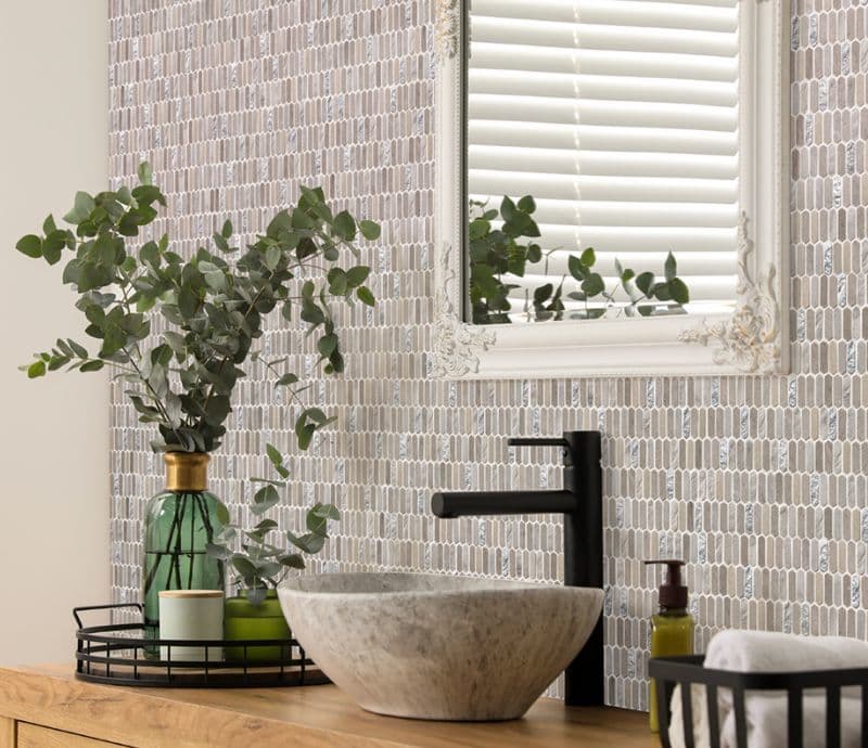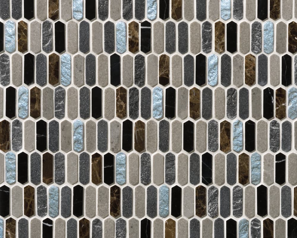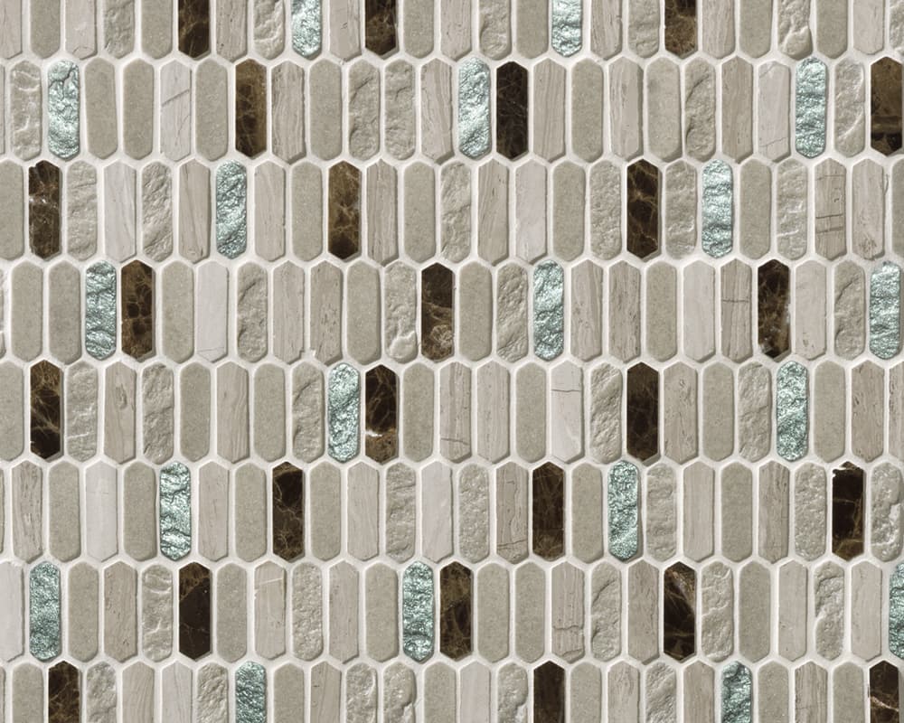イタリア語で“宝庫”を意味し、ビザンティン美術の輝きや神聖な雰囲気が息づいているかのようなコレクションがあります。今年の秋に入荷した「テソローネ」は、宝石のように輝く樹脂と天然の石材を組み合わせた表情豊かなモザイクタイルで、豊かな色彩と細長い六角形の緻密なディテールが最大の特長です。アクセントの金やグリーン、ブルーの輝きは、空間にエレガントな雰囲気をもたらします。また、美しさだけでなく、キッチンや洗面室などの壁で活用できる実用性も備えています。美と機能のバランスが絶妙に取られたデザインは、モダンなインテリアに新たな魅力をもたらすことでしょう。