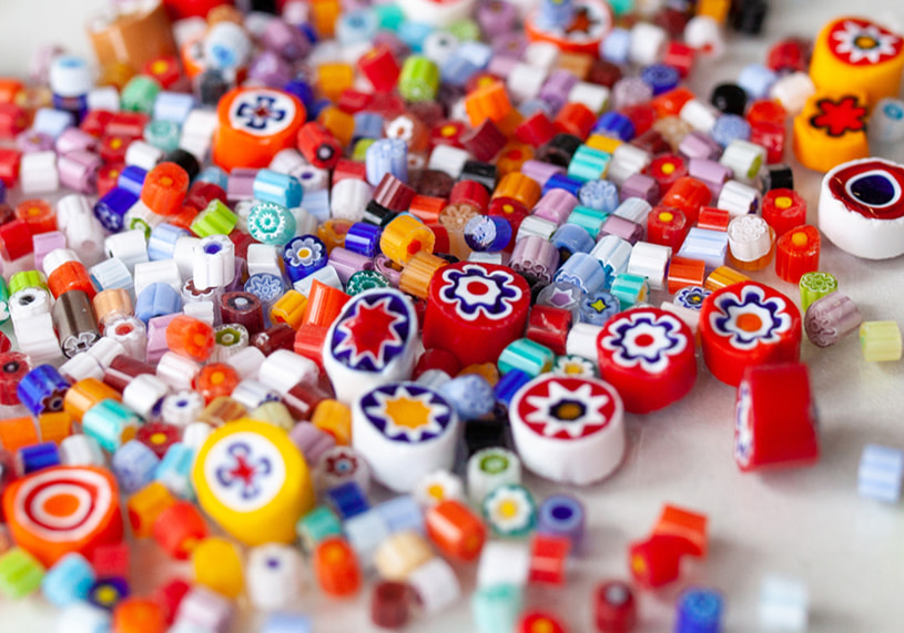 ガラス工芸品「ミルフィオリ(Millefiori)」がところどころに埋まっているものもある。イタリア語で「千の花」を意味し、その名の通り小さなガラスの花が無数に敷き詰められたような美しい模様が特徴。