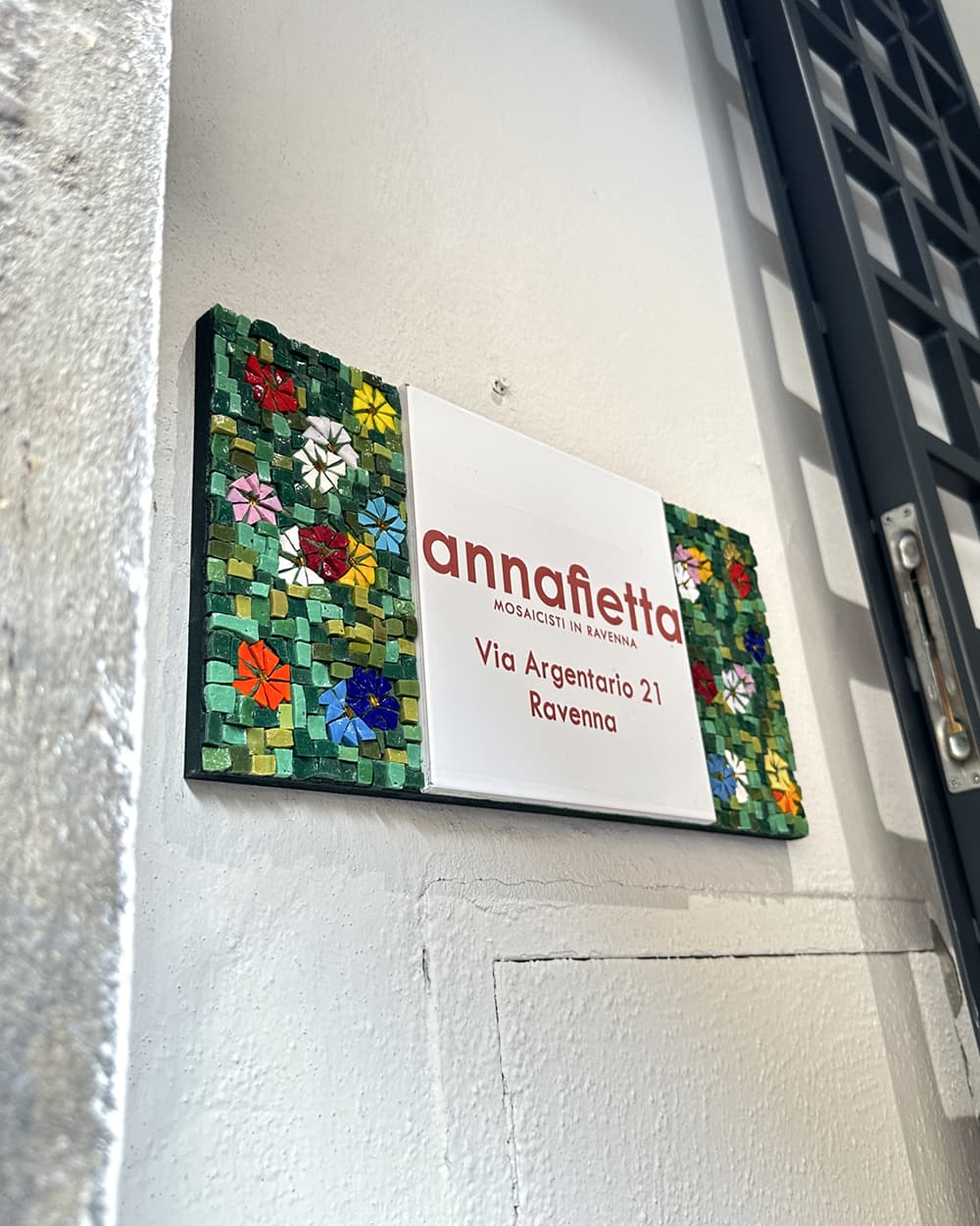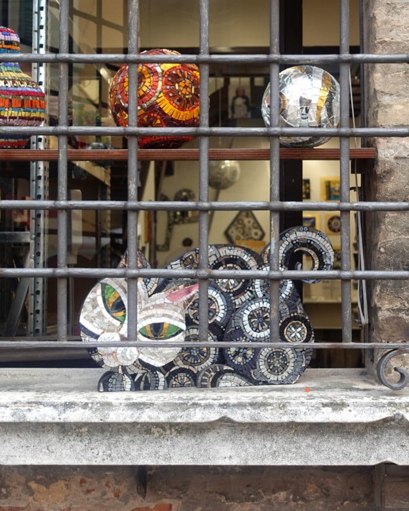 アルジェンターリオ通りの、サン・ヴィターレ聖堂の入口からほど近い場所にある店「annafietta」。ここの窓辺には、訪れる者を長い間見つめ続ける猫(写真中央)が佇む。