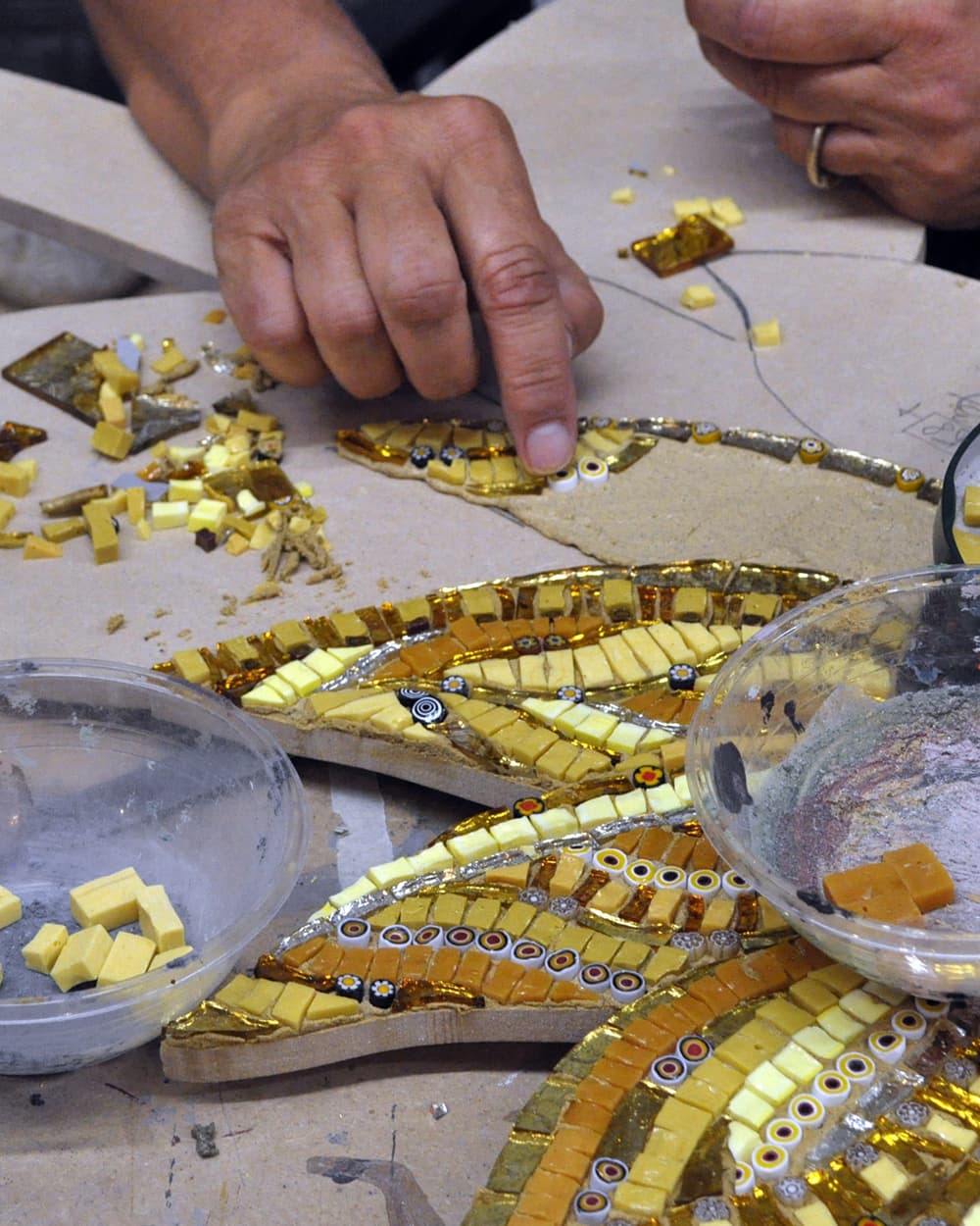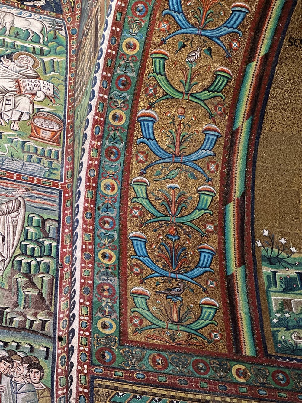 金やエメラルドグリーン、サファイアブルーなど豊かな色彩と精緻なディテールが、モザイクに深みと輝きを与えている。
