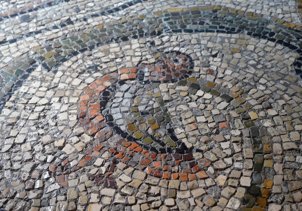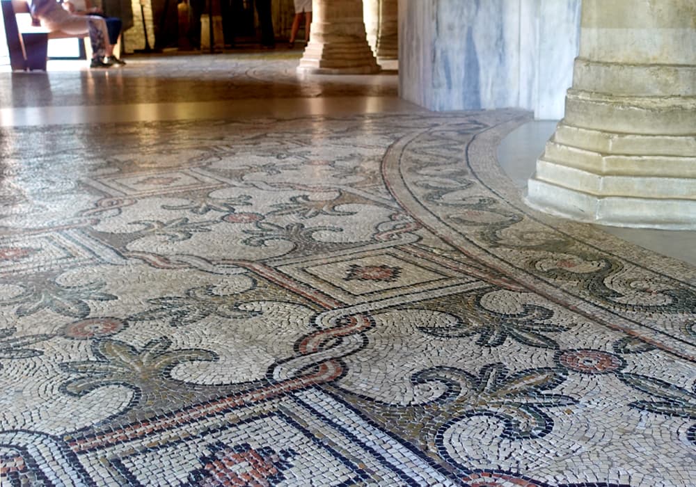 内部の床にぎっしりと敷かれた大理石モザイク。永い歴史の中で、ところどころ艶や丸みを帯びた大理石が味わい深い。