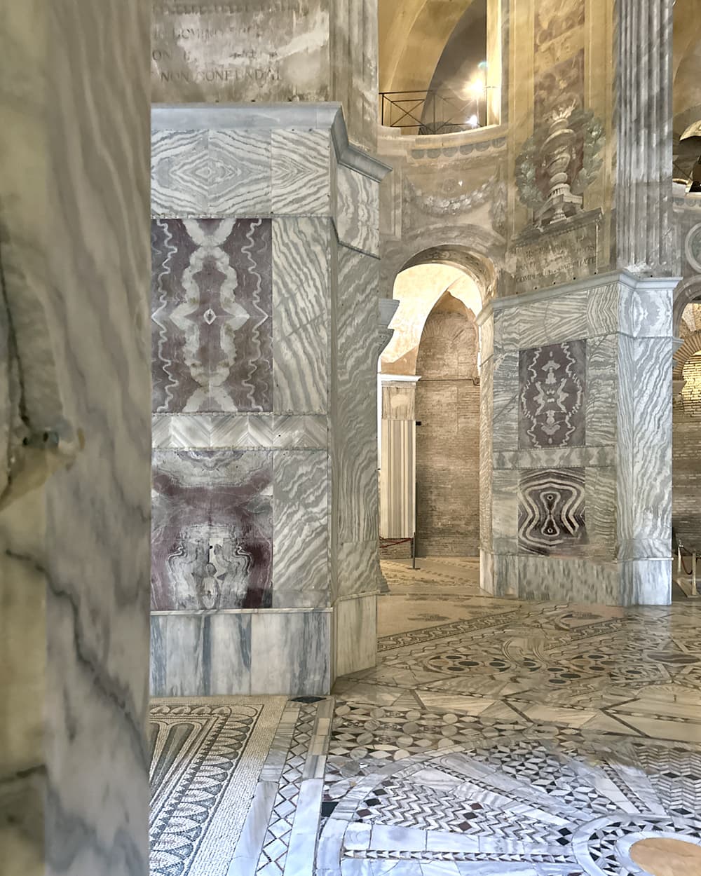 サン・ヴィターレ聖堂の内部で注目すべき点は、モザイクだけではありません。この聖堂はブックマッチ・パターンと呼ばれる大理石の宝庫としても知られています。ブックマッチとは、まるで開かれた書物のような左右対称で美しい模様のことで、教会や宗教的建造物によく見られます。ビザンティン美術が持つ神聖な雰囲気や抽象的な美学を象徴するこの大理石の意匠が、広範囲にわたりさまざまな色とパターンで、サン・ヴィターレ聖堂の壁面に施されています。