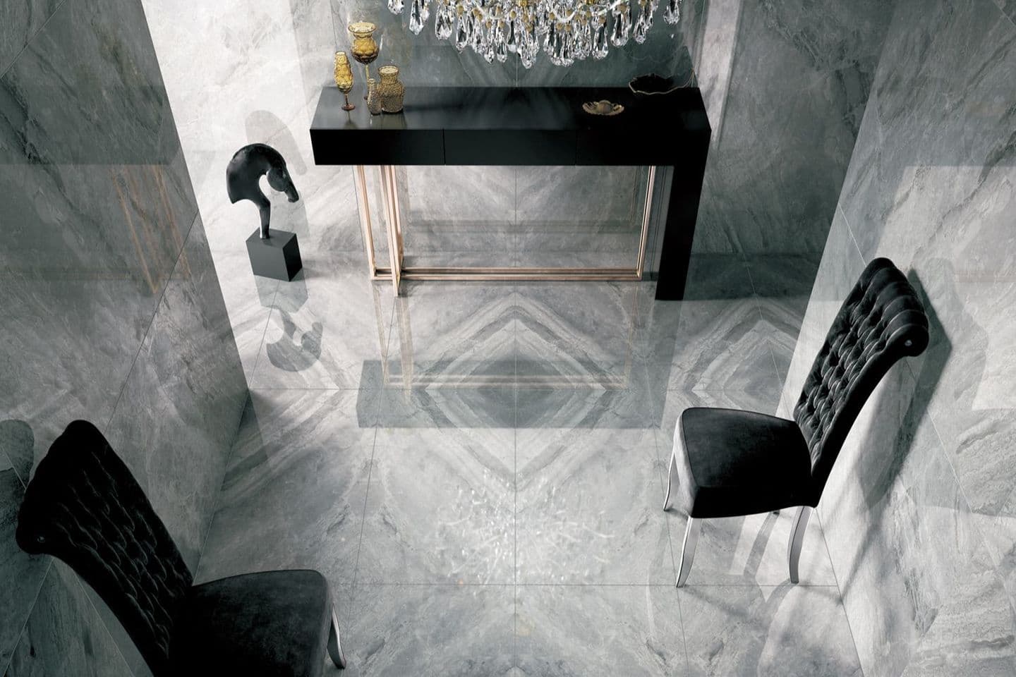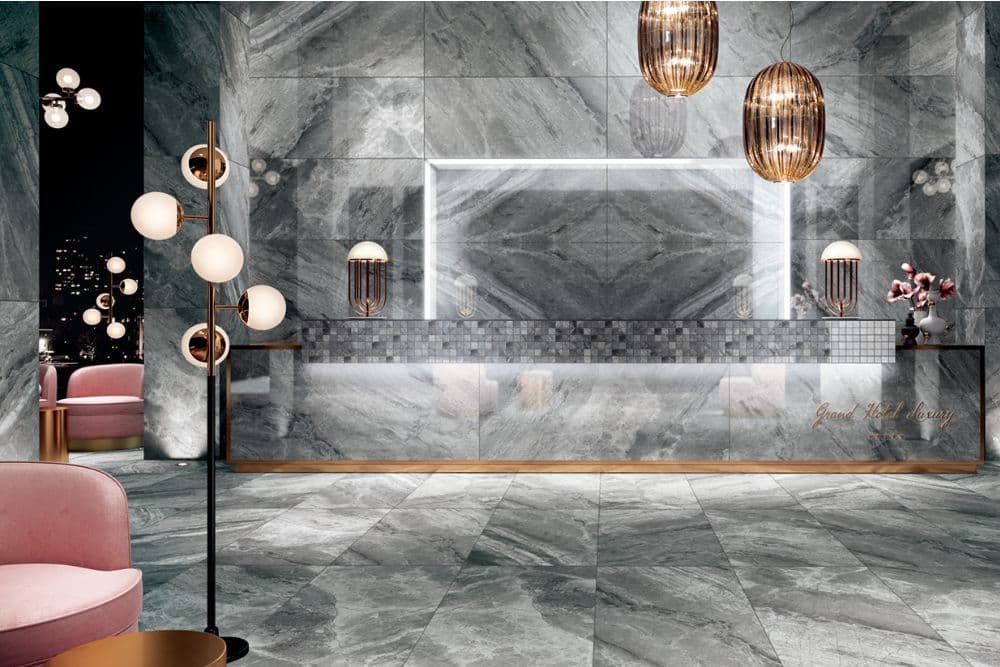 薄くて大きなタイルは開発された当初、プレーンで装飾性の乏しいものがほとんどでしたが、印刷技術は進化を続け今や大理石模様が主流となっています。天然大理石は、実際に切り出してみないとどのような柄で現れるかわかりません。(それが面白みでもありますが。)また、大判サイズになると厚みが必要となり、切り出す作業や運搬作業でも膨大なコストがかかります。厚みが薄く強度があるタイルの場合も、サイズが最大3mとなると扱いが大変で一定のコストがかかりますが、天然大理石の比ではありません。近年目まぐるしく進化するセラミックタイルの技術によって、かつては争奪されるほどに貴重だった天然大理石の切り出し模様がセラミックタイルに置き換わり、比較的手軽に「邸宅感」を楽しめるようになりました。