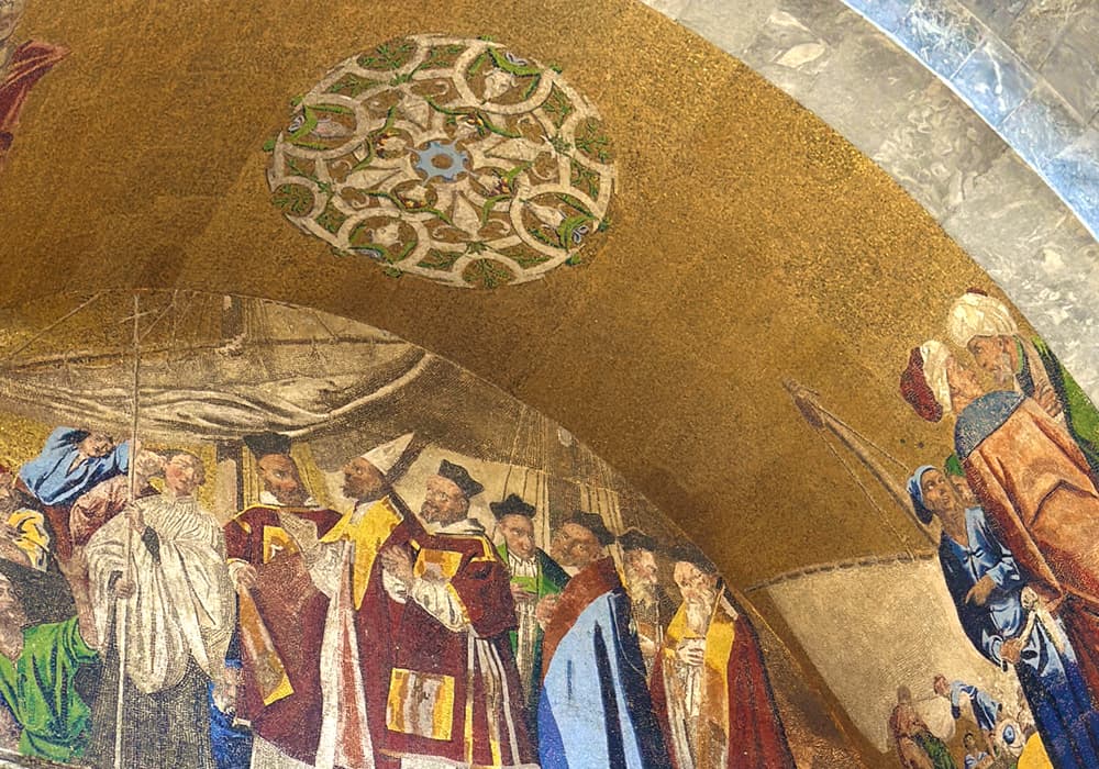 サン・マルコ大聖堂はヴェネツィアのシンボルの一つとして知られており、ヴェネツィア共和国の守護聖人である聖マルコに捧げられ、その聖遺物が聖堂内に祀られています。9世紀に建てられてから幾度もの修復工事が行われており、大理石などの装飾やバジリカの上にそびえる5つのドームが特徴的で、ビザンティン様式の煌びやかな装飾と彫刻が見事に調和しています。大聖堂の内部も見逃せません。豪華絢爛な内装は、当時のヴェネツィアの富と繁栄を物語っており、多くの芸術作品や宗教的な彫刻が教会内部に展示されています。例えば黄金の祭壇画「パラ・ドーロ(Pala d'oro)」は、12世紀にコンスタンチノープル(現イスタンブール)で創られ、十字軍が戦利品としてヴェネツィアに持ち帰ってきたものです。(コラムvol.14も併せて参照)大聖堂の近くにはサン・マルコ広場が広がっており、ガラス工芸品や仮面などのヴェネツィアの特産品を楽しむことができます。