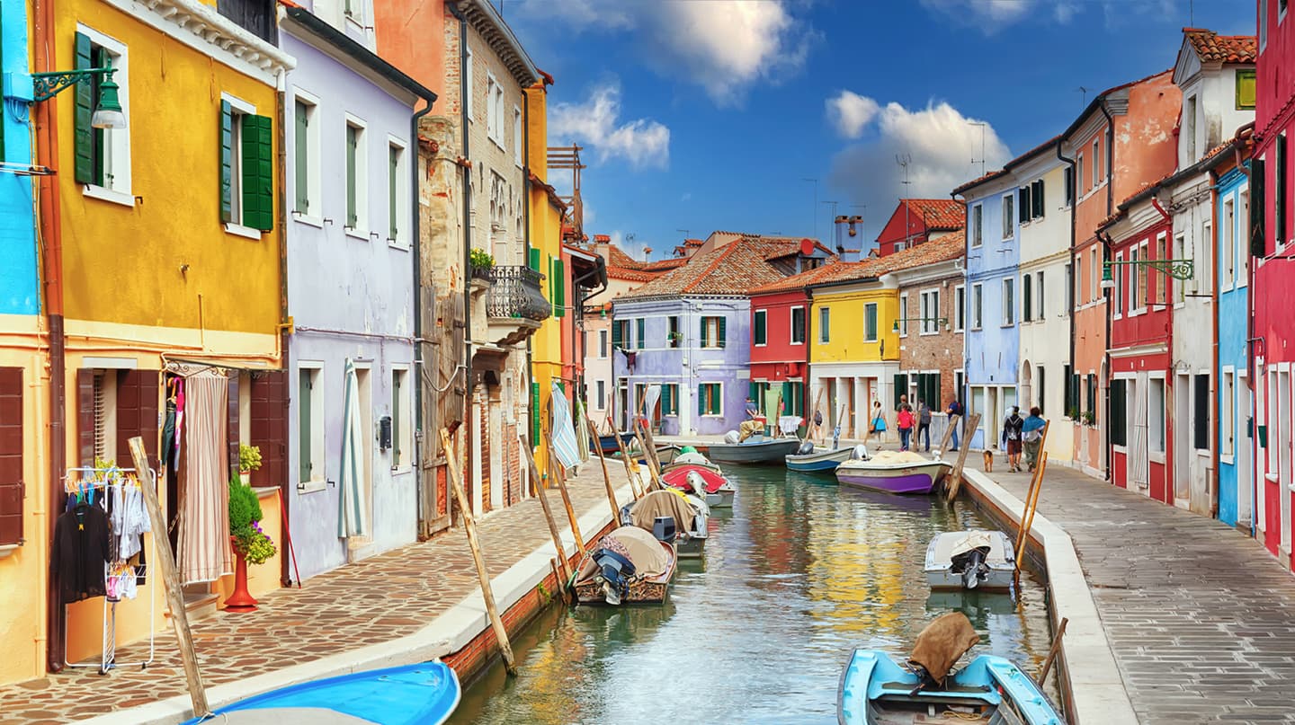 カラフルな壁と屋根の建物が並ぶムラーノ島は、島全体が芸術作品のような美しさ