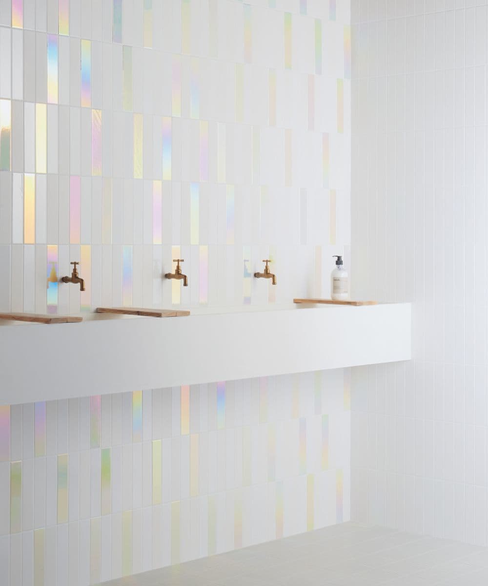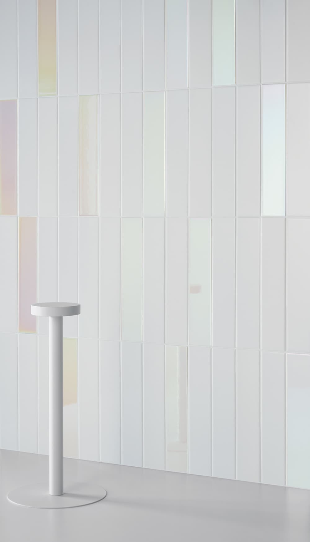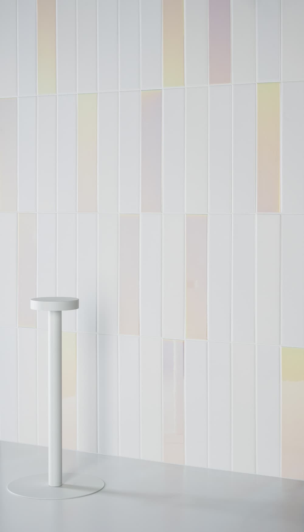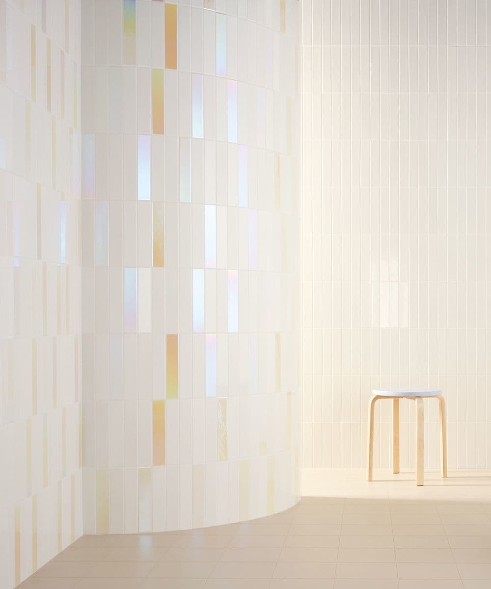 基本の色として、Milk(ミルク)、Cream(クリーム)、Sky(スカイ)、Rose(ローズ)の4色が用意されており、それぞれに、艶やかな輝きのブライト釉仕上げ、しっとりとした手触りのマット釉薬仕上げ、ホログラフィック仕上げ、3種類の仕上げのタイルが一定の比率でパッケージされた商品です。ホログラフィック仕上げのタイルは、黄×緑、緑×青、黄×オレンジ、黄×ピンク、紫×メタリックブルーなど、多彩なシェードで変化し、幻想的で虹彩のような視覚的効果を生み出します。自然光の変化や進化する多様な人工光に呼応するこのタイルは、独特な要素を融合させて幻想的な空間を構想したガウディの建築思想に通じるものがあります。
