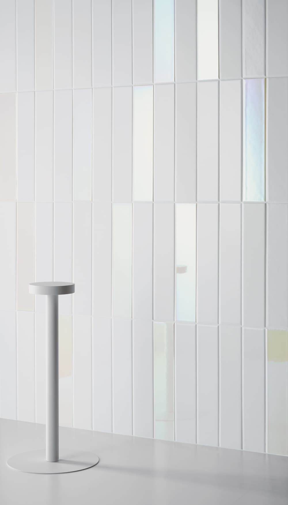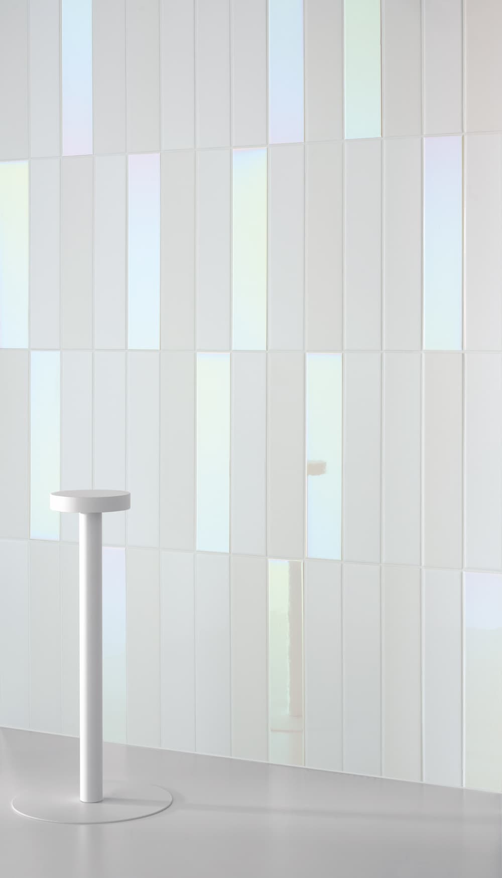 このタイルは、陶磁器の専門技術者とデザイナーが協力して行った、光と釉薬の相互作用に関する研究の成果です。彼らは貴金属を原料にした釉薬を使用し、光のスペクトルを効果的に描き出す「ホログラフィック」仕上げを開発しました。これまでにないこの特別な技術は、光の変化に対応して異なるスペクトルを示し、幻想的な空間を創り出します。