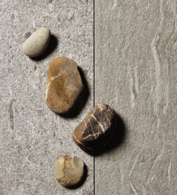 不規則な斑点模様が現れるクロスカット(1000~1040・1100G〜1140G)と流れるような静脈模様 となるヴェインカット(1050~1090・1150G〜1190G)の 2 種類をセラミックタイルで創作しました。 自然の中にある素材の美しさと魅力的な質感を引き出した傑作です。