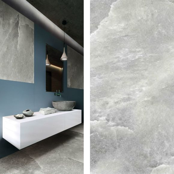 セラミックタイルによる天然石の表現は、オーソドックスな石種の模様・色彩の再現からはじまり、今ではデジタル技術を駆使して、再現という領域を超えたデザインにまで進化を遂げています。想像力と最新技術から生まれた超リアリズムの表現が、現代建築に豊かさを提案します。「Moon Stone(月の石)」と 「Rock Salt(塩の岩)」はそれらを代表する製品です。