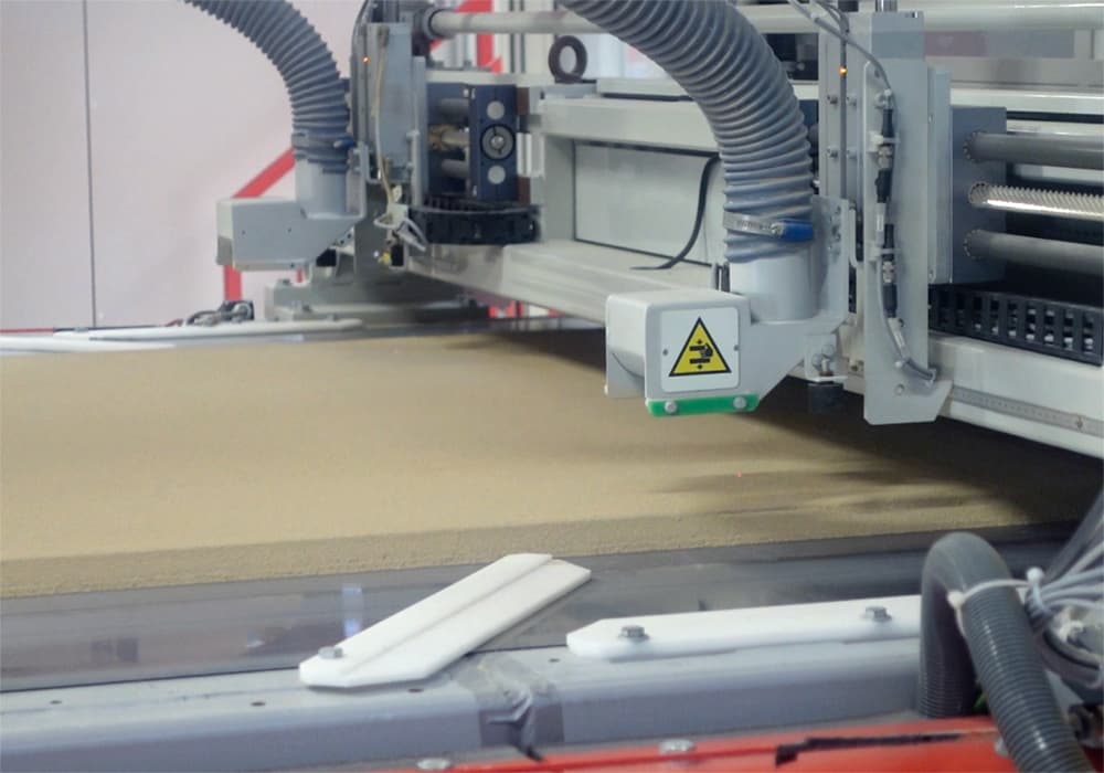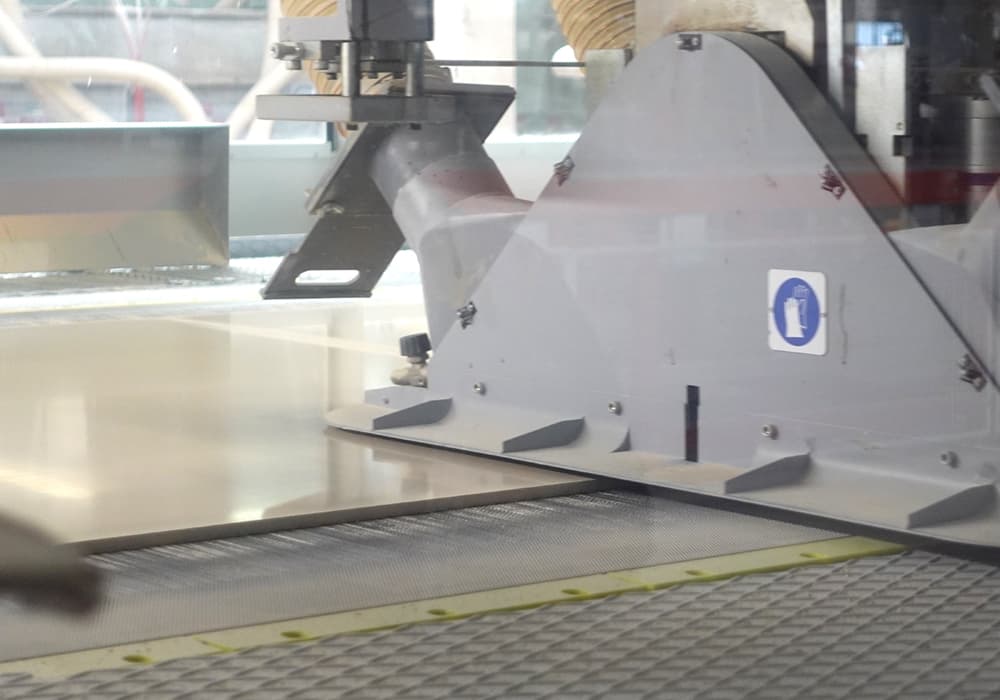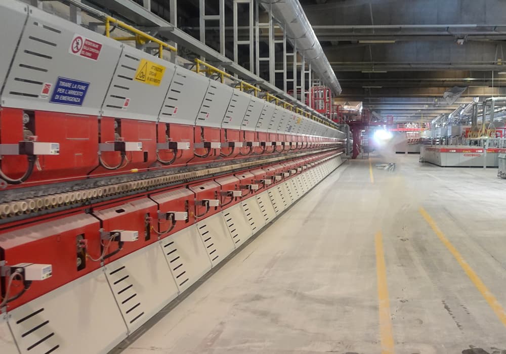 原料土の保管タンク、配合機、乾燥機、7,500トンを超えるプレス機、プリンター、カッター、そして梱包設備――いずれも大規模な装置が縦横に広がっており、圧巻の風景です。幅約4メートルの通路を、ロボットが悠々と通り抜けていく様子も見られます。1970年代にはすでに生産効率を大幅に向上させる機械が開発されていましたが、今日ではその機械がロボットへと進化しています。タイル産業に限らず、イタリアはマンパワー以外の動力導入に積極的で、スペインでも同様の傾向が見られます。メーカーを訪れると、生産ラインにほとんど人がいないことに驚かされるでしょう。