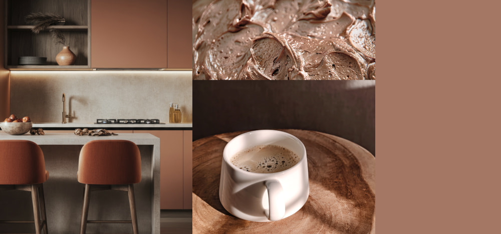 モカムースは、洗練されていながらも気取らない謙虚さと、クラシックなブラウンの高級感を融合した色。その内に秘めた感覚的で心地よい温かさは、私たちが求める「快適さ」と、日常に潜む小さな喜びを感じる贅沢さ、それを周囲と分かち合うことへの願いを反映しています。