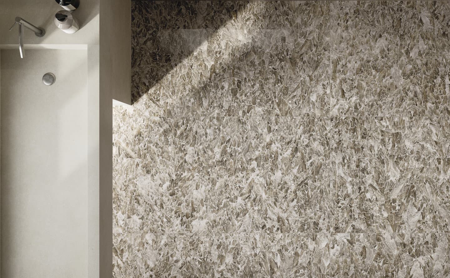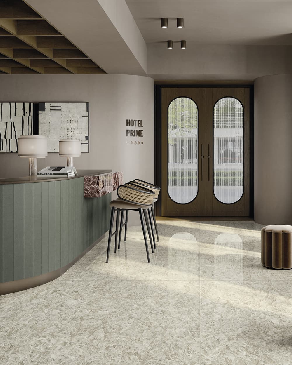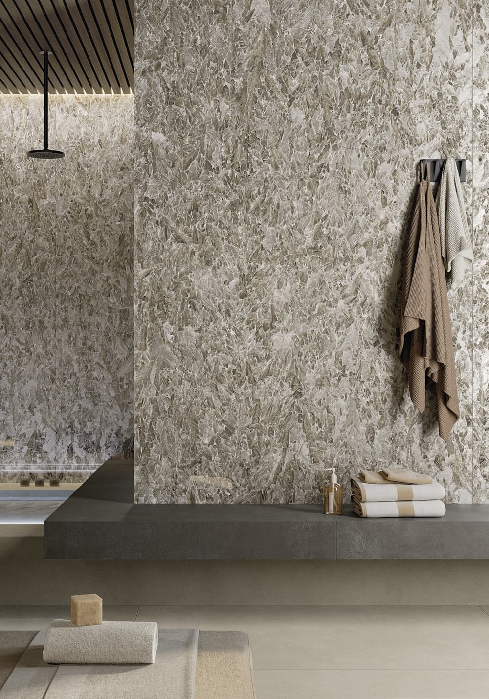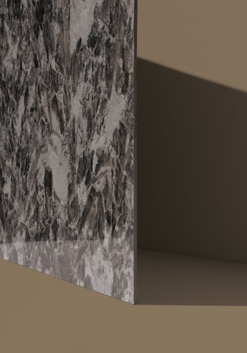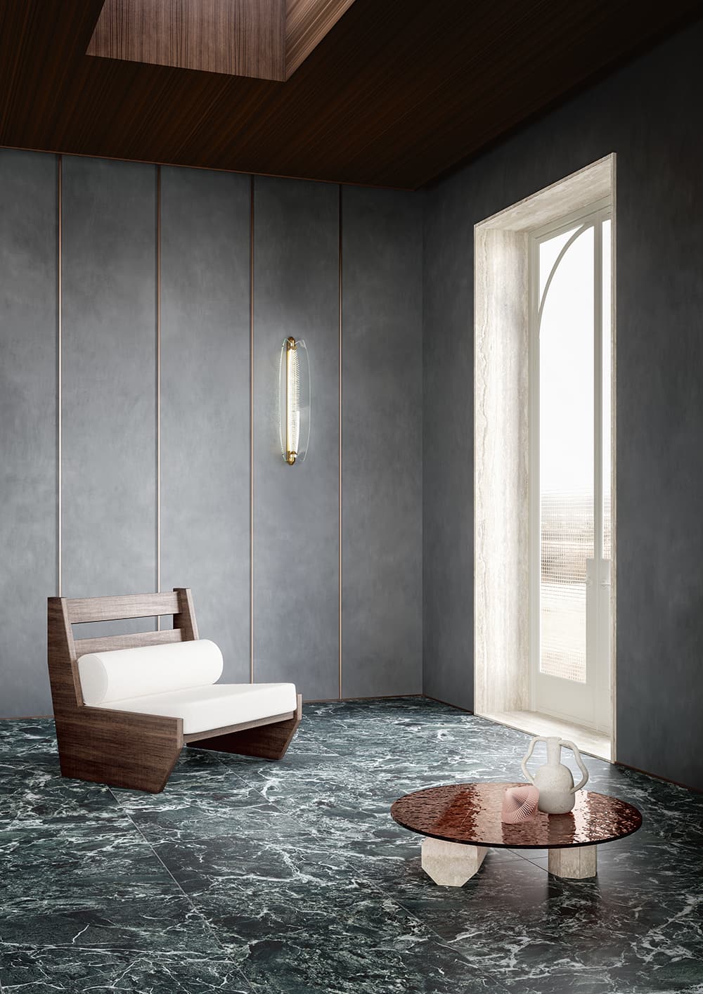 高い意匠性と機能性を兼ね備えた、大理石模様のタイルの中でも最も洗練されたシリーズ「マーブルラブ」に、新たなカラーバリエーションが加わりました。超大判6mm厚の「マルミマキシマム」と同色の組み合わせも可能で、空間に統一感をもたらします。新色の特殊面状(7120H・9180H)には、「Multi-Layer Technology(マルチレイヤーテクノロジー)」と「Dry Status Technology(ドライステイタステクノロジー)」という2つの革新的技術が採用されており、奥行きのある3Dテクスチュア効果とともに、天然石がもつ複雑な表情を精巧に再現しています。芸術的ともいえる美しいディテールと現代的かつ大胆なデザインは、空間に新たな印象を与えます。