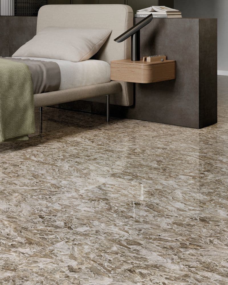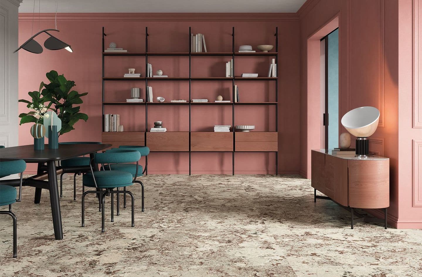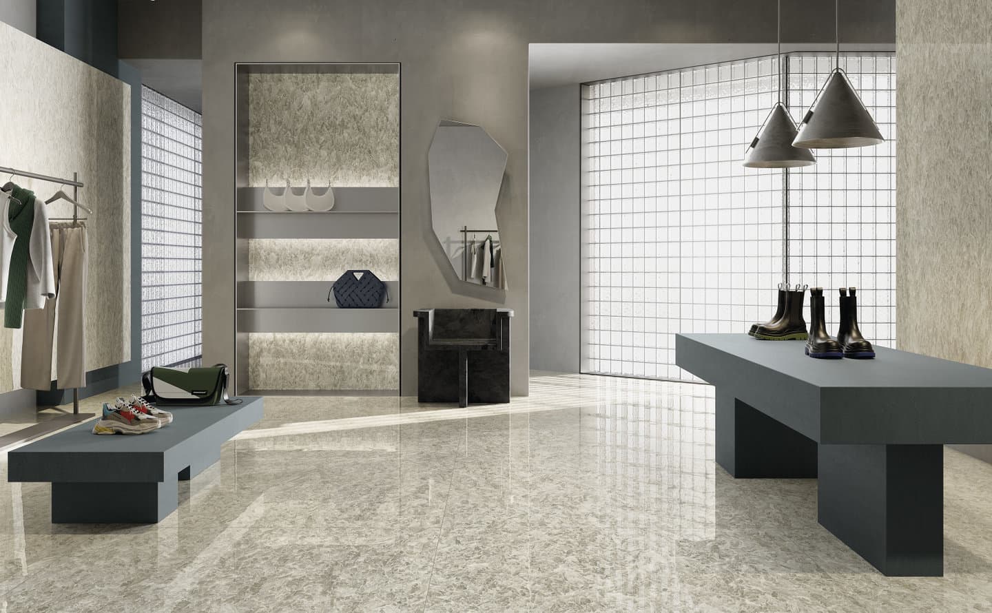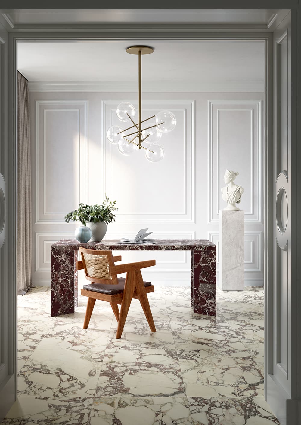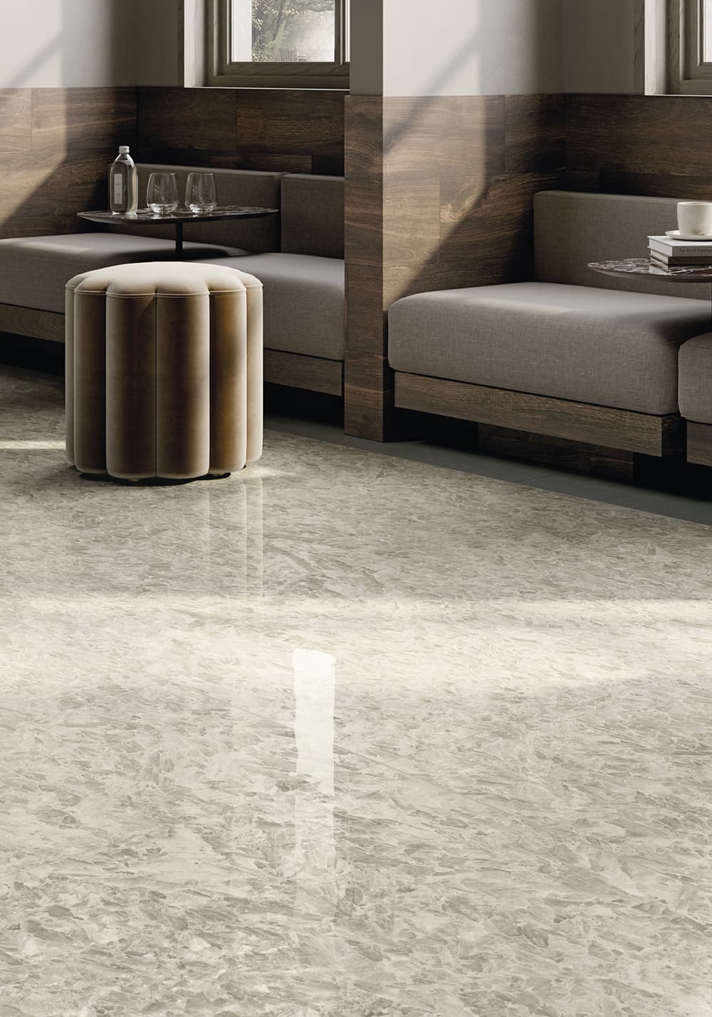 高い意匠性と機能性を兼ね備えた、大理石模様のタイルの中でも最も洗練されたシリーズ「マーブルラブ」に、新たなカラーバリエーションが加わりました。超大判6mm厚の「マルミマキシマム」と同色の組み合わせも可能で、空間に統一感をもたらします。新色の特殊面状(7120H・9180H)には、「Multi-Layer Technology(マルチレイヤーテクノロジー)」と「Dry Status Technology(ドライステイタステクノロジー)」という2つの革新的技術が採用されており、奥行きのある3Dテクスチュア効果とともに、天然石がもつ複雑な表情を精巧に再現しています。芸術的ともいえる美しいディテールと現代的かつ大胆なデザインは、空間に新たな印象を与えます。