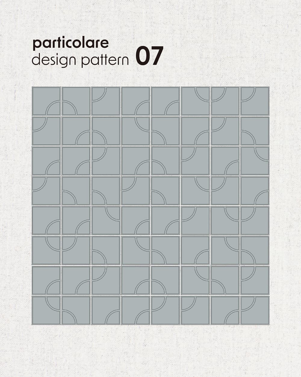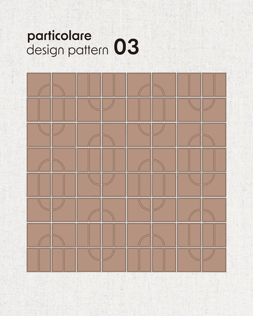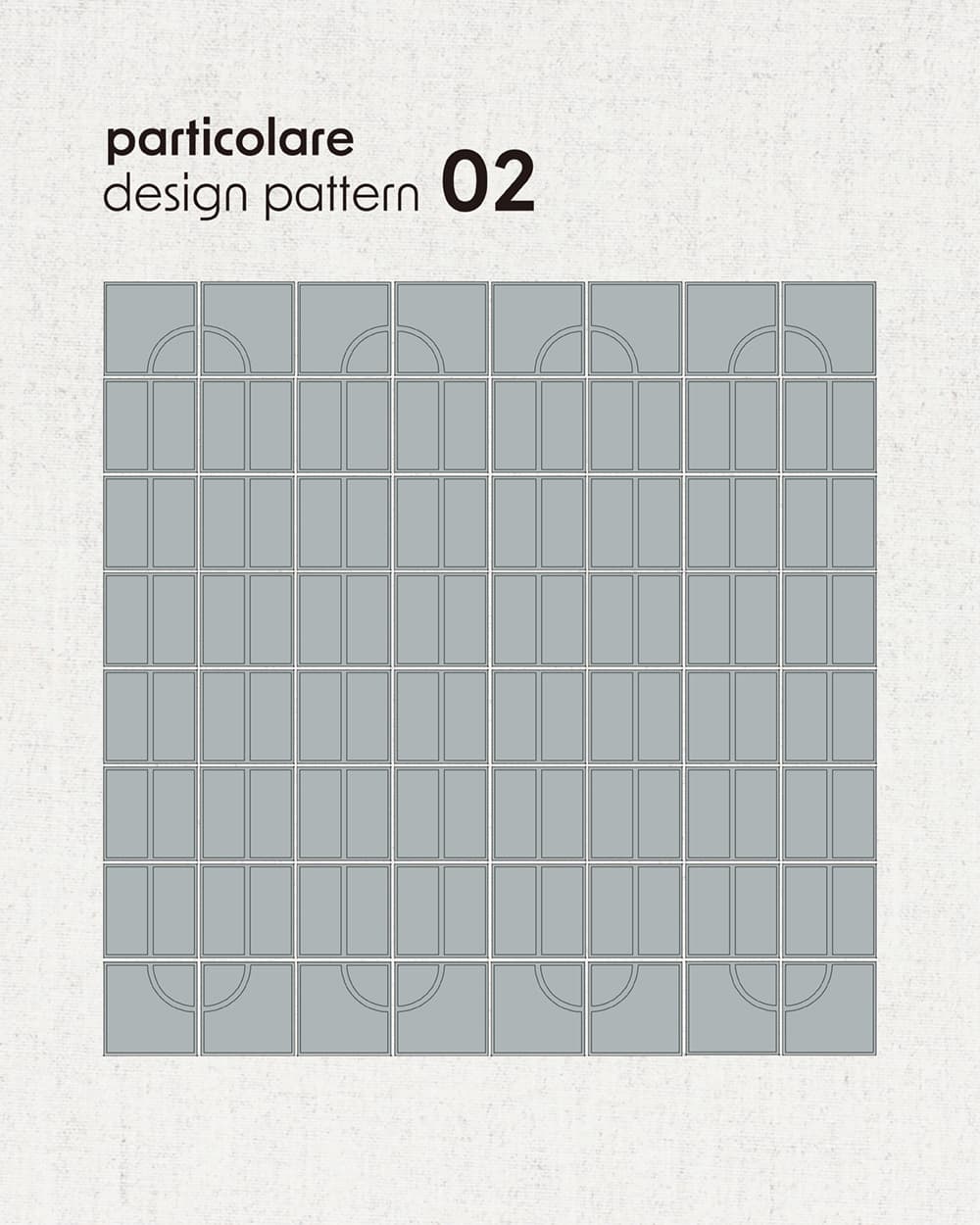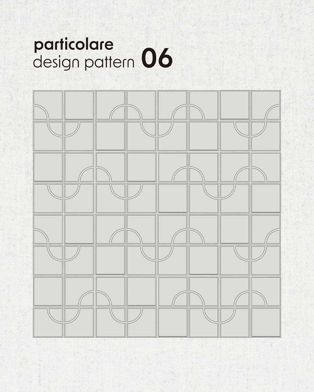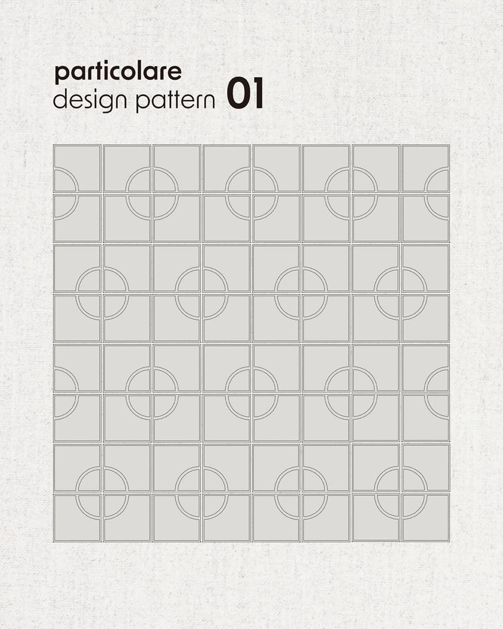 普遍的な美を求めた建築家パッラーディオが用いた構図操作──反復、対称、回転。その思想を壁面で端的に表現するのが「パルティコラーレ」です。124.5mm角のタイルに、Plain・Line・Curveの3種の立体フォルムを組み合わせ、スモーキーな色彩で展開。直線と曲線から生まれる陰影のリズムは、壁面をディテールからデザインし、クラシックなスタイルにもコンテンポラリーなスタイルにも調和します。新商品「パルティコラーレ/PARTICOLARE(=ディテール / イタリア語)」は、その名の通り、細部が全体の美を形づくることを具現化したタイルです。