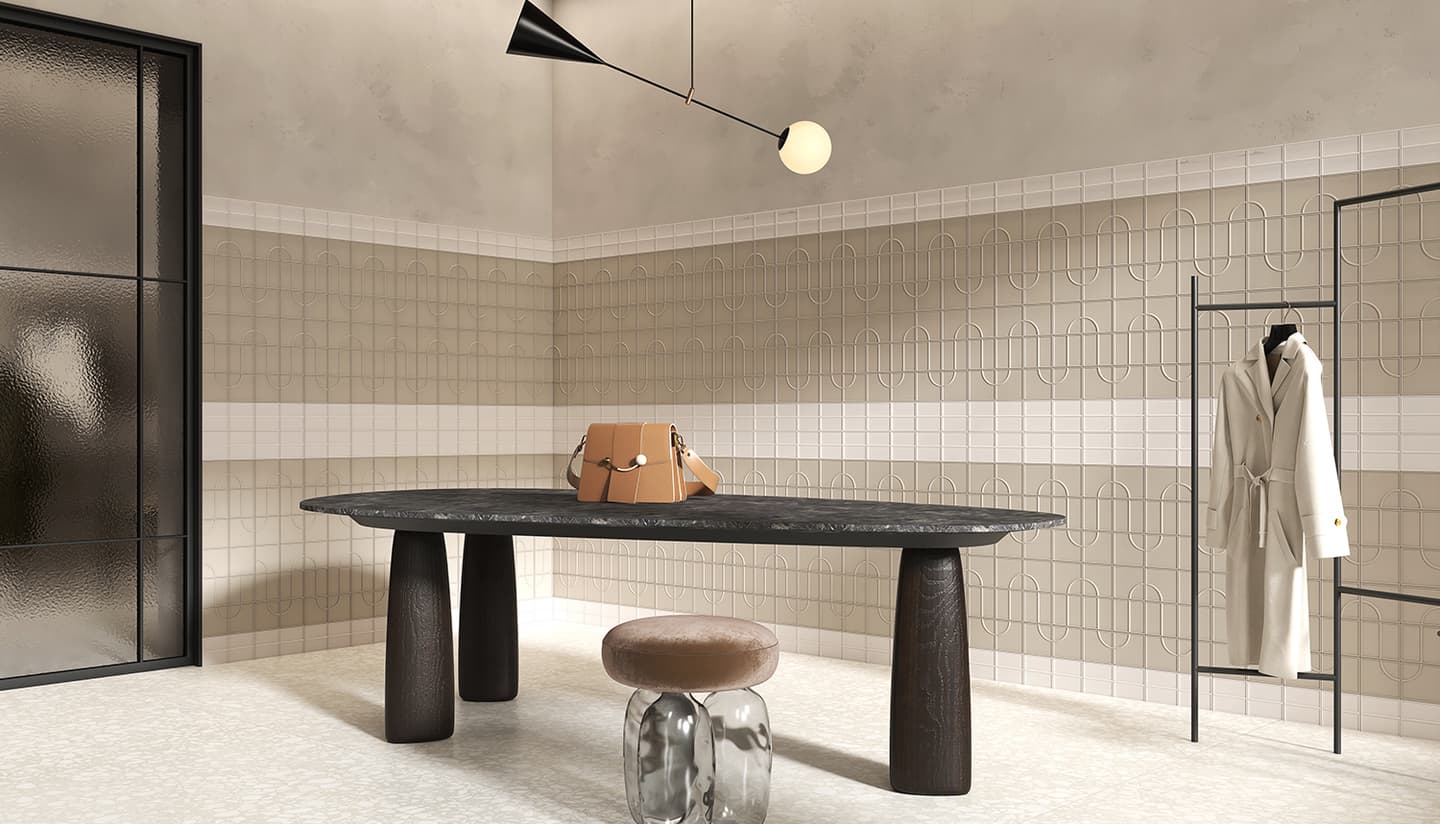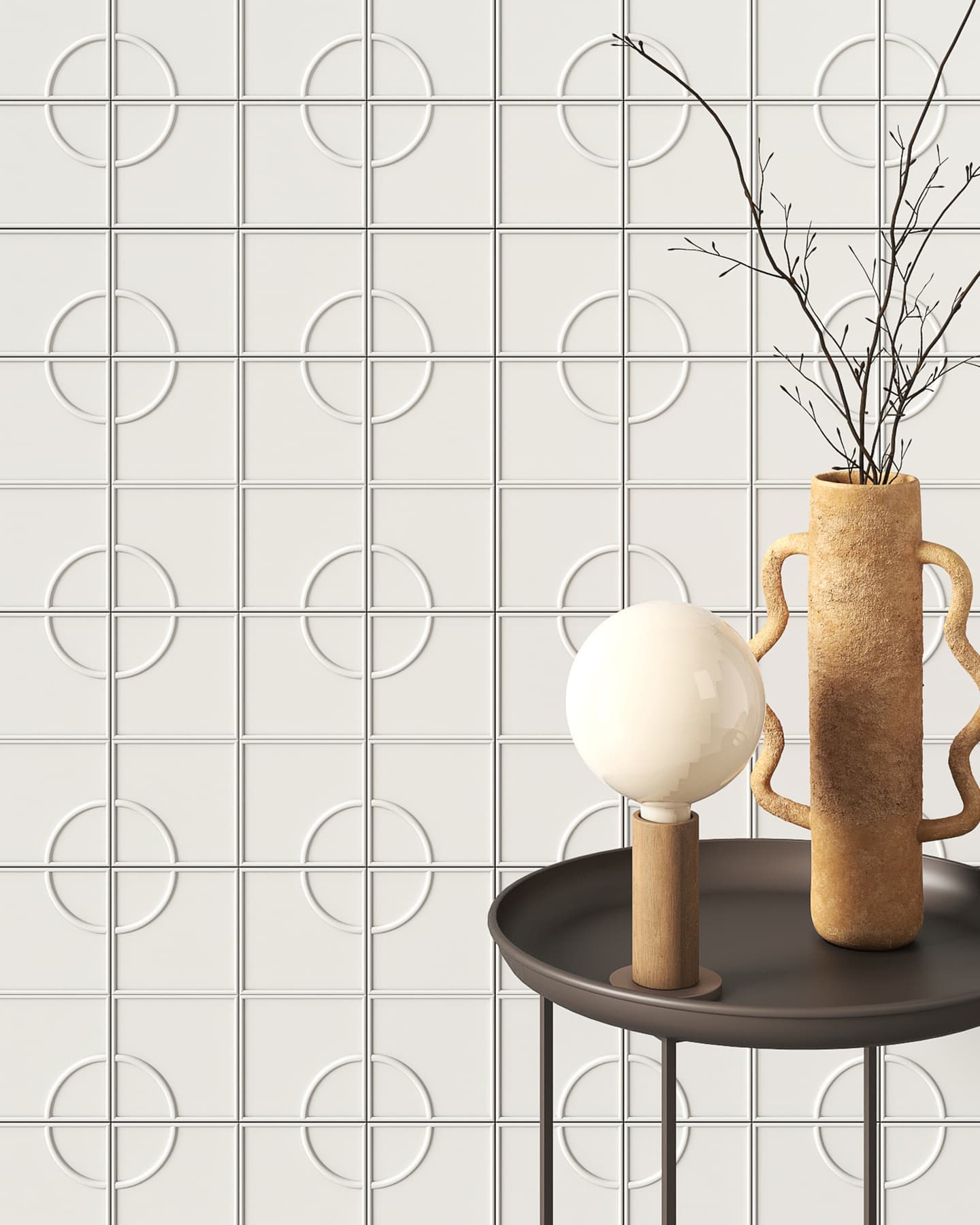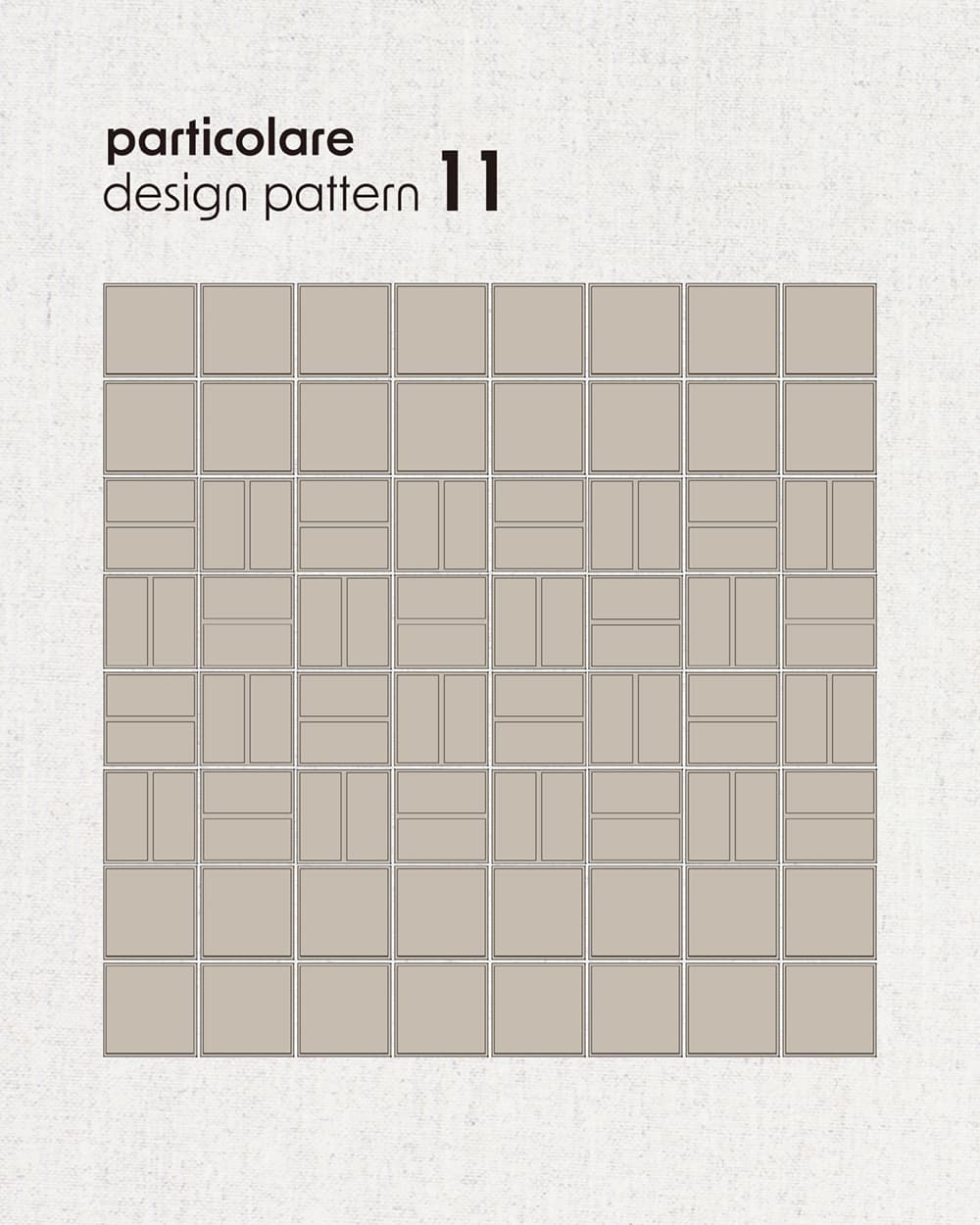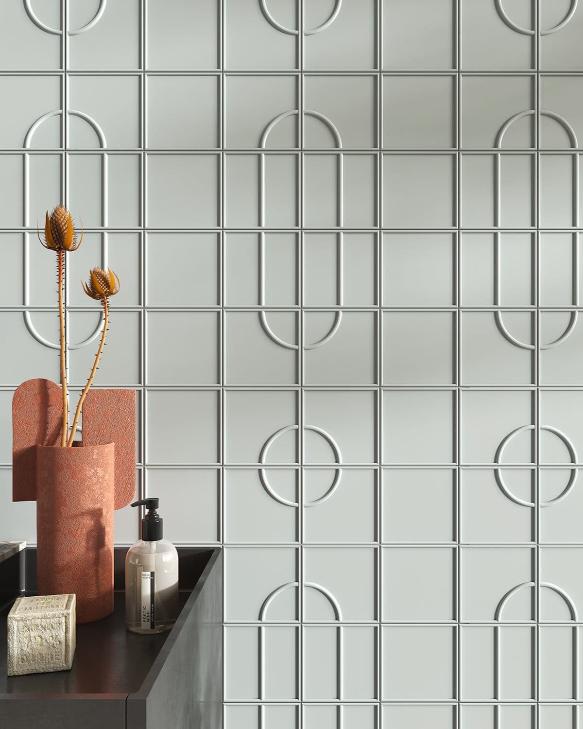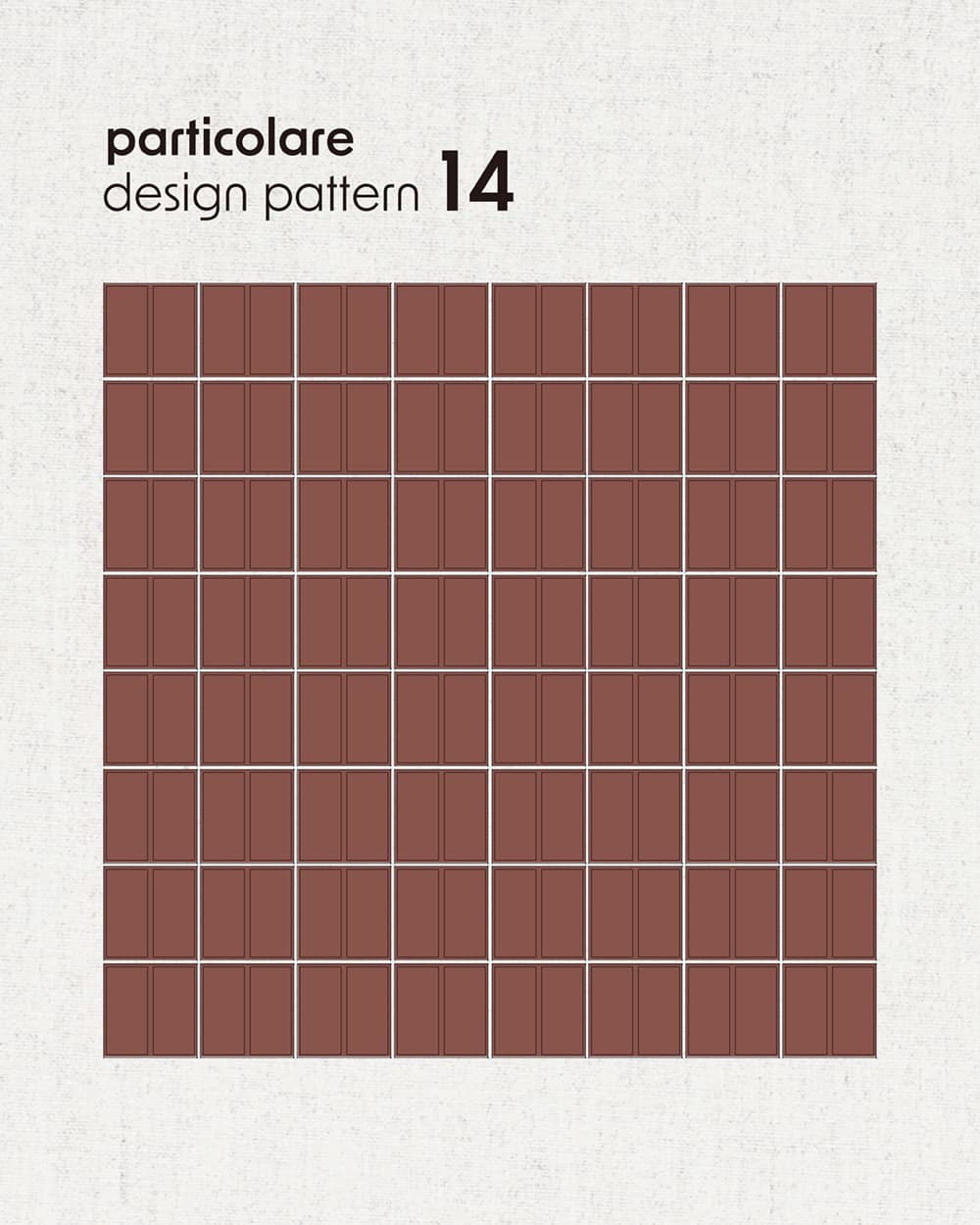 普遍的な美を求めた建築家パッラーディオが用いた構図操作──反復、対称、回転。その思想を壁面で端的に表現するのが「パルティコラーレ」です。124.5mm角のタイルに、Plain・Line・Curveの3種の立体フォルムを組み合わせ、スモーキーな色彩で展開。直線と曲線から生まれる陰影のリズムは、壁面をディテールからデザインし、クラシックなスタイルにもコンテンポラリーなスタイルにも調和します。新商品「パルティコラーレ/PARTICOLARE(=ディテール / イタリア語)」は、その名の通り、細部が全体の美を形づくることを具現化したタイルです。