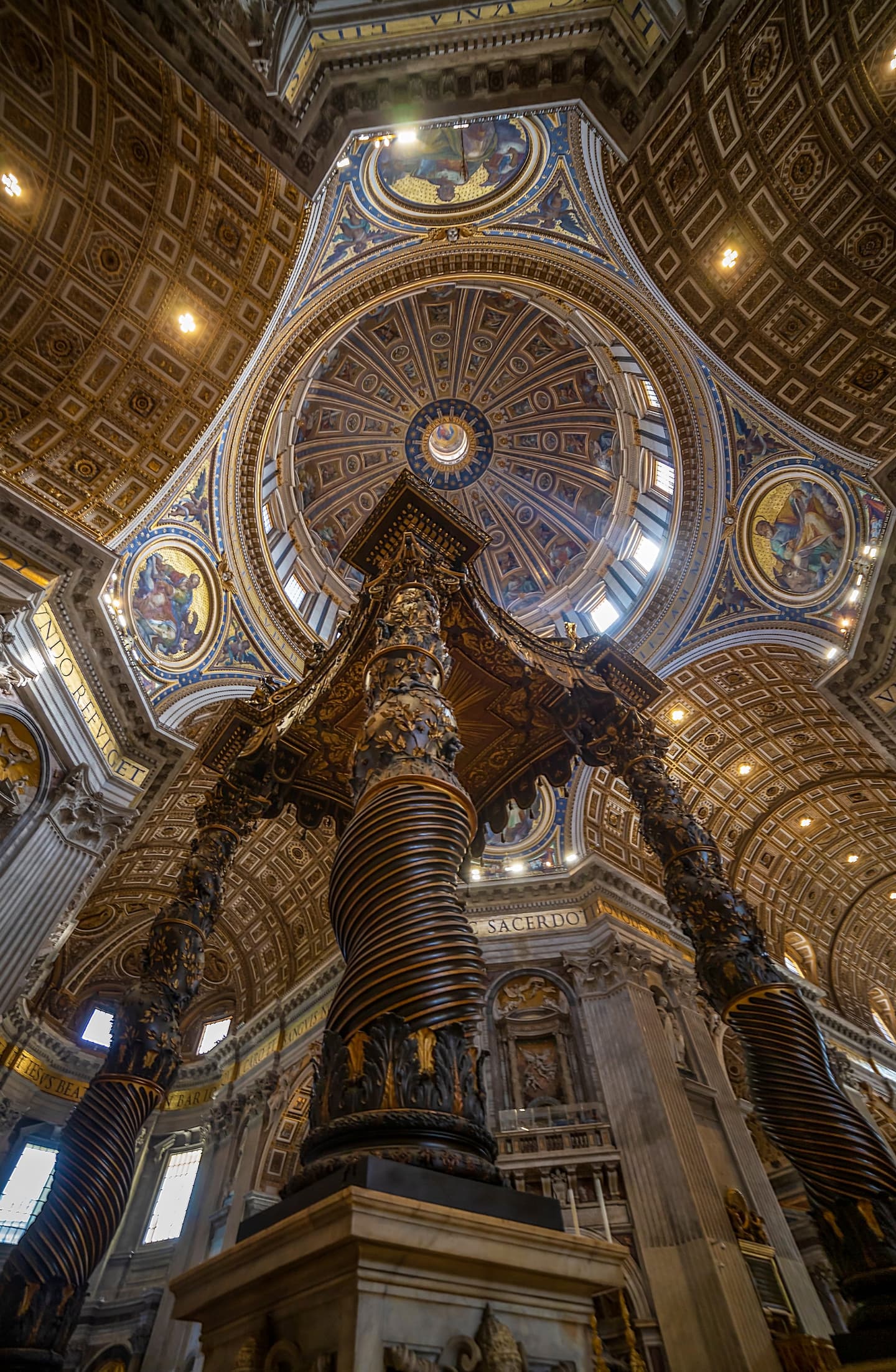 一方、時代が下り、バロックの天才ベルニーニは、デッサンに「感情が溢れ出すカタチ」を求めました。彼の素描は、筋肉の緊張や風になびく布の襞、そして苦悶や歓喜といった一瞬の情動を鋭く捉えることに特化しています。彼は、硬い大理石を、まるで柔らかな皮膚や布のように見せることに成功しました。代表作『ダビデ』は、投石器で石を放とうと身をひねる、その瞬間の極限の緊張感が、デッサンからそのままカタチとなった奇跡です。ミケランジェロが『ダビデ』を静的な英雄像として表現したのに対し、ベルニーニは動的な感情を刻み込み、見る者の心を激しく揺さぶったのです。この情熱は建築においても、建築と彫刻の境界を曖昧にすることで、空間全体を劇的な舞台へと変貌させました。その圧倒的な空間を象徴するのが、サン・ピエトロ大聖堂の内部に鎮座する『聖ペテロの天蓋(バルダッキーノ)』です。この巨大なブロンズ製の天蓋は、ねじれた柱が天に向かって螺旋を描き、見る者に動感と神々しさを感じさせます。これは単なる建築的装飾ではなく、大聖堂に宗教的メッセージとその物語を示す、巨大な彫刻作品なのです。ベルニーニは、デッサンに描く感情や物語を建築へと浸透させることで、人々の信仰心を視覚的に揺さぶる試みを行いました。