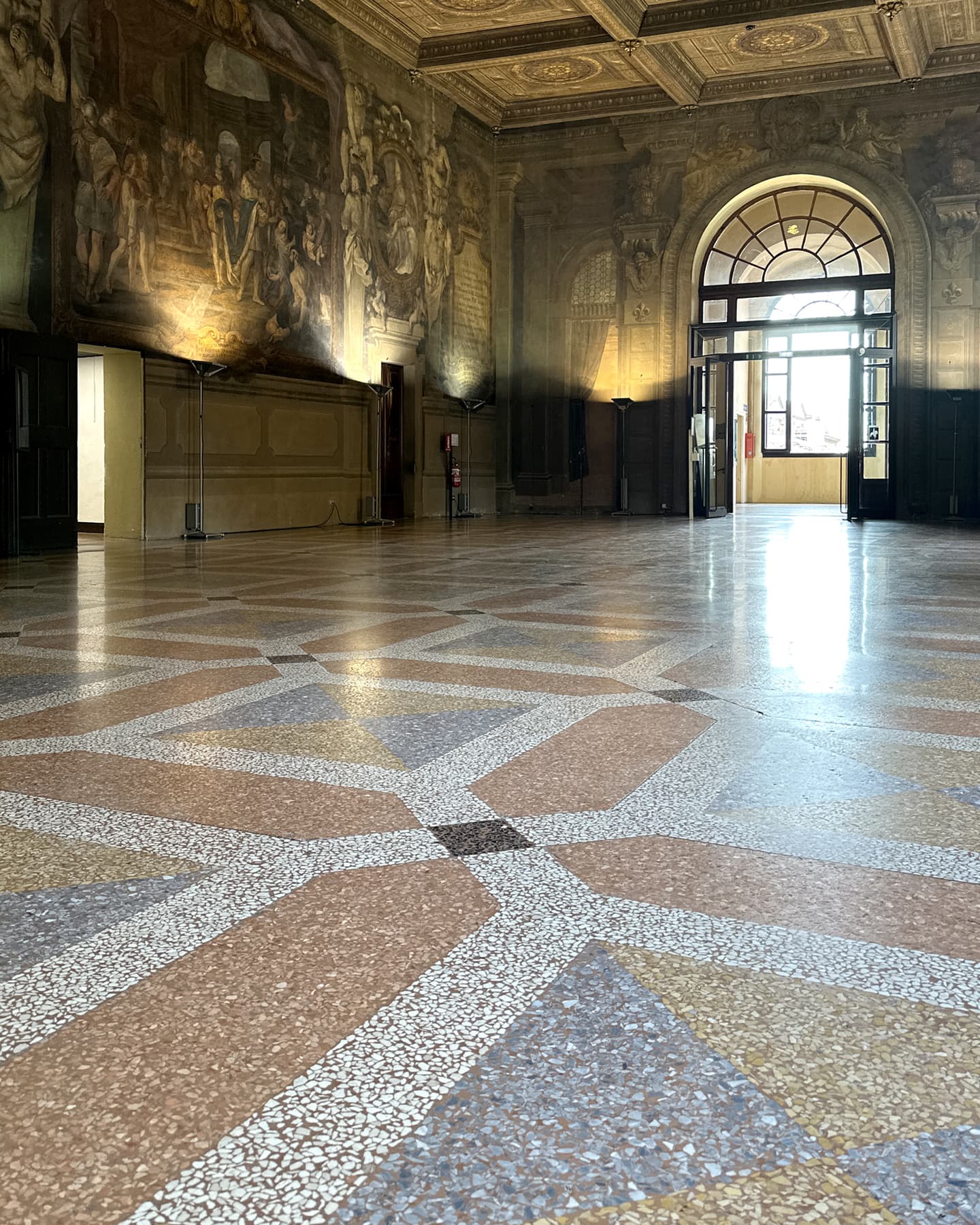 床にイタリア伝統のPalladiana(パッラディアーナ)様式が用いられている