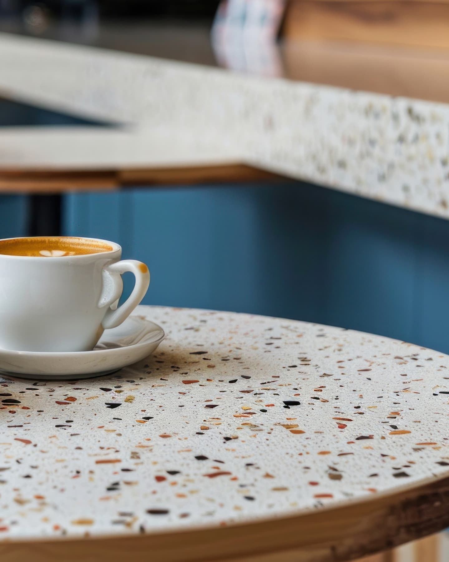 テラゾーが再び注目を集め始めたのは、2010年代の半ばごろのことです。その背景には、いくつかの文化的な潮流がありました。工業化された均質な素材に慣れた世代の間で、ヴィンテージやレトロといったテイストへの関心が高まった点もひとつの要因です。テラゾーの持つ不均一な骨材がもたらす有機的な表情、色が交じり合う偶発性は、その流れに応えるものでした。また、SNSの影響も無視できません。テラゾーの表情や、光の当たり方によって変化する色の深みは、写真映えする素材でもありました。Instagramを中心に、テラゾーを使ったカフェなどの写真が拡散し、世界中のデザイナーやインテリアファンの目に触れていくこととなります。