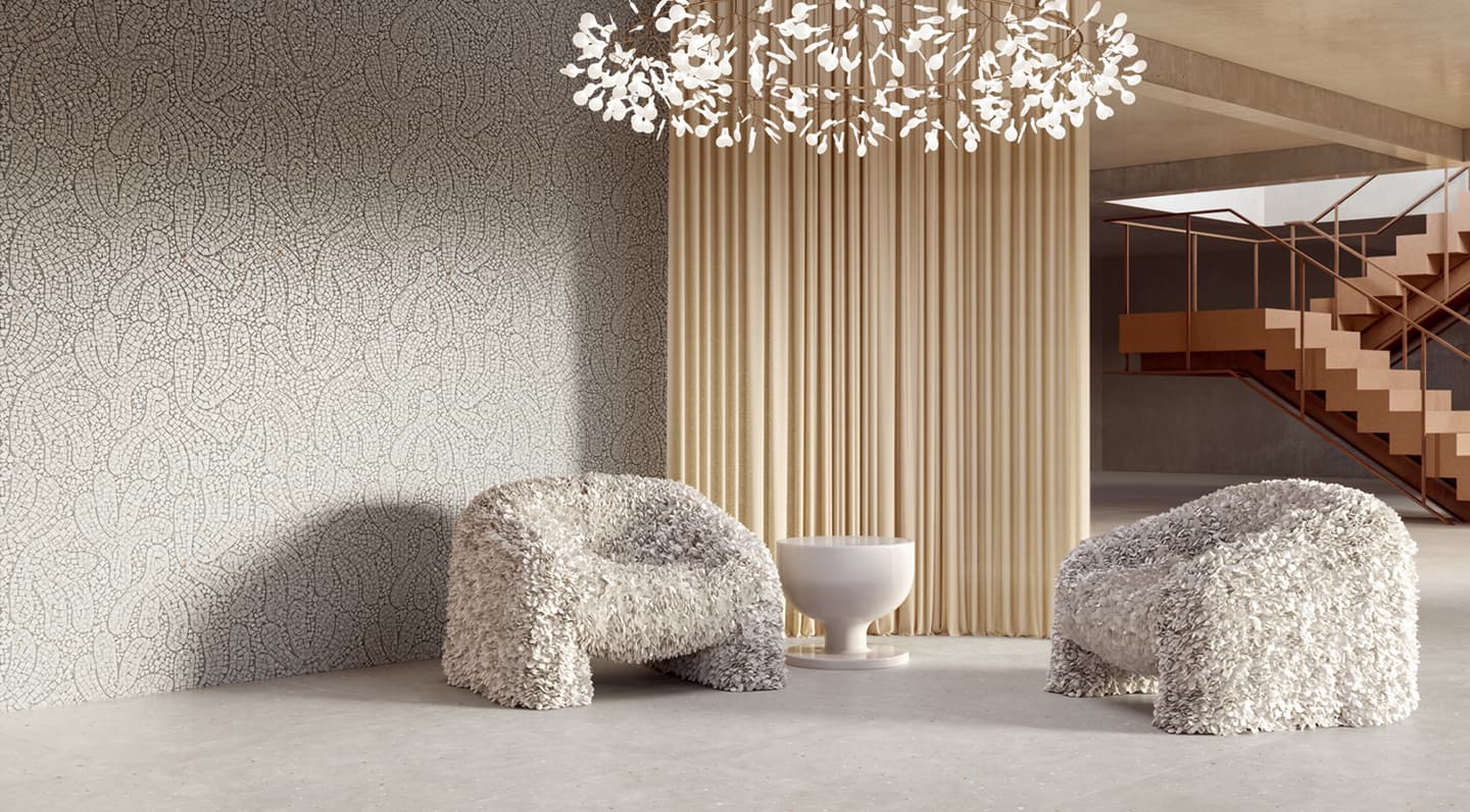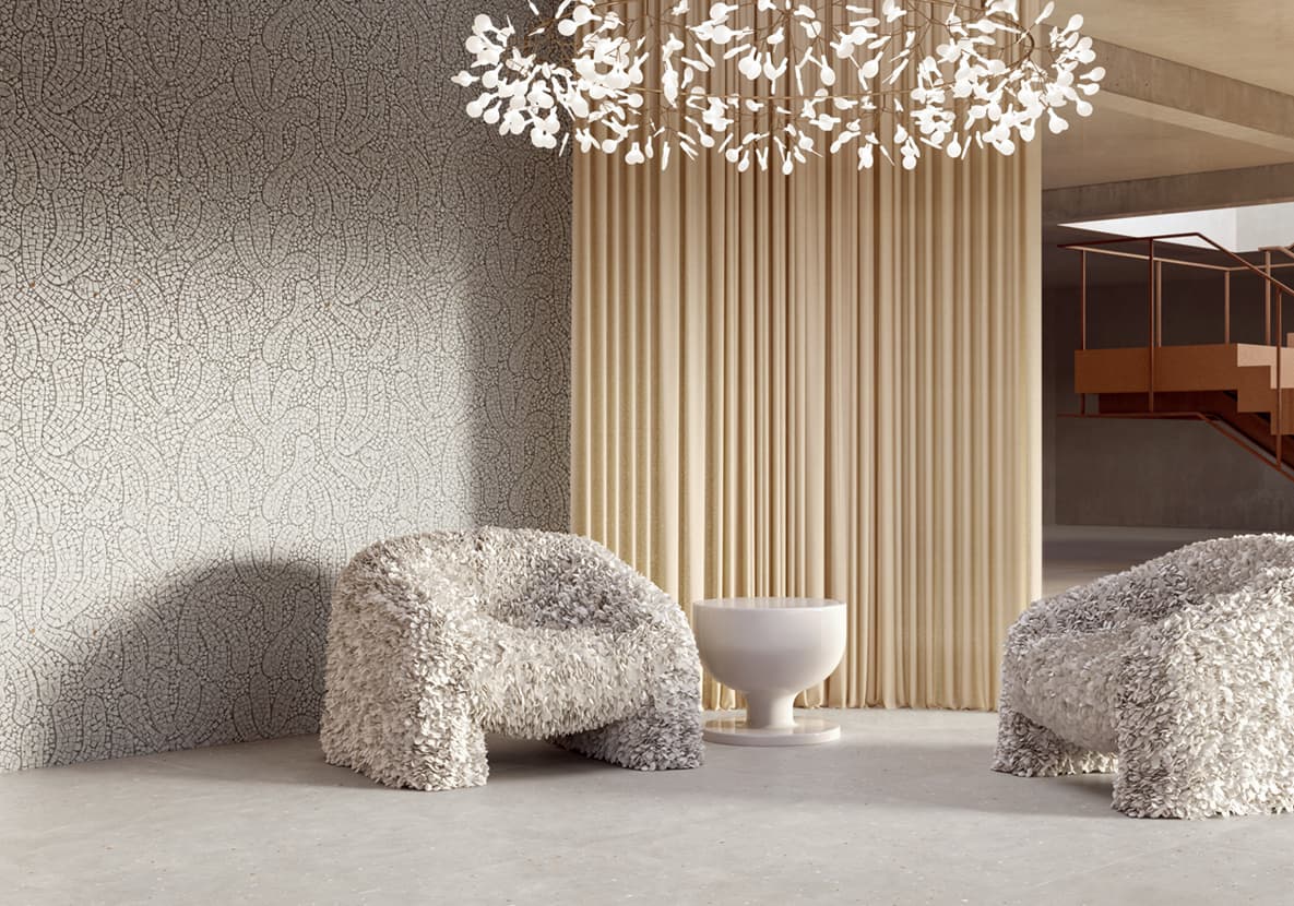 CERSAIE2025で、先進的な技術を誇るタイルメーカー「ABK」グループと、家具・照明・テキスタイルを手掛けるオランダの革新的なインテリアブランド「moooi」がコラボレーションし、セラミックタイルのコレクションを発表しました。それが、「ネスティングルーム」です。このコレクションは、ABKの先進技術とmoooiの中核となる価値観である「Unexpected(予期せぬ、意外な)」に基づくデザイン哲学が融合して生まれました。単なる建材ではなく、建築空間の“面”を物語のあるキャンバスへと変える、アートピースのような存在を想定して開発され、日常の中にアートと静寂が共存する特別な「空気感」をもたらします。