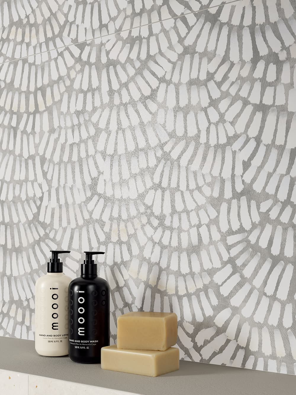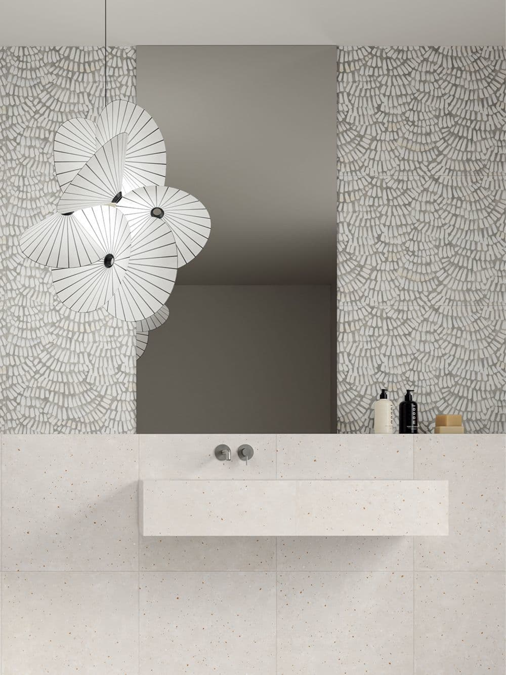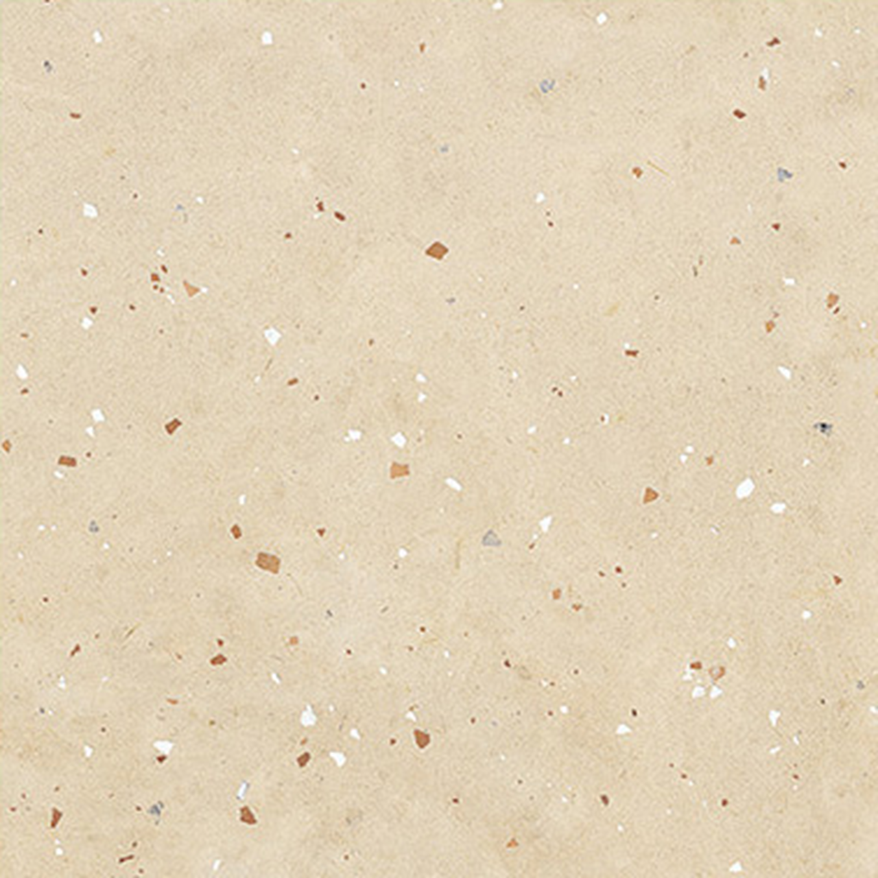 4つのシリーズの中で、CERSAIE2025のテラゾートレンドを最も体現しているのが「エッグスケープ(Egg Scape)」です。卵の殻──それはテラゾーの本質と重なります。テラゾーが廃材の断片をモルタルに埋め込んだ素材であるように、卵の殻もまた、無数の小さな結晶が有機的に積み重なった複合体です。均質ではなく、どこか偶発的な美しさを持ち、傷や亀裂が入ることで初めてその内側の構造が見えます。「エッグスケープ(Egg Scape)」は、その感覚をタイルの表面に写し取っています。繊細な擦れや亀裂のようなテクスチュア、そしてテラゾーを思わせる小さな断片。自然界の「不完全さ」を捉えたミニマルな表情には、見る角度や光の当たり方によって印象を変え、長く使い込むほどに味わいが増していく奥深さがあります。「完璧ではないことが美しい」という感覚は、日本の美意識とも深く通じます。わびさびの思想が「不完全さの中に美を見出す」ことを問うように、「エッグスケープ(Egg Scape)」も欠けや割れ、擦れを否定せず、むしろそれを素材の美しさとして取り入れています。カラー展開はIvory・Powder・Hay・Concreteの4色で、自然光の中で最も落ち着いて見える色調です。Ivoryは朝の光を受けた白い殻、Powderはくすんだやわらかさ、Hayは干し草のように乾いた温もり、Concreteは工業的なグレー。どれも強く主張する色ではなく、空間に静かに溶け込むことから、キッチンや洗面室といった小さな空間でも使いやすいデザインです。