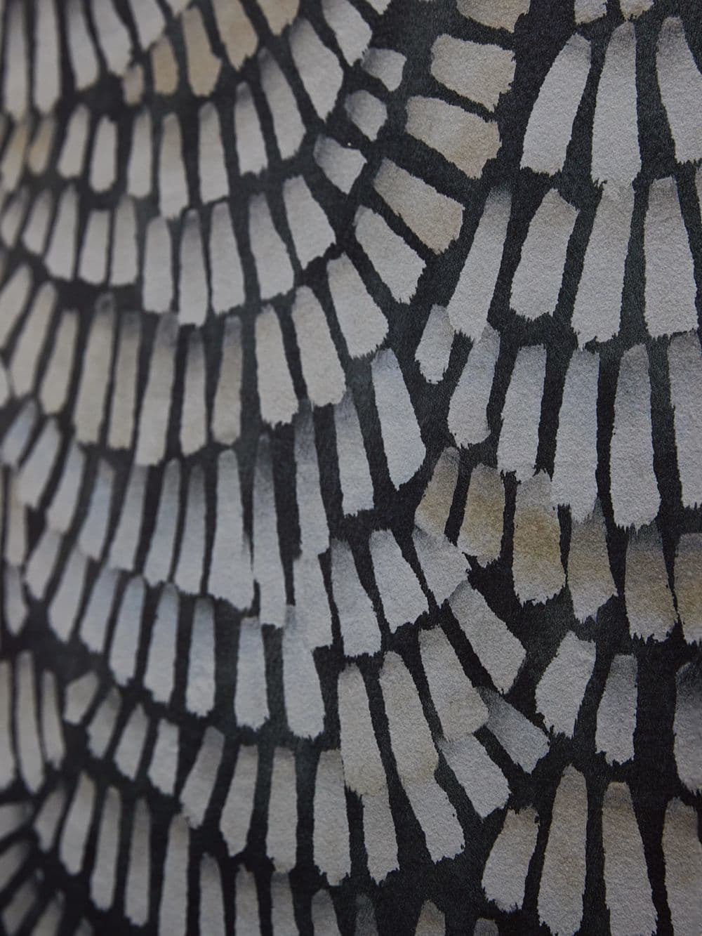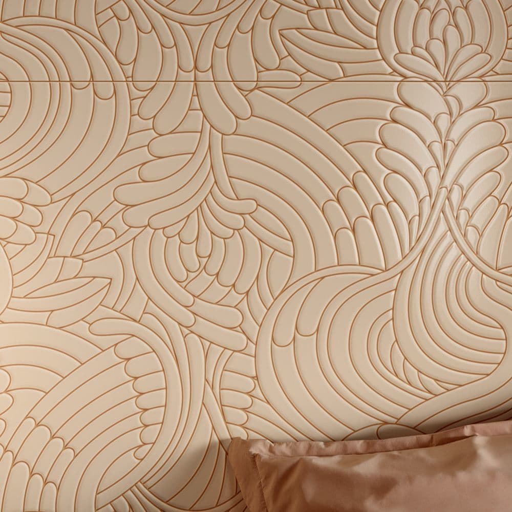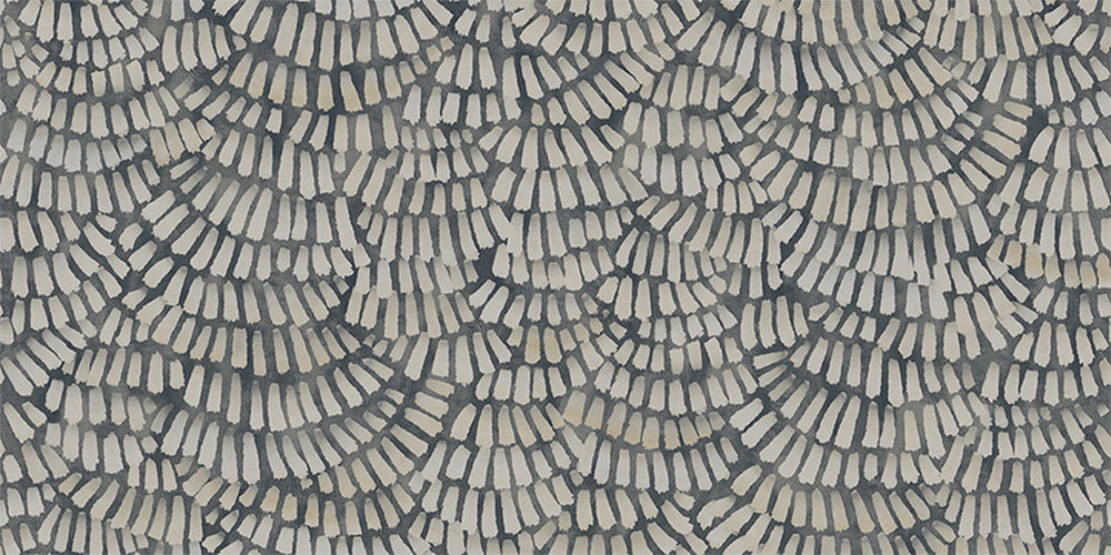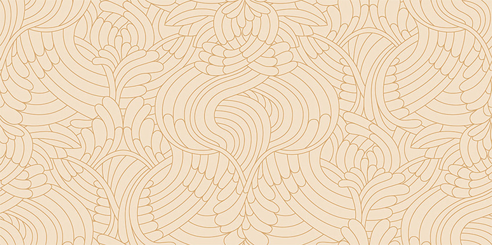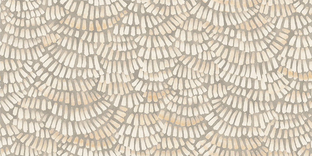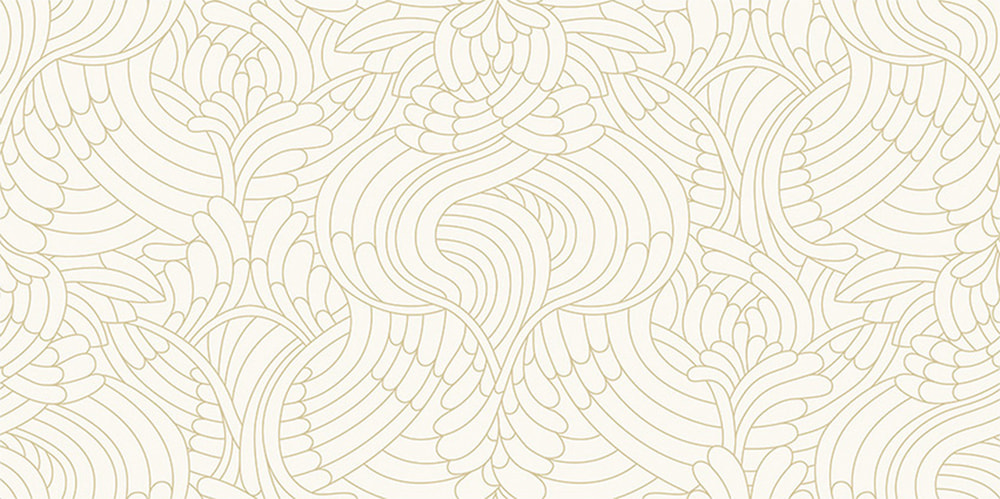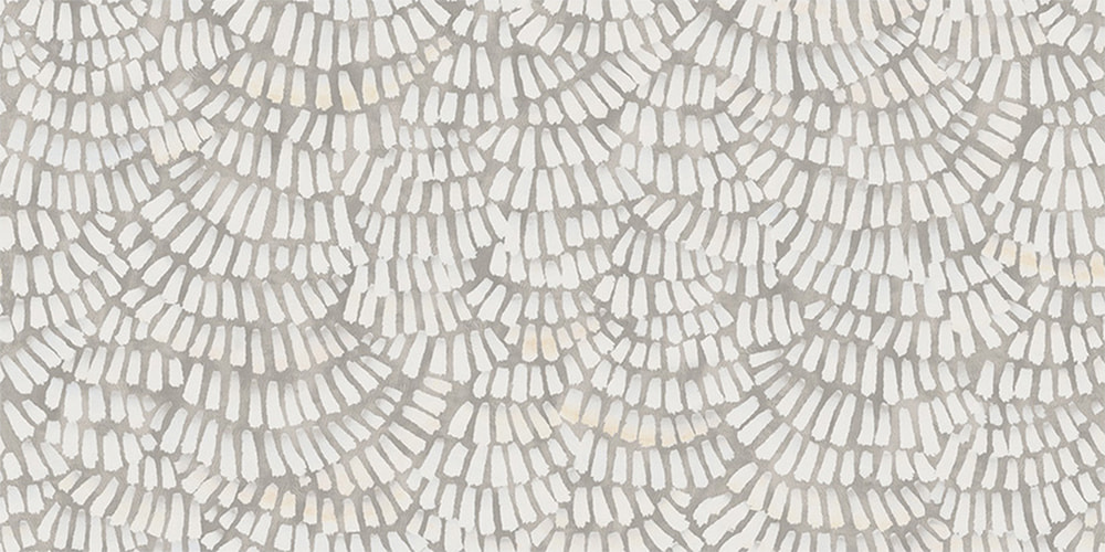 「プリュマージュ(Plumage)」は、フランス語で「羽毛・羽根の集まり」を意味します。「パヴォーネ(Pavone)」が羽根の凹凸を触覚で語りかける素材であるとするならば、「プリュマージュ(Plumage)」は羽毛のような軽やかさを視覚に語りかける素材です。表面は平滑な仕上げで、装飾的なパターンが凹凸なく艶の違いで描かれています。「パヴォーネ(Pavone)」は触覚のタイル、「プリュマージュ(Plumage)」は視覚のタイル──同じ「羽根」というモチーフを扱いながら、異なる質感を持つこの2つのシリーズは、触れることと見ることの両方から、羽根という自然の造形の豊かさを感じることができます。「プリュマージュ(Plumage)」のカラー展開は3色で、サイズも「パヴォーネ(Pavone)」同様に1200×600角の受注輸入品となります。