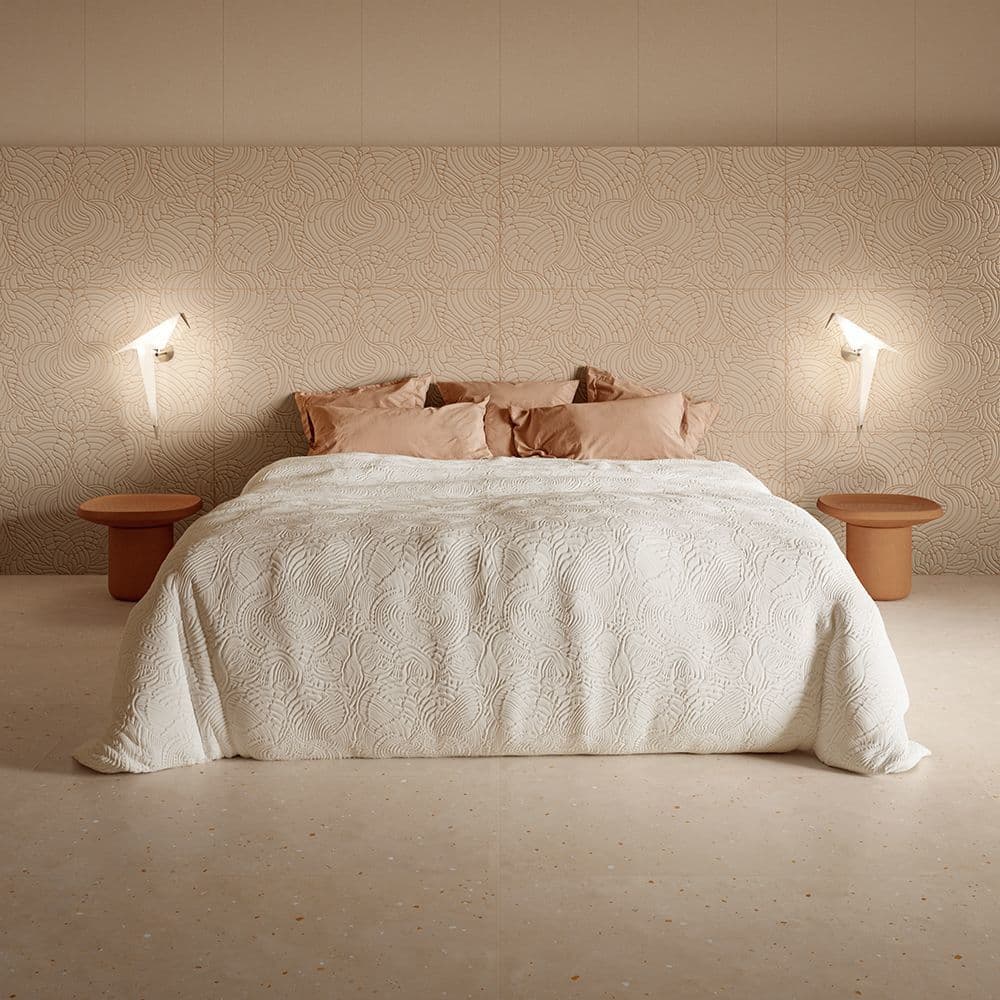 「ネスティングルーム」を構成する4つのシリーズは、それぞれが異なる表情を宿しています。テラゾーが放つ有機的で不完全な美しさ。砂浜の記憶を写し取った、均質で繊細な粒子感。指先から伝わる3Dテクスチュアの豊かな触覚。そして、羽毛を思わせる視覚的な軽やかさ ──。これらは決して個別に存在するのではなく、「ネスティングルーム」という一つの世界観のもと、互いの個性を補い合い、響き合うことで完成しています。一日の終わりに安堵のため息をつくとき、あるいは扉を開けて新たな空間へと足を踏み入れたとき。その一瞬に、心がふっと軽くなるような場所でありたい。「静寂の聖域」という名を具現化したこのコレクションには、人々の心に寄り添い、安らぎを供する穏やかな願いが込められています。
