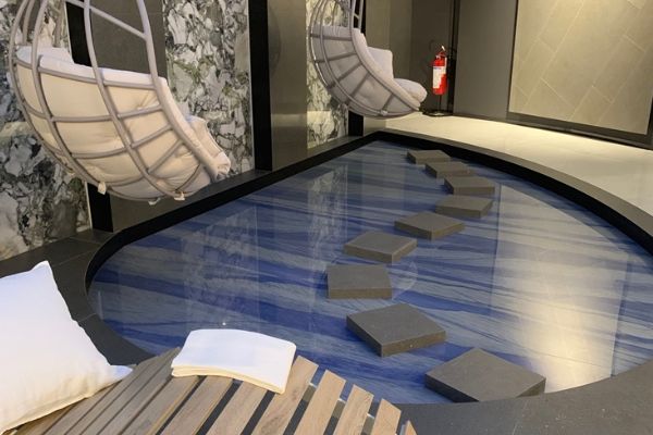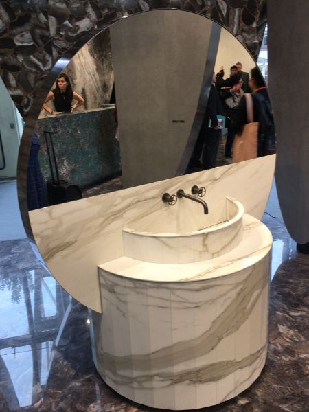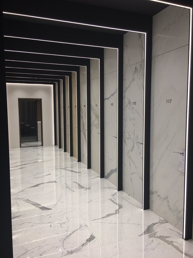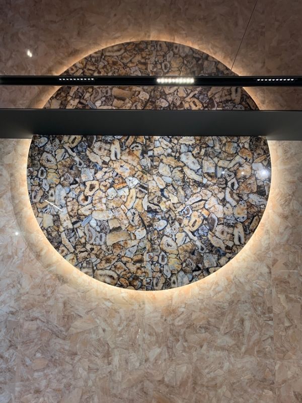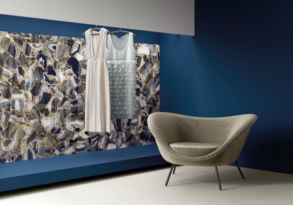 例えば「マルミマキシマム・アガタ(Marmi Maximum series AGATA)」は、希少な瑪瑙(メノウ)の縞模様を強烈な装飾的要素として、単に「張る」だけの化粧材料としての領域を超えています。数年前までは、瑪瑙(めのう)のような宝石の装飾が建具や家具の造作材料になるなど、誰が想像できたでしょうか。今までになかった、全く新しいインテリアやアウトドアへと想像の可能性が無限に広がっていきます。このような大胆なタイルを、どのように使えばよいのでしょうか?