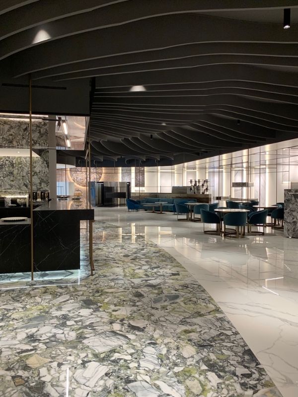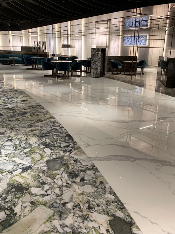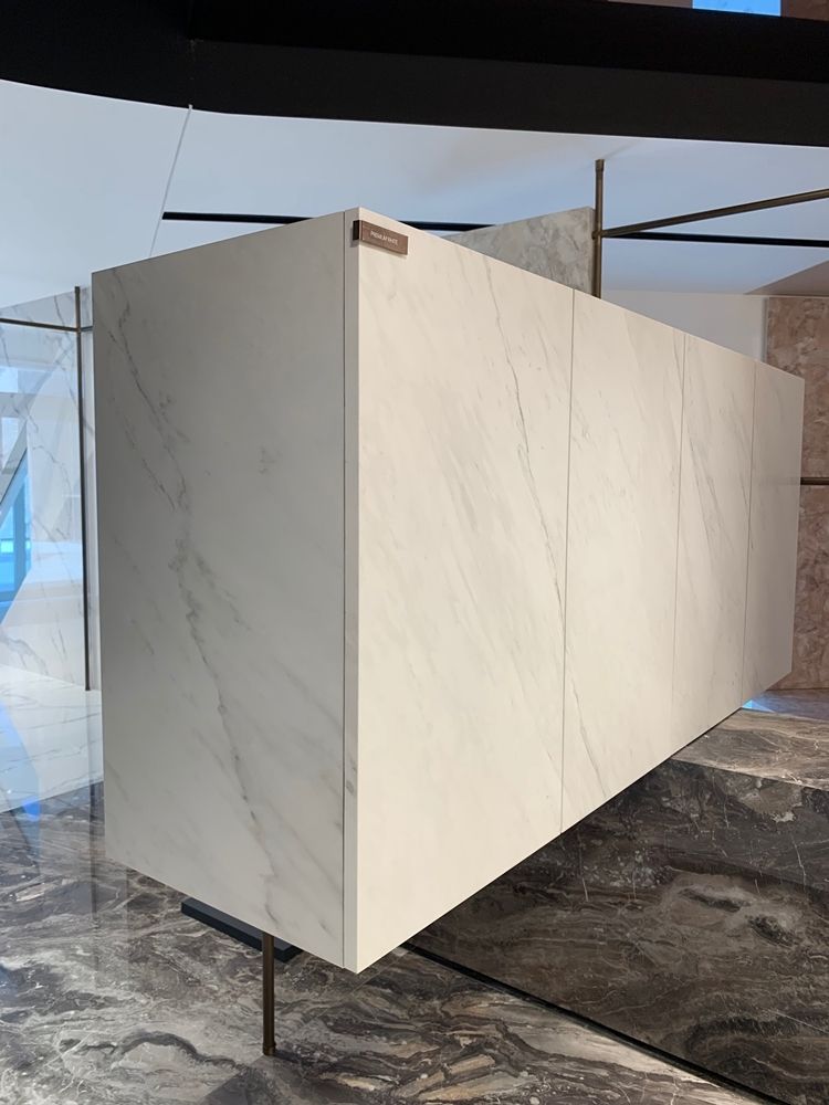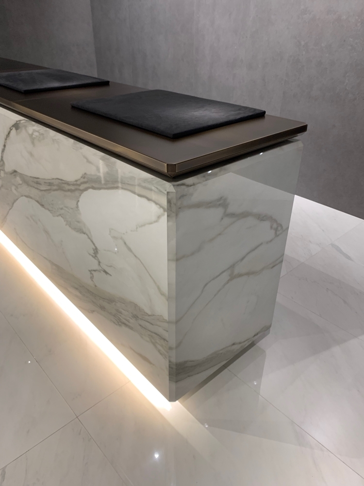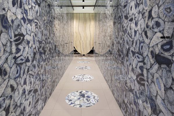 昨年オープンした東京の渋谷スクランブルスクエアの「スタージュエリー」では、アラベスカート・オロビコ(Arabescato Orobico)に高度な加工を施し、宝石を飾るショーケースとして美しく仕上げられています。タイルによる、非常に優れたデザイン家具什器の最新例です。