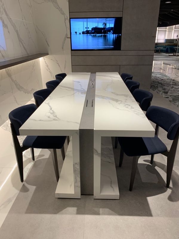 カラカッタ・スタチュアリオ 4608P・8Pの会議用デスク(左)とプレミアムホワイト 4660P・60Pの棚什器(右)。