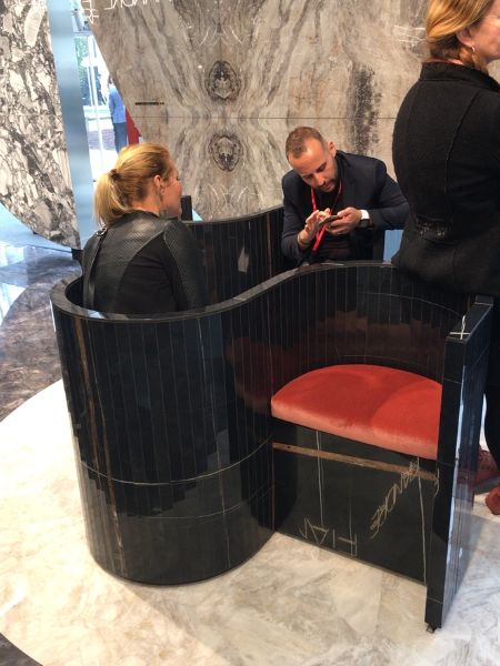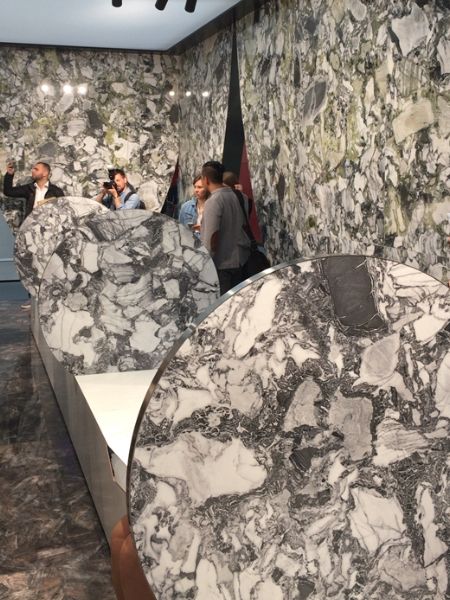 ソリッド・ドレープとは、硬いカーテン素材という意味で、セラミックタイルの表現力を強調するために、大型のフォーマット(3002×1500×6mm)を活かして、船の帆のようなカーテンをモチーフとした造形です。硬質のタイルを柔らかなカーテンとして表現した、対照的な感覚のデザインが秀逸です。また、このブースでは、垂直面と水平面から構成される壁や床だけでなく、本箱、ベンチ、対面の座席、コーヒーテーブル、会議用テーブル、シャンデリアなど、タイルを材料とした様々な特注家具を提案しています。