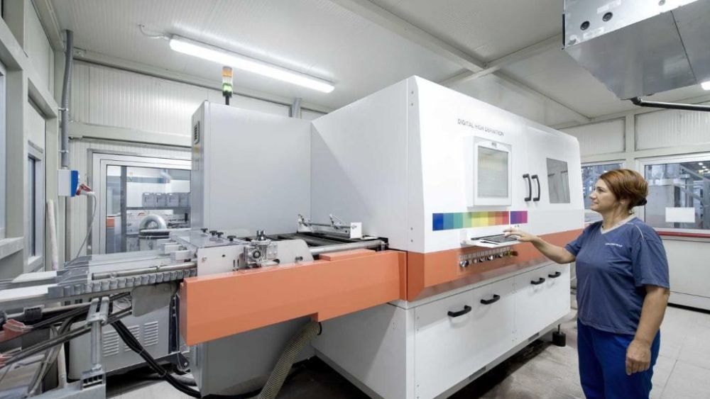 もう一つのデジタル装飾は、微細なパウダー状の粘土を画像解析通りに敷き並べて模様にする設備です。液体ではないので、デジタル・ドライ・デコレーション(Digital Dry Decoration)と呼びます。