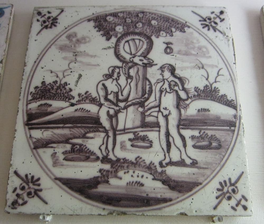 マジョリカタイル:六角形と約200mm角「楽園追放」のアダムとイブ(モデナ市民博物館)