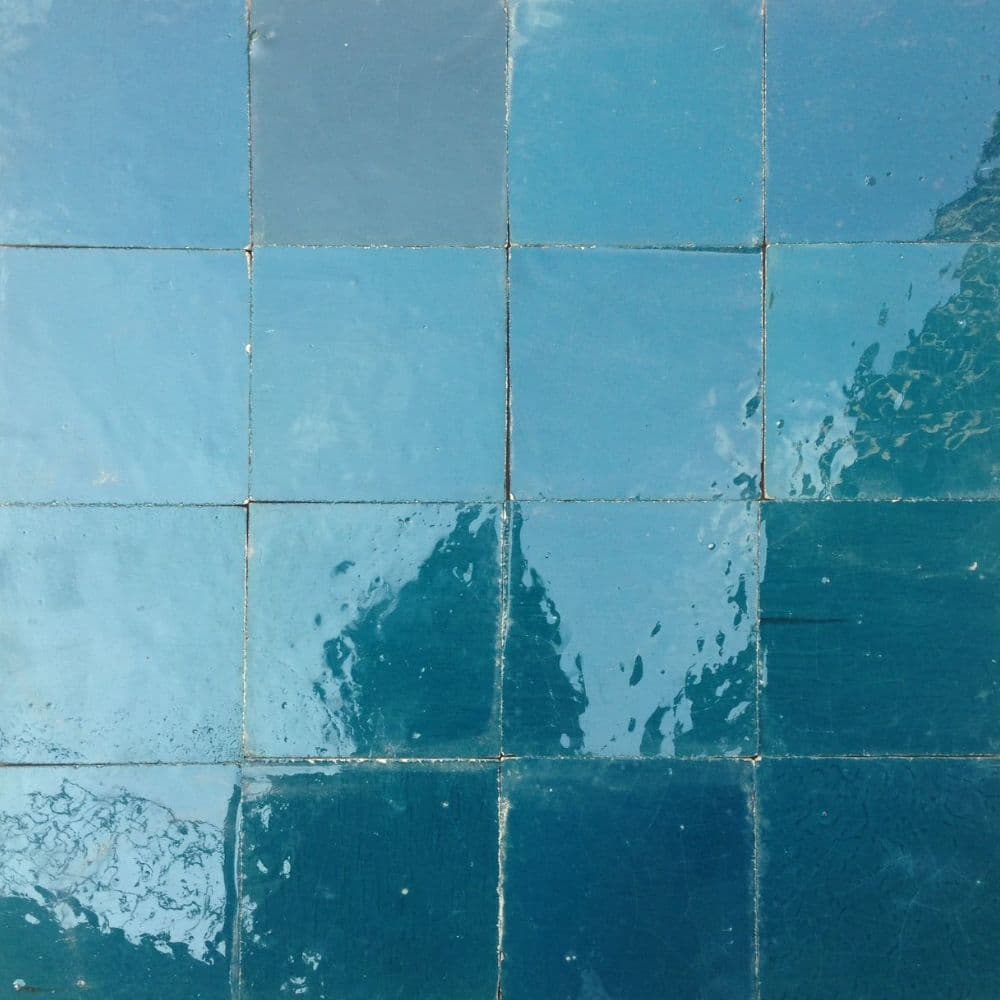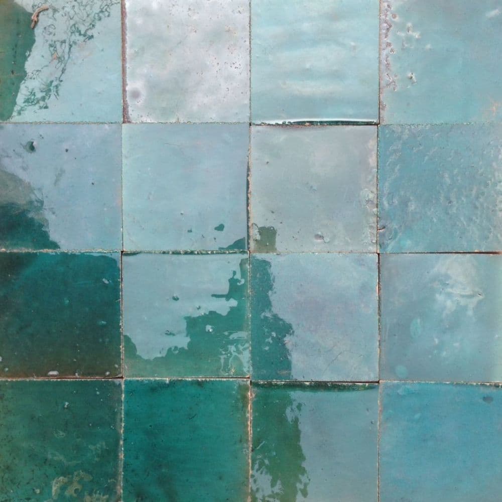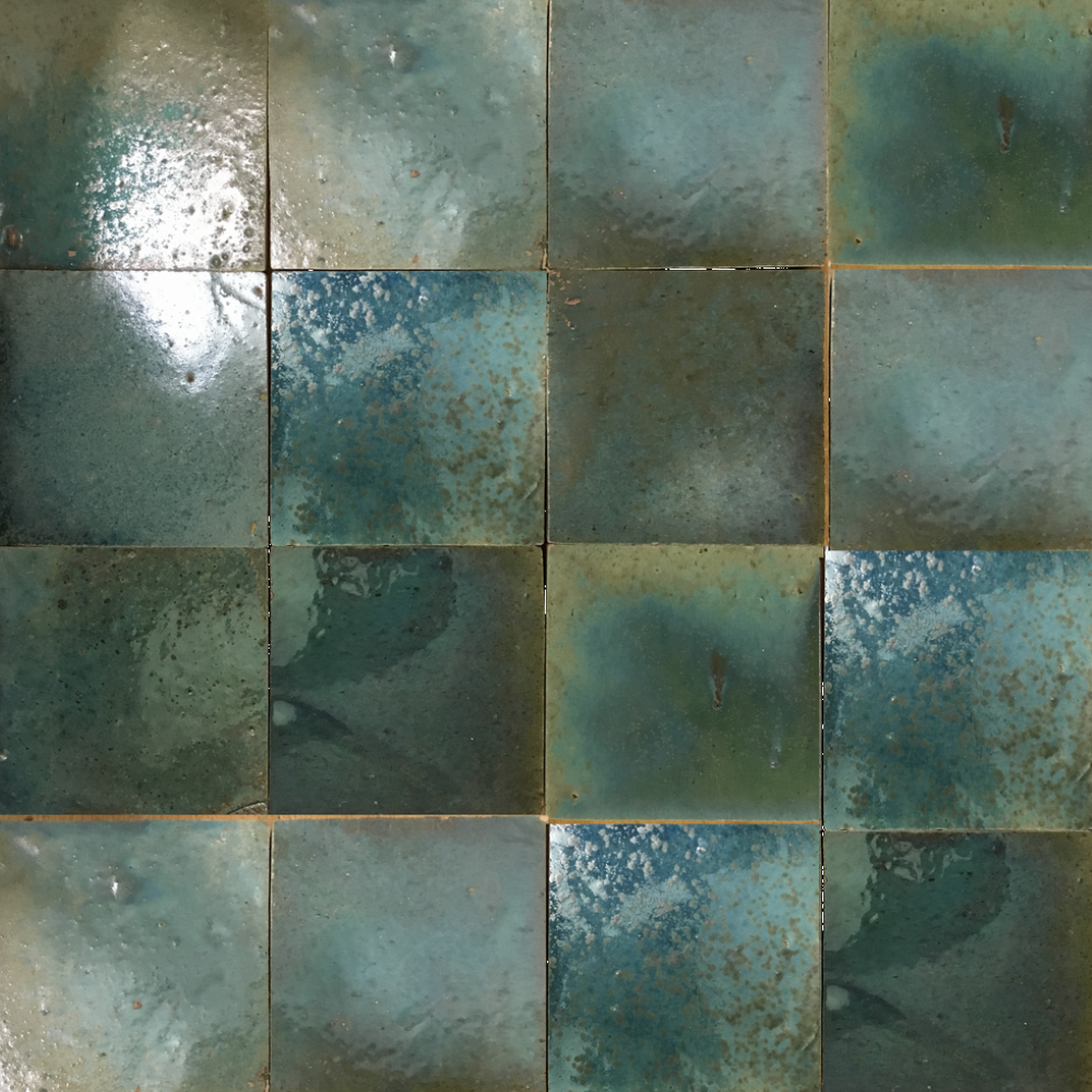 ゼリージュタイルは、鮮やかで奥行きのある色彩と、火の廻り具合で自然にできる激しい色むらがあり、釉薬のツヤが光の反射で微妙に変化して見えるのが特徴です。伝統的な手作業で成形し、登り窯や穴窯を使い800℃程度の温度で焼成するので、高温焼成(1200℃超)のタイルより、材質が柔らかく、表面に不純物が混じることもあります。形状もプレス成形のタイルと比較すると著しく不規則ですが、それが魅力となり現代の製法では絶対に再現できない、工芸品のような味わいを持ちます。本来は、イスラム圏の建築における典型的なアート装飾の素材として、熟練の職人が芸術ともいえる技法で割って様々な柄を生み出すものですが、欧米向けに、小さな正方形タイプもあります。