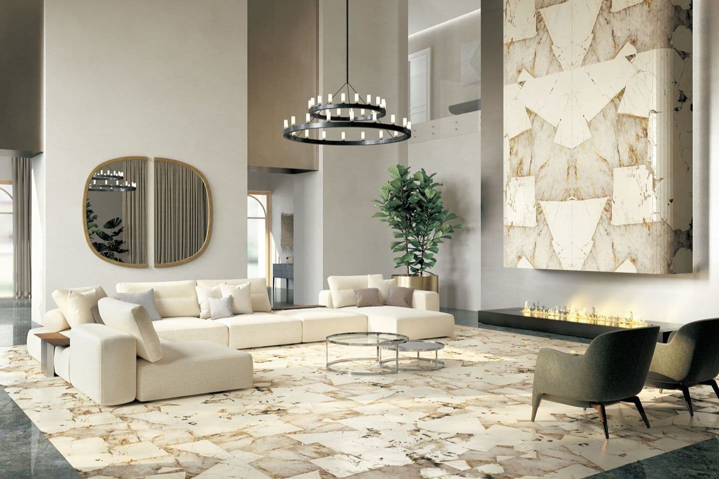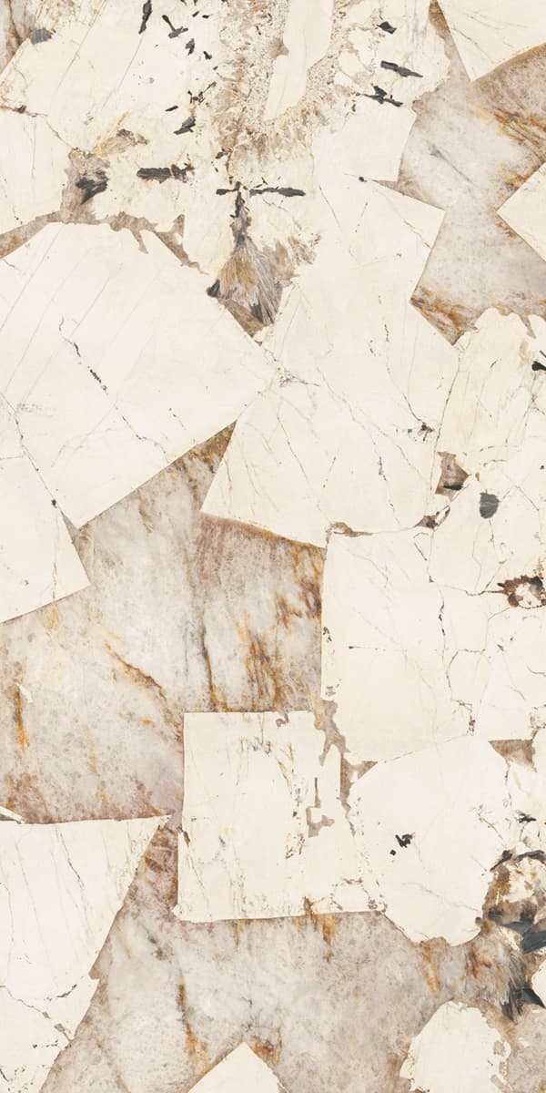 パタゴニアはブラジルが原産の大理石で、自然界に存在する最も特殊で景観的な天然石のひとつです。不規則に結晶化した幾何学的な模様が特徴で、大判のセラミックスラブ全体でダイナミックなパターンを表現しています。