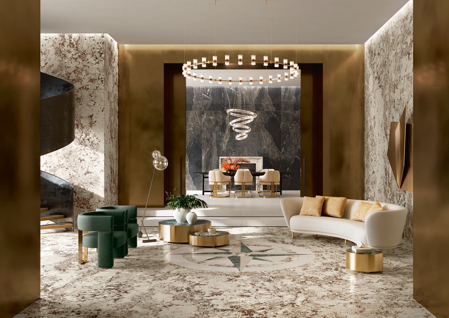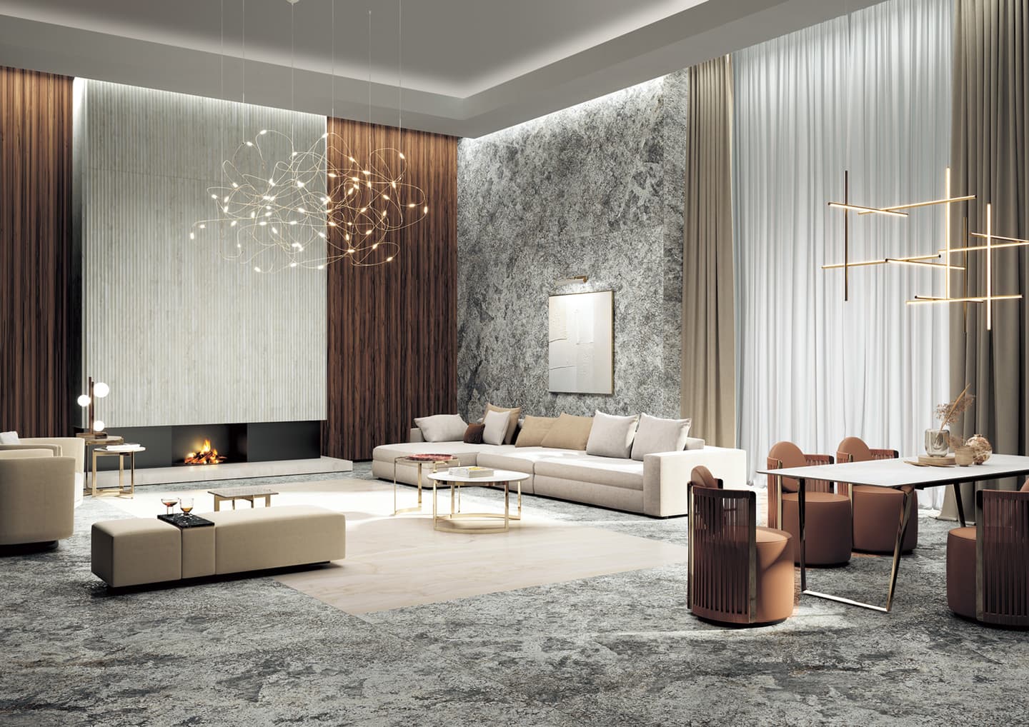 3D効果で奥行きを表現する表面仕上げの技術は、精巧な石材の加工プロセスから刺激を受けて開発されたものです。複雑な天然石の模様と革新的なテクスチュア表現は芸術的なまでに美しく、しかも現代的で大胆なデザインが見る人を圧倒します。