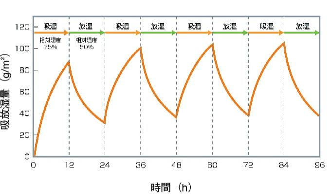 エージープラスは5ナノメートル(1ナノメートル=100万分の1mm)以下の細孔を多く含んでいます。分かりやすく言うと、エージープラス1㎡(11枚)の表面積は、およそ140万㎡(東京ドームのグランド100個分)になります。このため、湿気を素早く吸収・放出し、適度な湿度を保ちます。特に、エージープラスはひとが快適に暮らせる「中湿域」(相対湿度45∼75%)で調湿性能を発揮します。この調湿性能により、夏場など室内の湿度が高いときは吸湿して湿度を下げ、冬場など湿度が低いときは放湿して湿度を上げて、ひとが快適に暮らせる環境づくりに貢献します。