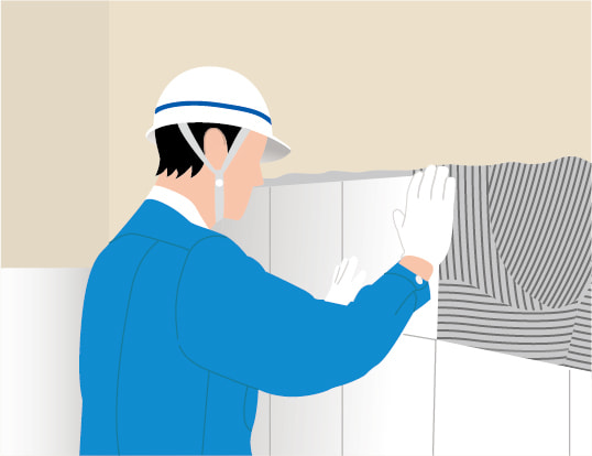 - 同一壁面で下地の種類が異なる場合、ジョイント部とエージープラスの目地をあわせるか、ジョイント部をグラスファイバーテープとパテ材で補強した後、エージープラスを張付けてください。