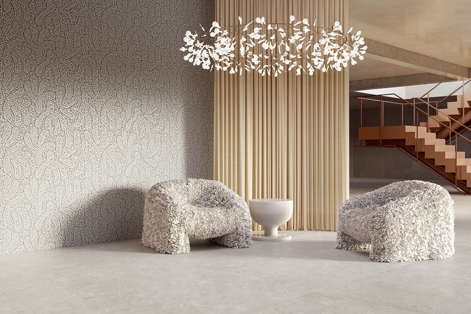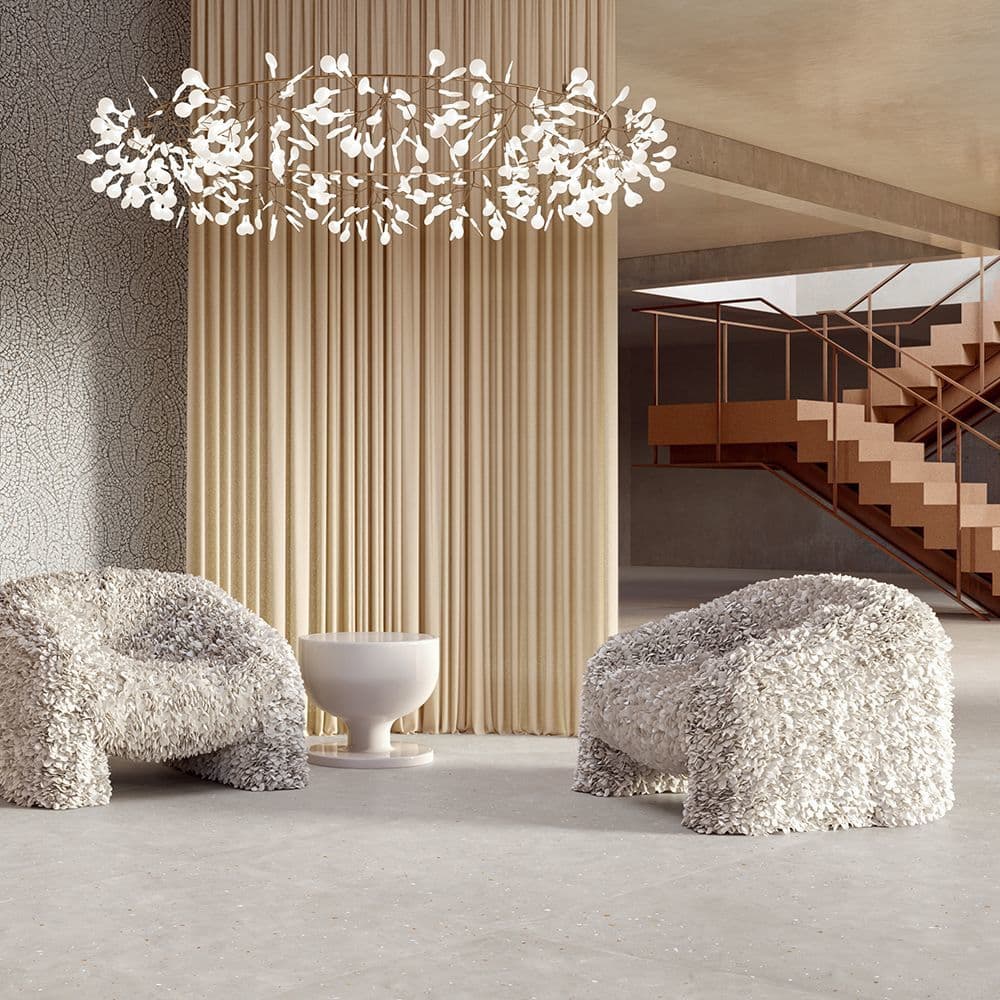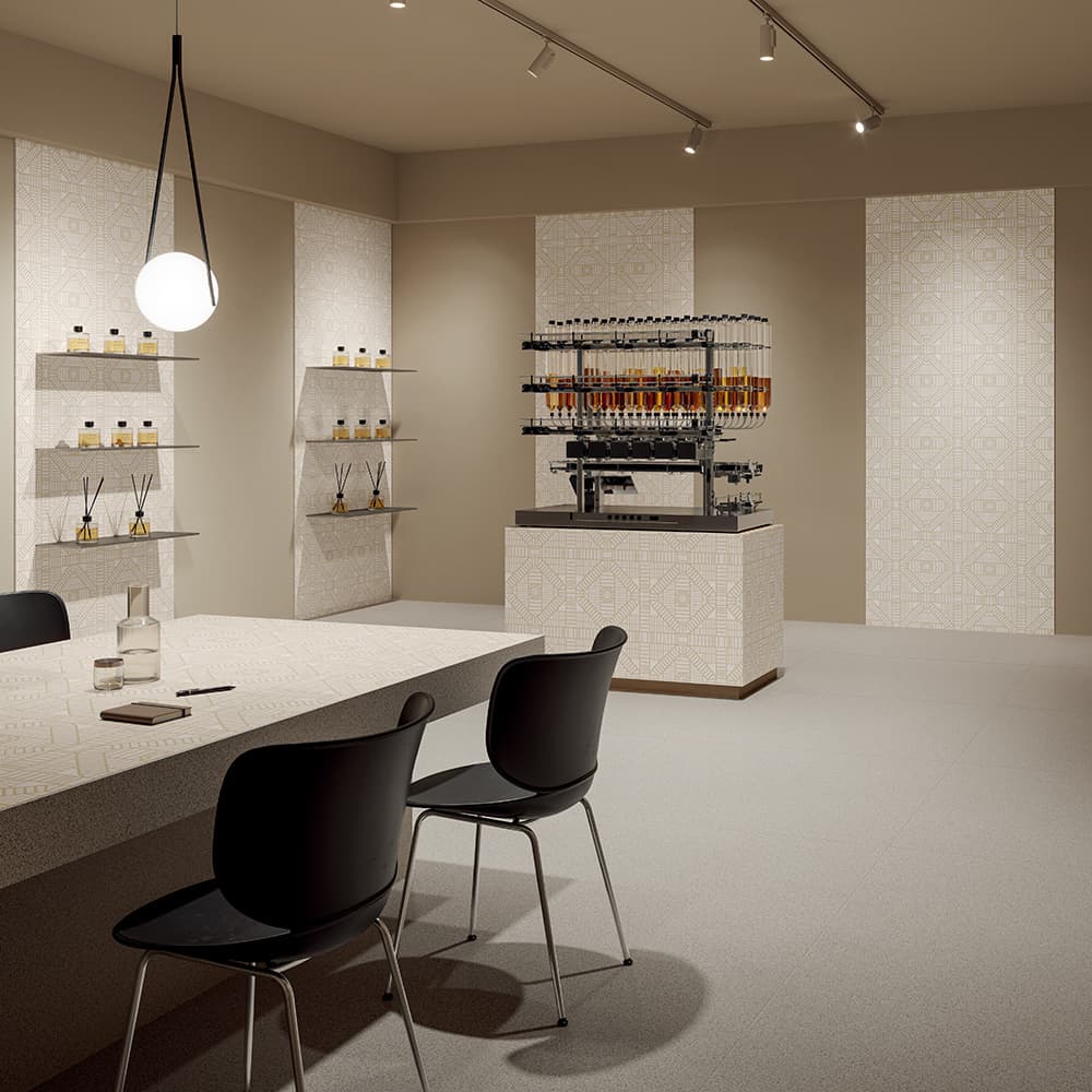 先進的な技術を誇るタイルメーカー「ABK」グループと、家具・照明・テキスタイルを手掛けるオランダの革新的なインテリアブランド「moooi」のコラボレーションによるセラミックタイルのコレクションです。ABKの先進技術とmoooiの中核となる価値観である「Unexpected(予期せぬ、意外な)」に基づくデザイン哲学が融合して生まれました。このタイルは、単なる建材ではなく、建築空間の “面” を物語のあるキャンバスへと変える、アートピースのような存在を想定して開発され、日常の中にアートと静寂が共存する特別な「空気感」をもたらします。
