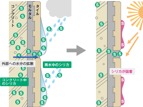 レンガや吸水の多い無釉タイルに限り発生する現象で、裏面のモルタル、セメントから水分が染み出し、この中に溶け込んでいた物質が表面で乾いて付着してしまうものです。これは水に容易に溶け、水洗いで除去できますが、またすぐに発生します。通常は2∼3年でタイル内の細孔がふさがり、発生しなくなります。冬場の北側壁面でよく発生します。粉吹きを水洗いで除去した後、タイル表面が乾いたらシリコーン系撥水剤を塗布することが有効です。 |